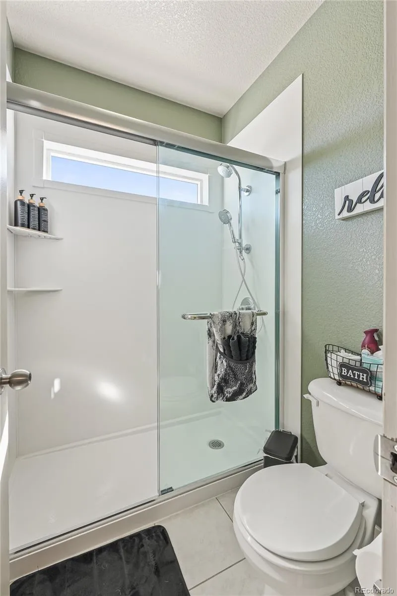 An En Suite on the opposite end of this ranch style home with granite and upgraded bathroom with stunning tile.