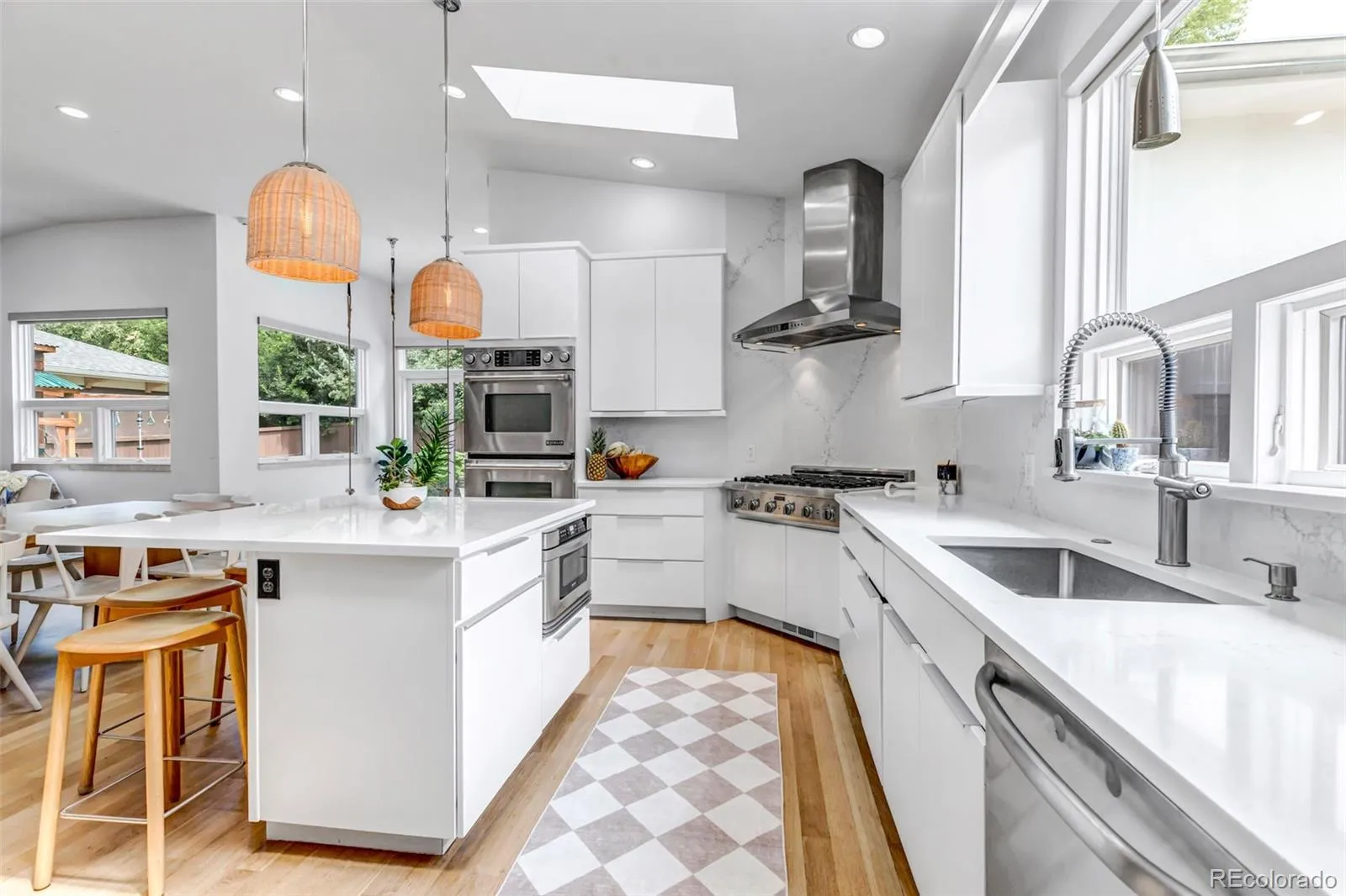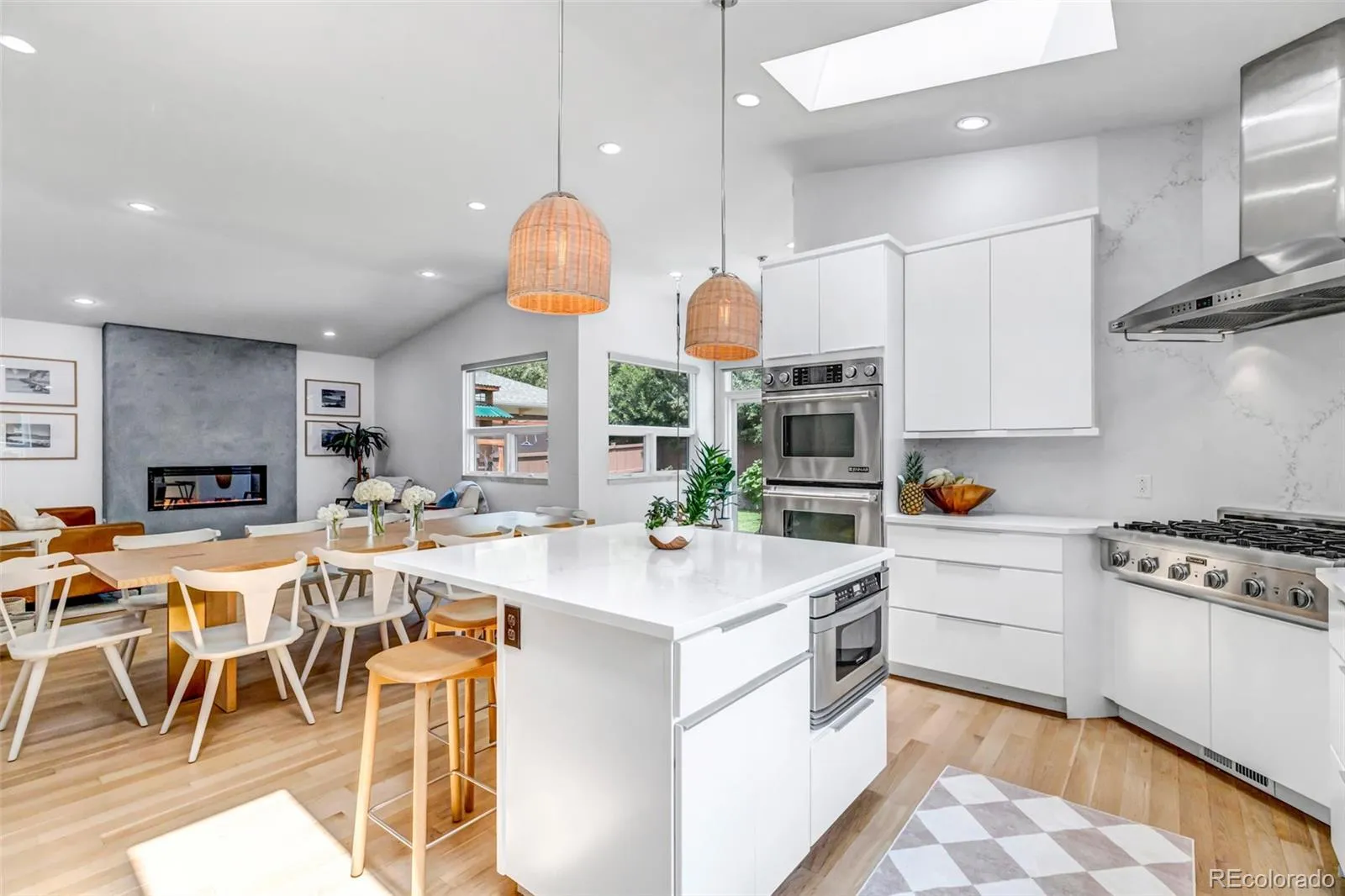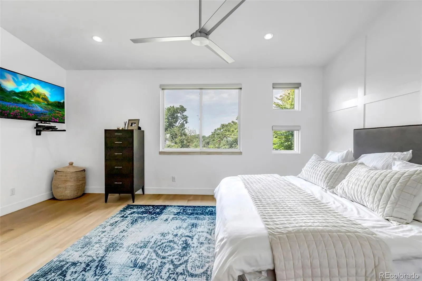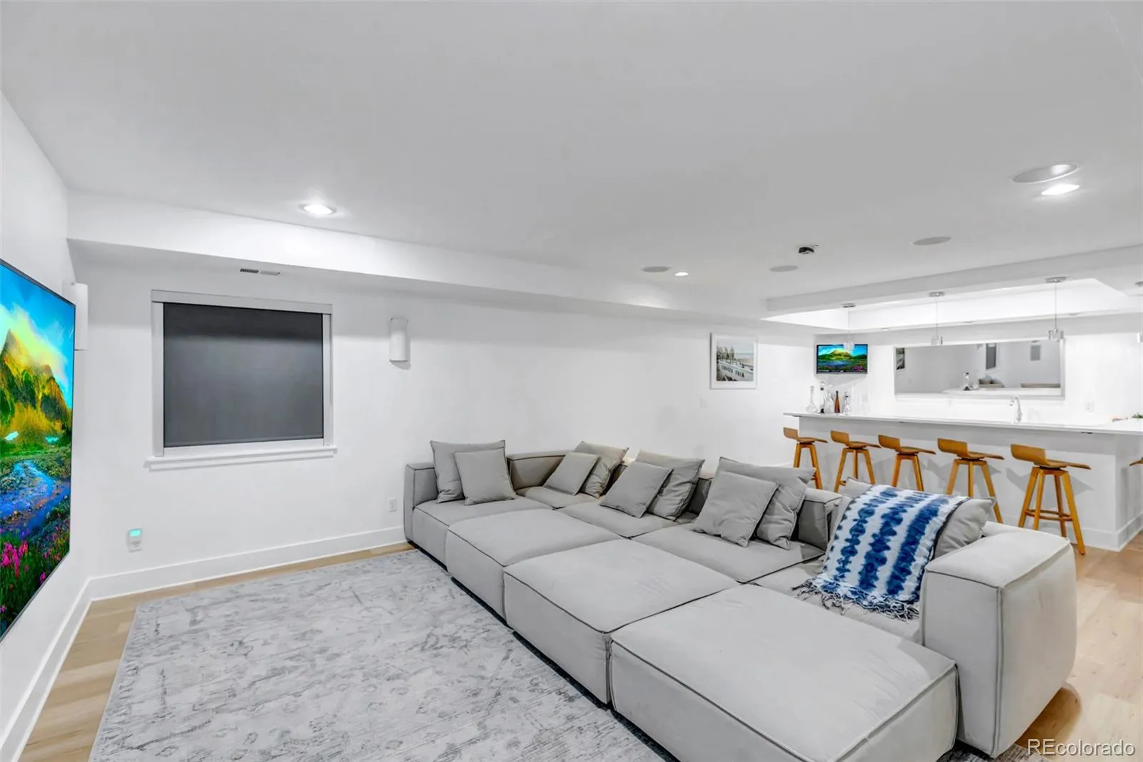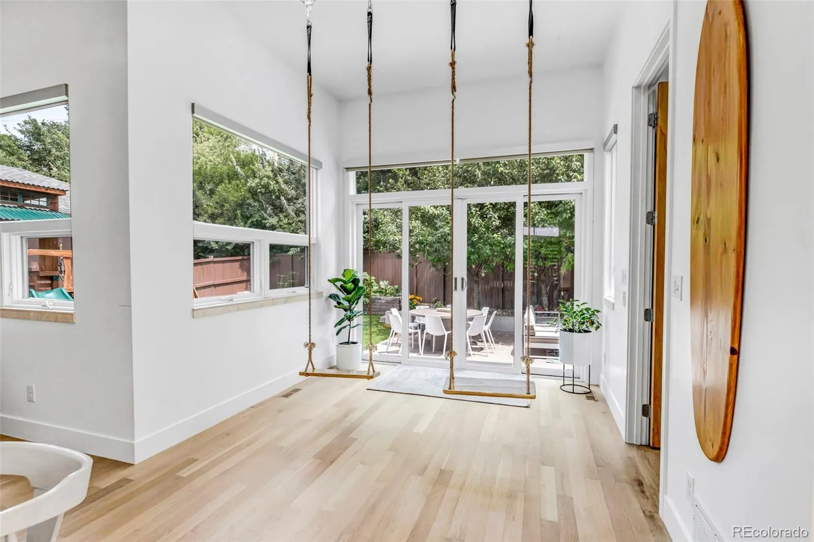 Welcome to your bright, open, and inviting new home! This fully renovated, two-story home boasts five bedrooms, four full bathrooms, an in-home gym/office, a rooftop patio with breathtaking views, an oversized garage, and more. Vaulted ceilings on the main living level flood the space with natural light, while custom maple wood floors warm the entire home. The gourmet kitchen features high-end stainless steel appliances, a six-burner gas range, double ovens, a hood, and two pantries. An LED electric fireplace in the main living room on the first floor serves as the focal point for gatherings. In the dining room area, two ceiling-mounted swings offer a moment of relaxation and play. A large, built-out mudroom leads to the oversized garage, which includes a ceiling loft storage system, an EV charging station, and a golf simulator. The primary bedroom, which can be converted into a sitting area or a desk space, features a large en-suite bath with a soaking tub, a multi-jet shower, dual sinks, and a private toilet closet. There are two additional en-suite bedrooms on the main living floor. The fully completed basement boasts a large wet bar with a refrigerator, dishwasher, and wine refrigerator, as well as a secondary family room. A fourth ensuite bedroom and a large recreation room with exterior access share the fourth bathroom. A recreation room with built-in desks can be used as a fifth bedroom. Plumbing is present for future bathroom additions. This home is conveniently located two blocks from Eisenhower Park, a public recreation center with a pool, pickleball, and more. Nearby, the High Line Canal, a 71-mile trail system, offers scenic views. Belleview Light Rail Station is just minutes away, and all major highways are easily accessible.