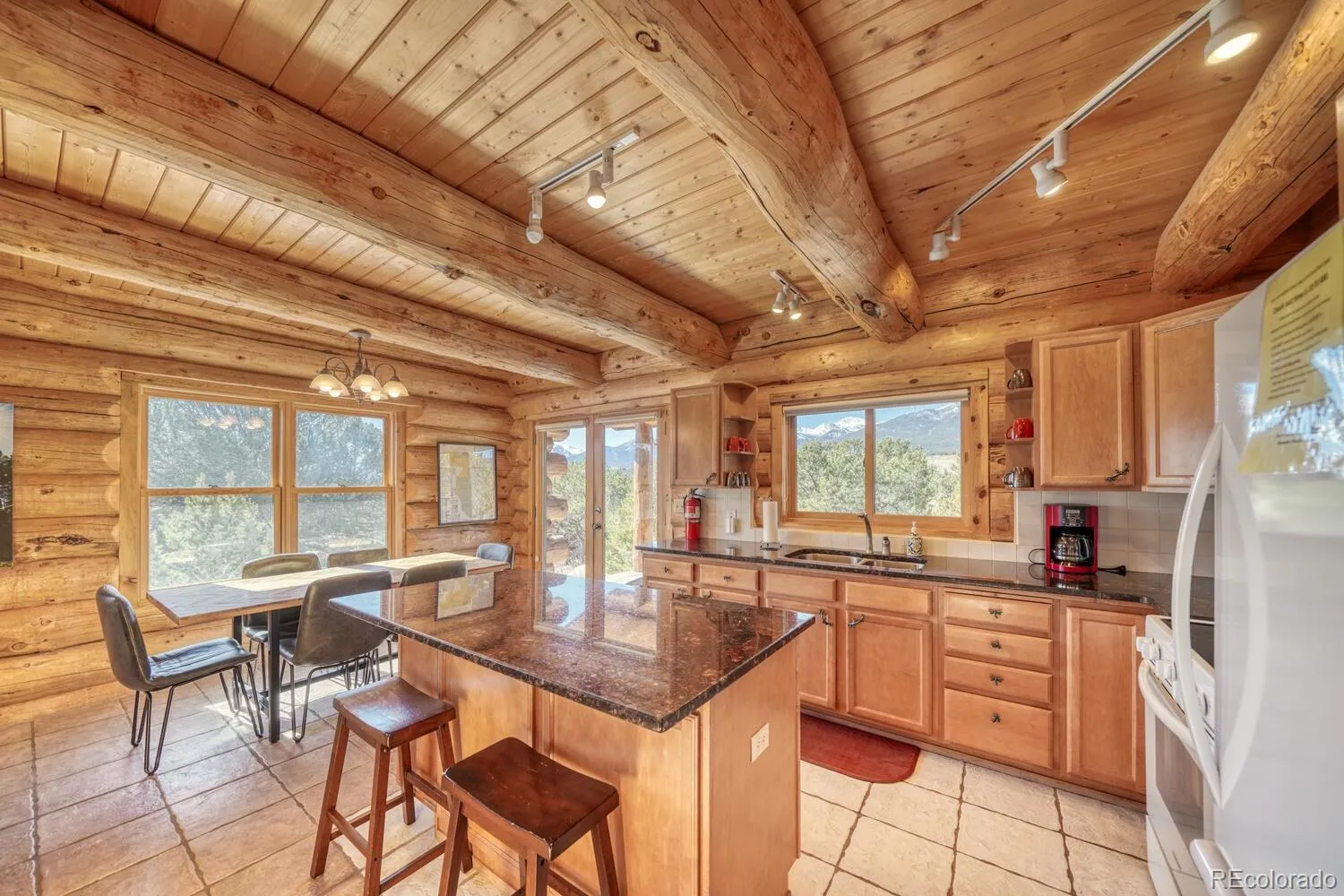 The “BonaVista” cabin is a charming log home is nestled in the Pinon trees in front for privacy, but has amazing views of the mountains behind and around the house. Built by the previous owner, the attention to detail for a modern version of a cozy log cabin is evident. There is a stamped concrete path up to the house that continues under the covered front porch, around the South side of the house and onto the covered back porch. Lots of outside areas to sit and look out at the Collegiate Peaks and Valley views.