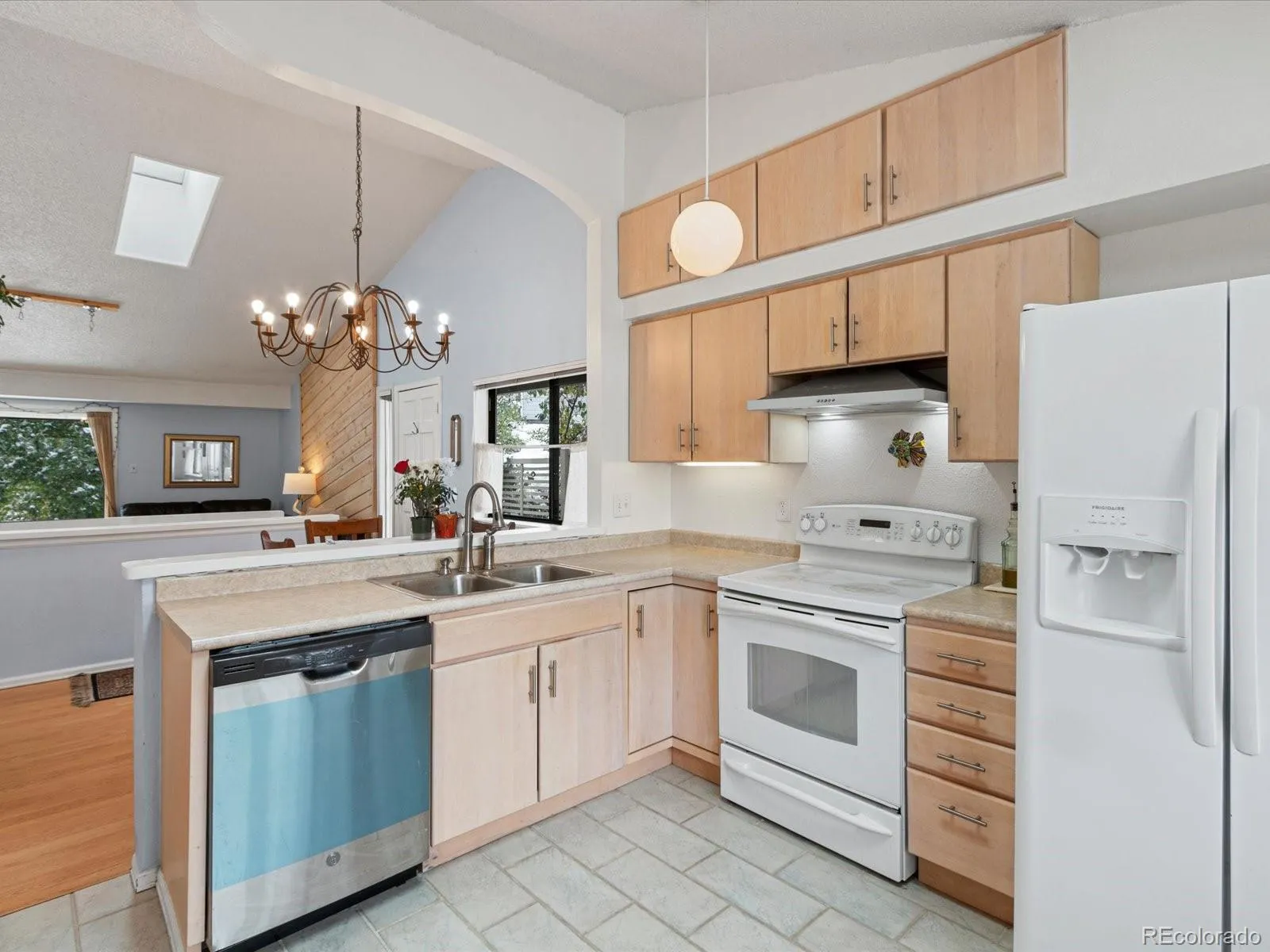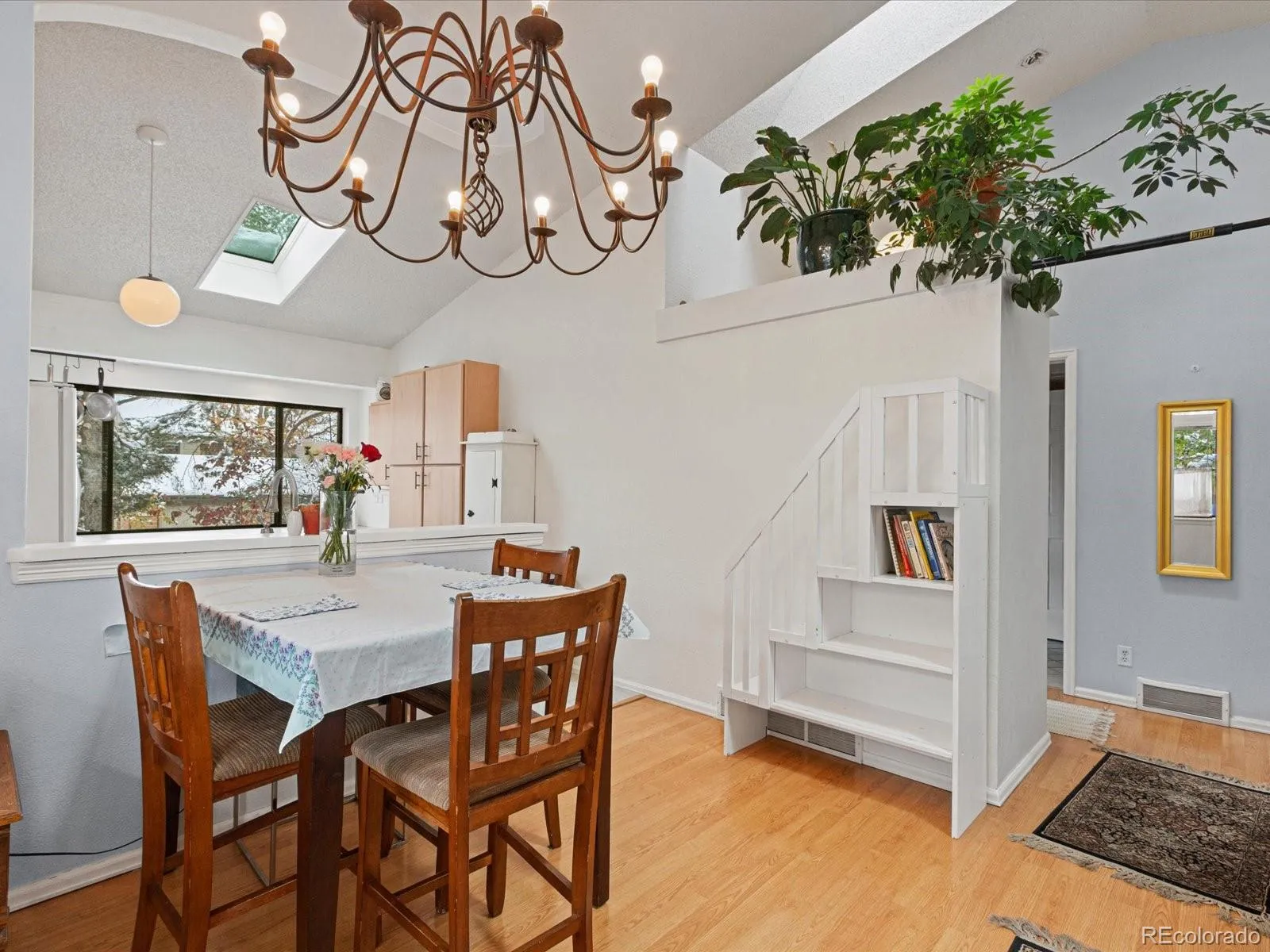 Inside, the main level is bright from the start, with oversized windows, sliding glass doors, and skylights bringing sunlight through the living spaces. The living room opens directly to the private patio and fenced yard, giving the home a tucked-in, indoor-outdoor feel that suits the setting. Up a few steps, the dining area and kitchen sit at the center of it all, with generous storage, good flow, and a comfortable everyday rhythm.
