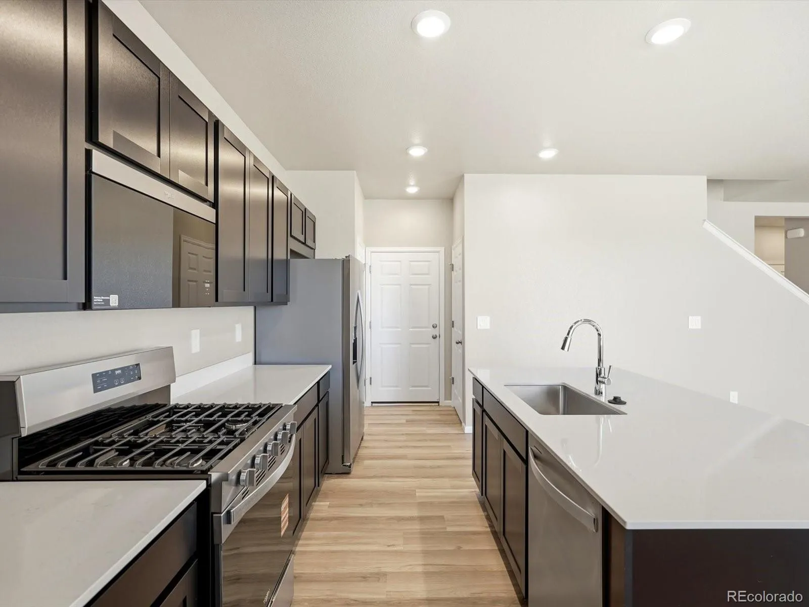 Open concept kitchen with quartz countertops and espresso cabinets!