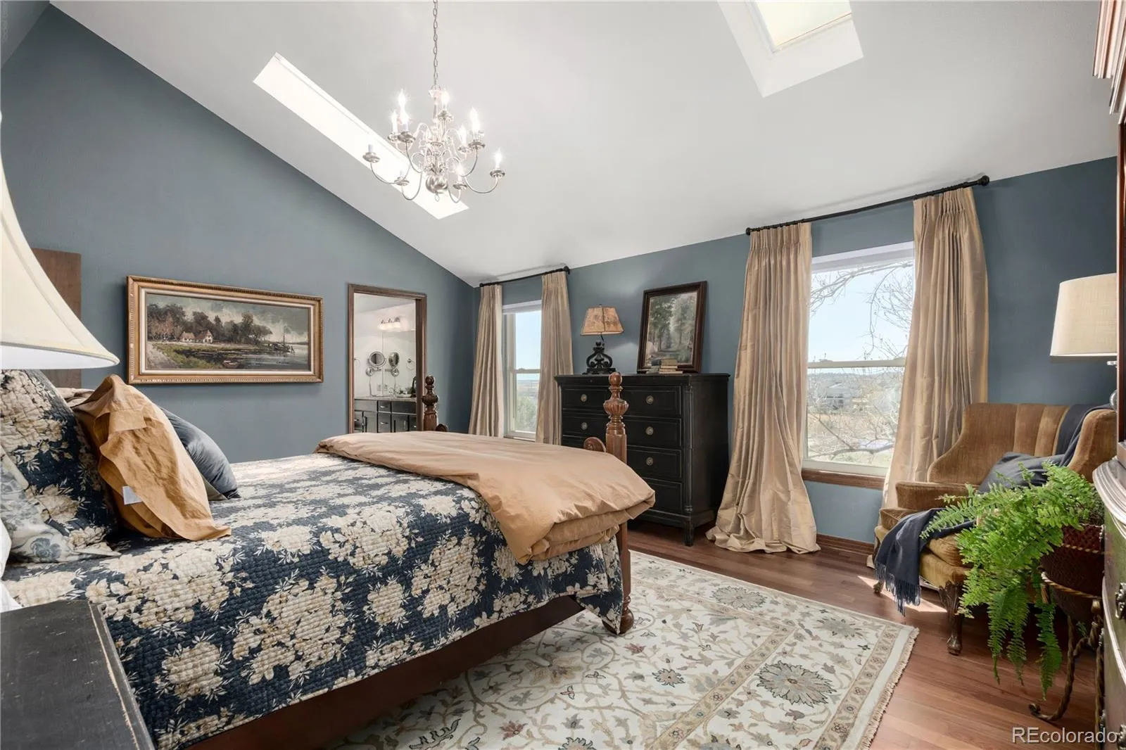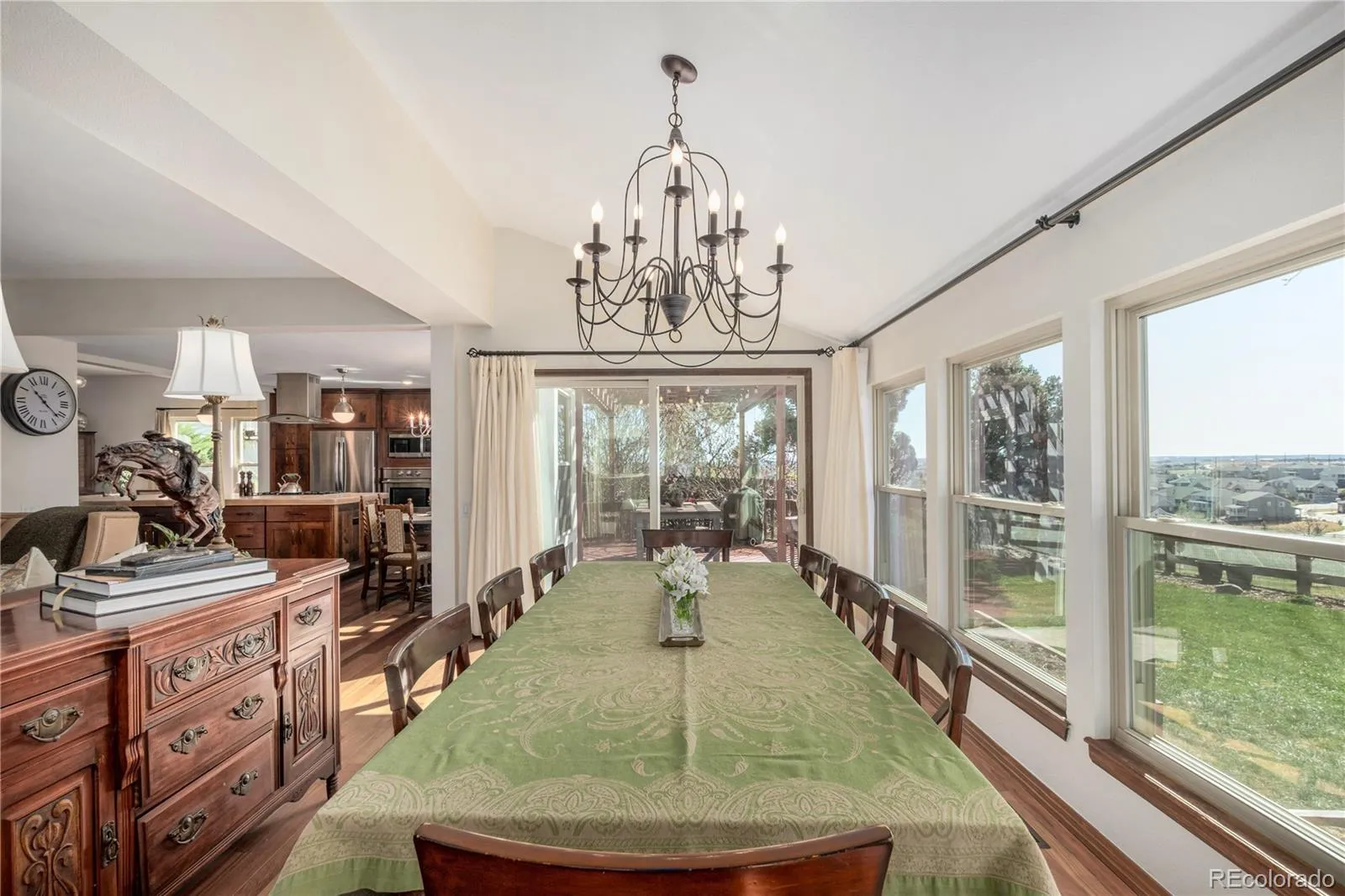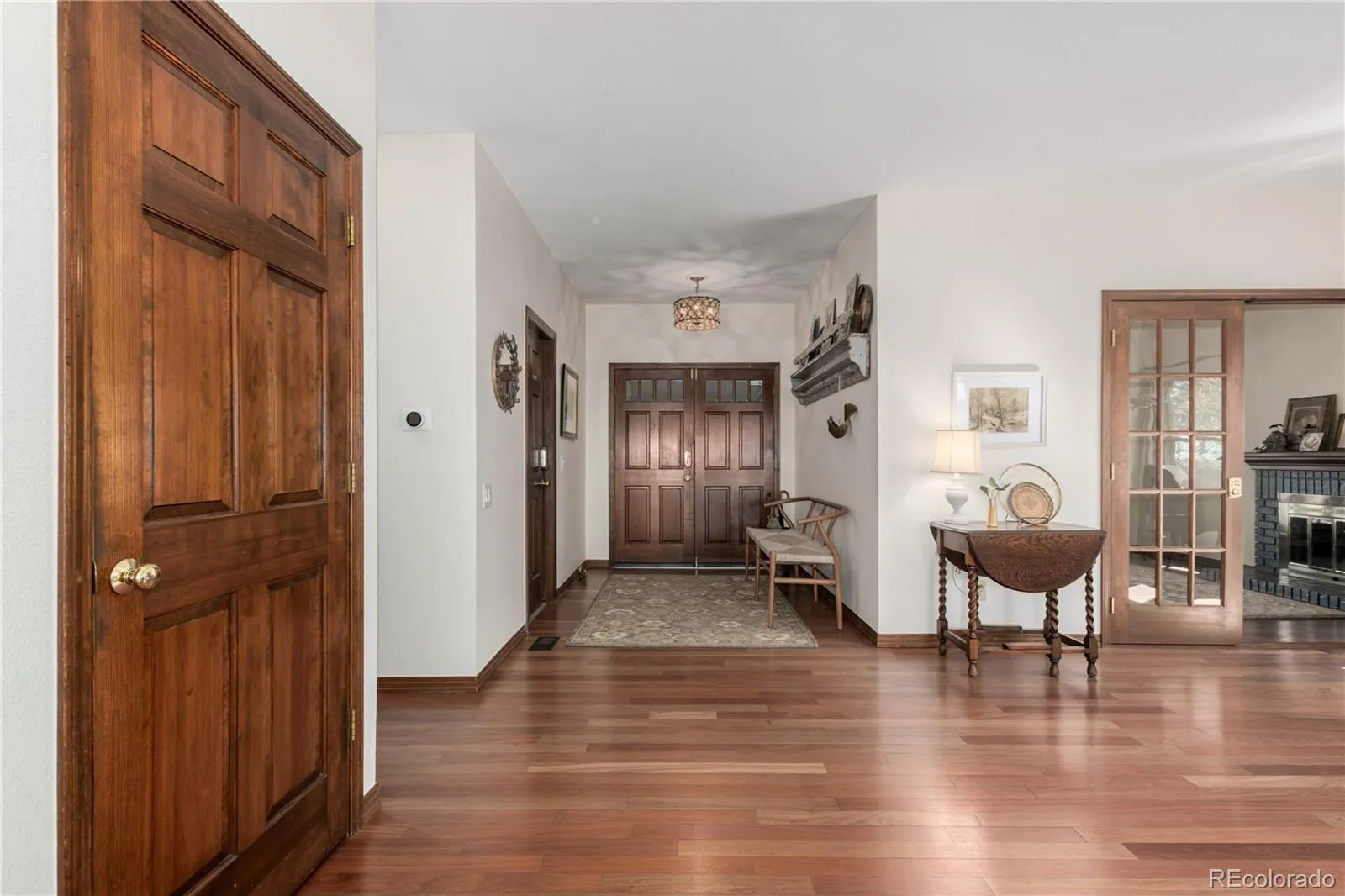 Tucked at the end of a quiet cul-de-sac & backing to Elk Ridge Park open space, this Castle Pines home offers the privacy, calm, & outdoor connection many buyers hope to find but rarely do. Set on nearly a 1/4 acre lot, this home blends classic modern & traditional character. Inside, Brazilian cherry hardwood floors create warmth throughout the main level, where the open-concept allows the kitchen, family room, & dining areas to flow together—ideal for evenings at home & hosting friends. The kitchen features granite countertops, stainless steel appliances, a gas range with vent hood, custom solid wood cabinets with crown moulding, and butcher block island. A wood-burning fireplace in the family room adds character, while the office includes a second fireplace already plumbed for gas. Upstairs, Brazilian cherry hardwood flooring continues through the bedrooms, while the spacious owner’s suite provides a private retreat with vaulted ceilings, skylights, walk-in closet with built-in organization, and spa-inspired bath featuring a steam shower with dual shower heads, jetted soaking tub, & granite double vanity. The finished basement provides a theater room with surround sound speakers, room with egress window & closet, full bathroom, laundry room, & generous storage. Outdoor living is equally inviting, backing to open space & offers a flat, usable yard with perennials, mature grapevines, garden shed, & deck designed for grilling and dining under CO skies. Practical updates include 2022 Class 4 impact-resistant roof, vinyl windows with lifetime warranty, high-efficiency furnace, radon mitigation system, whole house fan & two 50-gallon water heaters. Located in Douglas County School District & zoned for Buffalo Ridge Elementary, Rocky Heights Middle School, & Rock Canyon High School, the home provides easy access to nearby parks, trails, Castle Pines shopping & dining, Castle Rock outlets, & convenient commuting via I-25 to the DTC in under 15 minutes. Your home awaits!