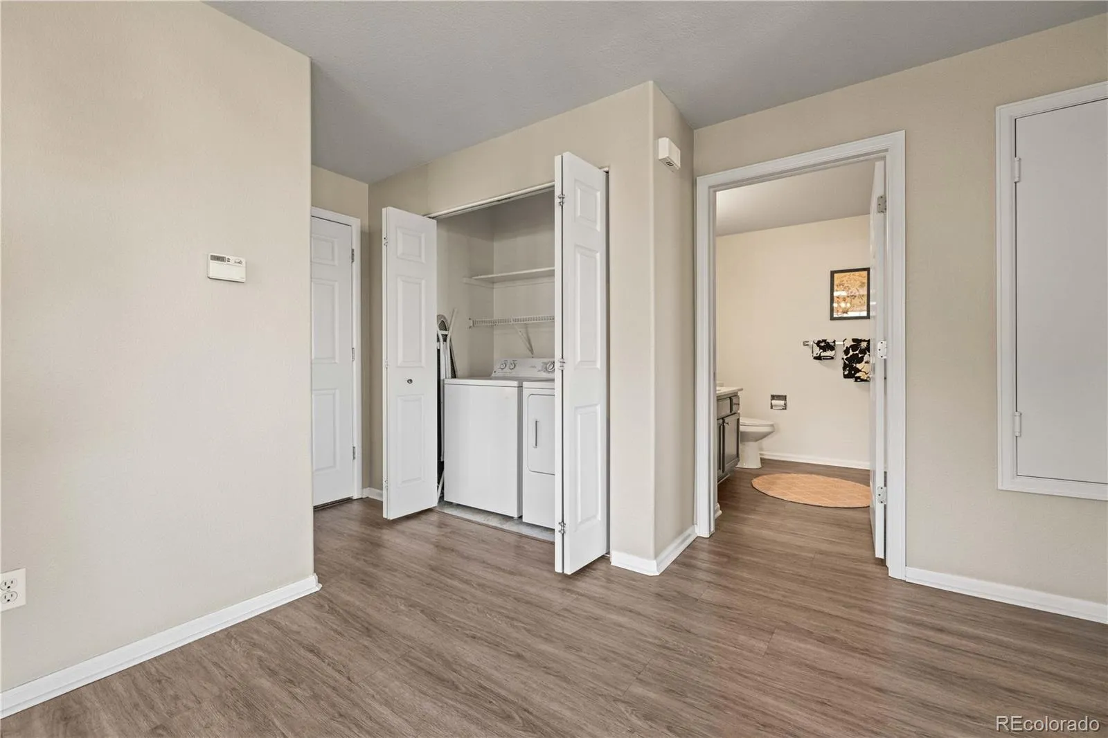 The spacious primary suite features a large walk-in closet and dual sinks, while the second bedroom and ¾ bath offer flexibility for guests, work-from-home, or both. Full-size, in-unit washer and dryer make everyday living easy.