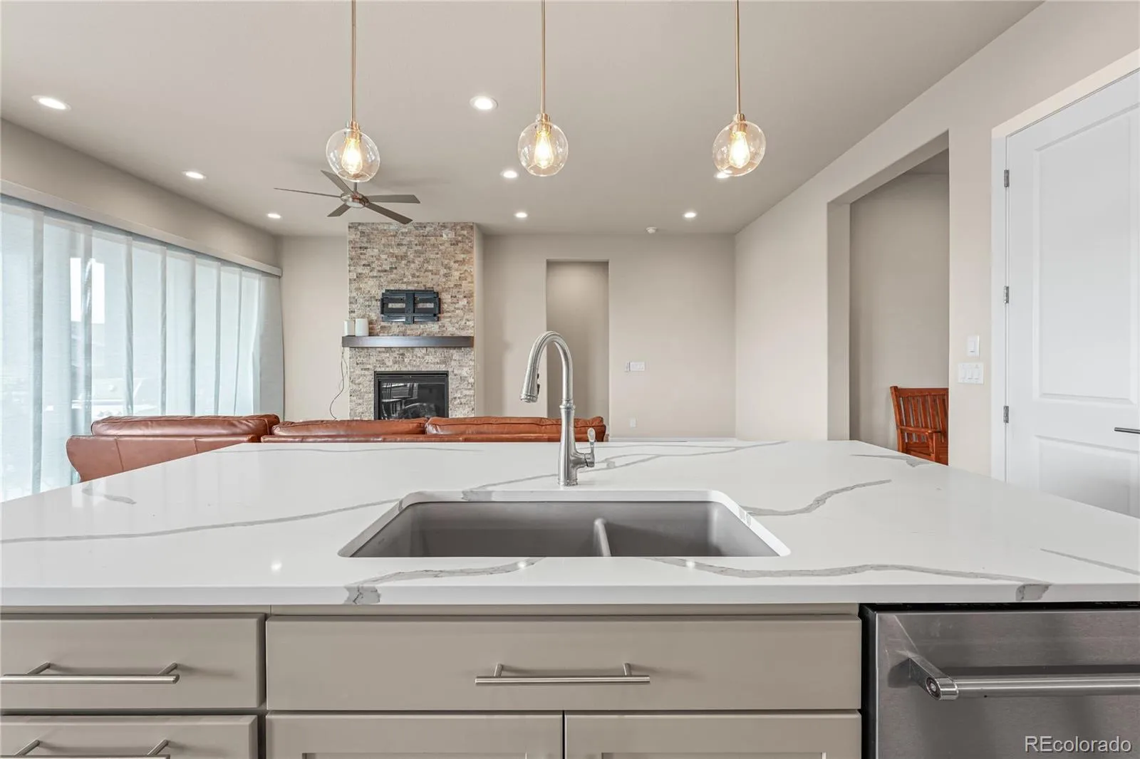 This home is very upgraded by the builder. See the upgrade list in the document file and a detailed Carson model floor plan. Very clean and a nice premium lot location. The interior is open and shows terrific. A wonderful kitchen with a giant quartz surface Island. Fine cabinetry, with spacious quartz countertops. Pantry, a complete stainless steel Appliance package, plenty of lighting. The home has many southern windows that bring the sunlight into the home. The large living-great room has the gas fireplace option and a large sliding door to the covered patio that is high above grade overlooking an easy-to-manage yard and some southern vistas. The spacious primary suite offers ample wall space and nice sunlit windows, accented by a coffered ceiling. A luxury bath suite, including a large shower and a large walk-in closet are upgraded and well-appointed.