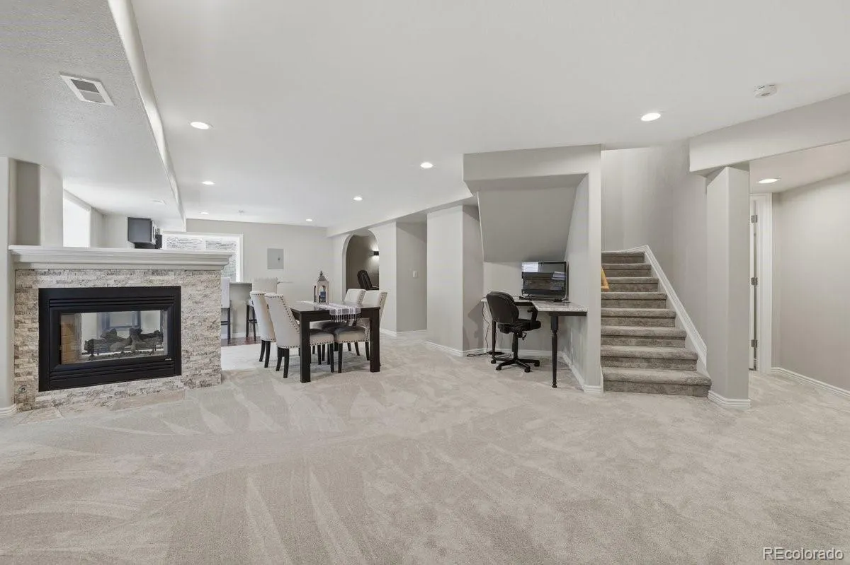 Welcome to 7634 S Duquesne Way in Aurora, CO — a beautifully maintained move-in ready home designed for gathering, celebrating, and everyday living done well. Set on a desirable corner lot in Creekside at Heritage Eagle Bend, this 4-bedroom, 5-bathroom, 5,490 sq ft residence has been thoughtfully updated and lovingly cared for, offering the space and flexibility today’s families need. The main level welcomes you with vaulted and coffered ceilings, rich hardwood floors, and walls of windows — many recently replaced — that flood the home with natural light. A private home office provides an ideal work-from-home setting. The open kitchen features granite countertops, stainless steel appliances, and a butler’s serving area ideal for casual dinners to holiday entertaining. Built-in surround sound connects the living spaces seamlessly. Upstairs, four generous bedrooms provide room for everyone, each with well-appointed baths. New carpet and recently replaced furnaces and AC systems ensure true move-in comfort. The fully renovated lower level is the showpiece: a custom wet bar, cozy fireplace, home theater, dedicated home gym, and a spa-inspired bath with backlit vanity mirror, custom cabinetry, and an oversized doorless walk-in shower featuring floor-to-ceiling travertine, dual shower heads, built-in niches, quartz bench, and pebble stone flooring. Outside, the 0.29-acre corner lot