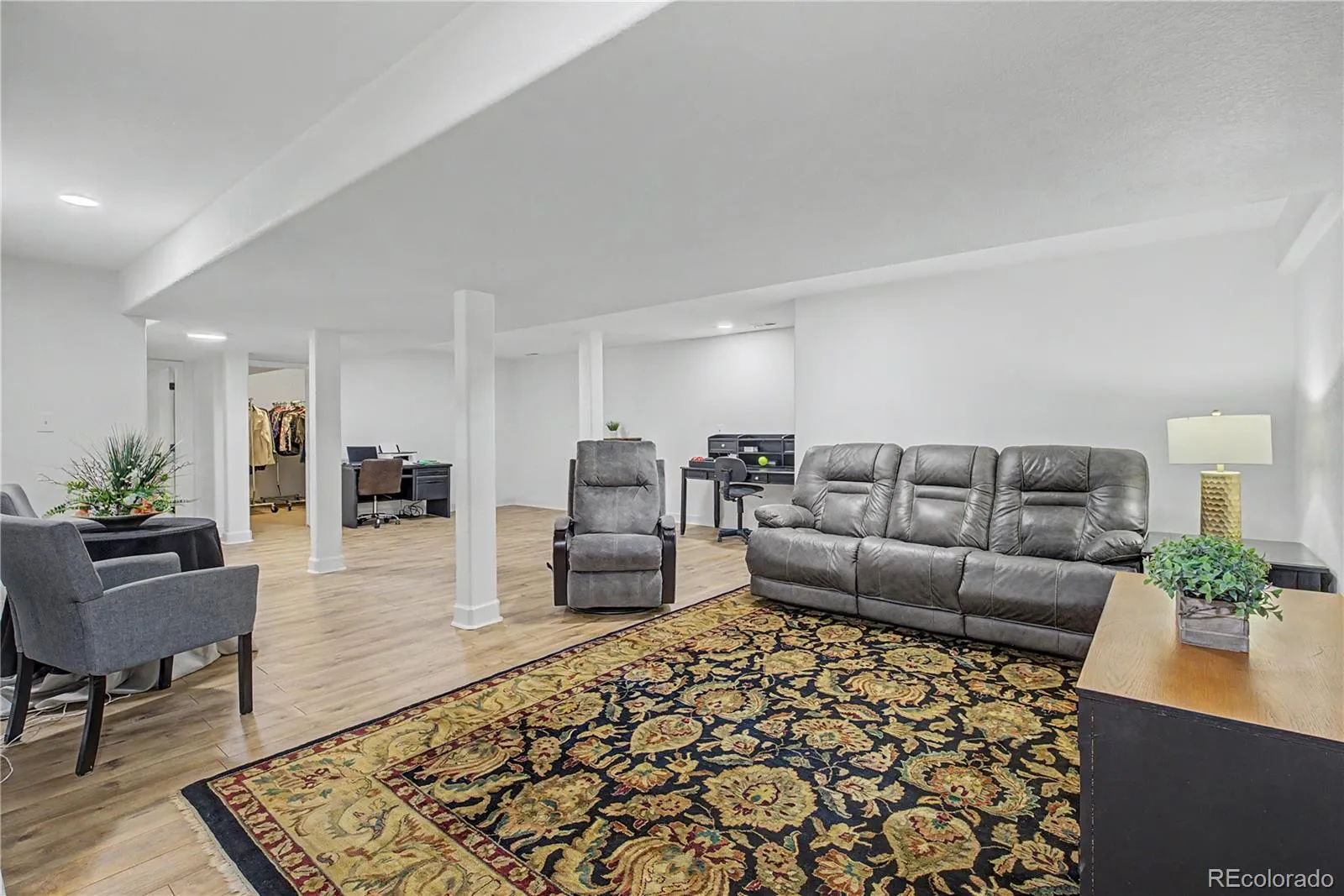 The remodeled kitchen is a standout with stainless steel appliances, quartz countertops, upgraded soft-close cabinetry, and slide-out shelving designed for both style and functionality. Upstairs offers a second primary bedroom option with a full bathroom and a quiet landing area perfect for a desk or reading nook. The finished basement expands the living space with a large family room, an additional bedroom, a ¾ bathroom, and two bonus rooms that can easily serve as a home office, non-conforming bedroom, workout space, studio, or additional storage. Additional highlights include triple-pane windows, a whole-house fan, custom Hunter Douglas wood blinds, and a remote-controlled shade in the upper hallway window. Enjoy low-maintenance living in a prime location close to shopping, dining, and entertainment at Belmar.