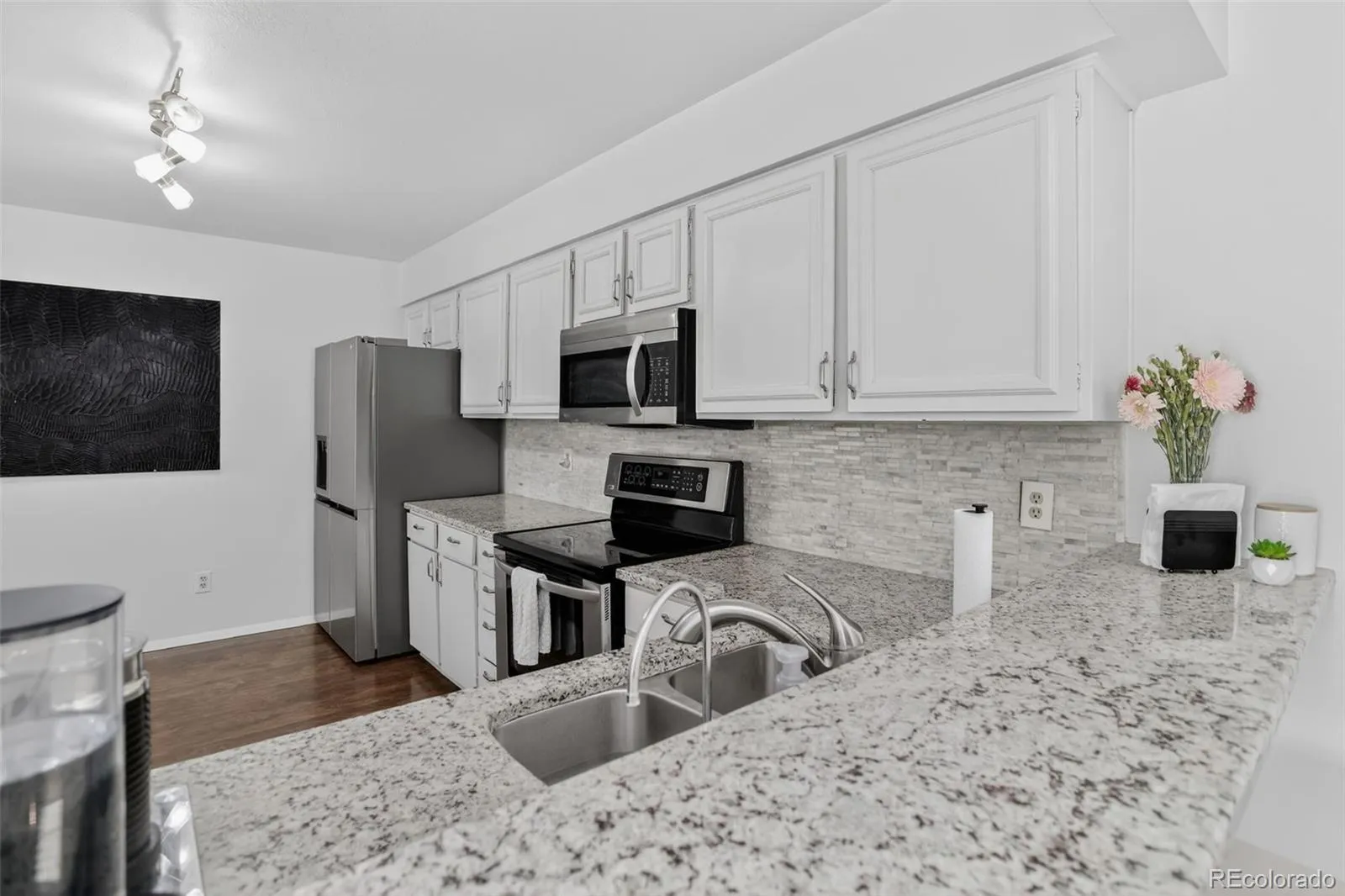 Welcome Home to Southglenn Commons where comfort, style, and convenience come together. From the moment you step inside, natural light fills the space, drawing you into an open-concept layout that feels both spacious and inviting. The living room flows seamlessly into a dedicated dining area, creating a true place to gather, host, and connect. Just beyond, the kitchen becomes the heart of the home, generously sized and thoughtfully designed, it offers an abundance of counter space and cabinetry, giving you room to cook, prep, and entertain with ease. Featuring stainless steel appliances, granite countertops, tile backsplash, and white cabinetry, the space is both functional and welcoming. The counter seating area opens directly to the dining space, creating a natural connection between cooking and conversation. The warmth continues throughout with luxury vinyl plank flooring and neutral colors that enhances the home’s loving ambiance. Both bedrooms are generously sized and feature walk-in closets, offering flexibility for guests, a home office, or additional storage. The bathroom is well-positioned for easy access and everyday functionality.