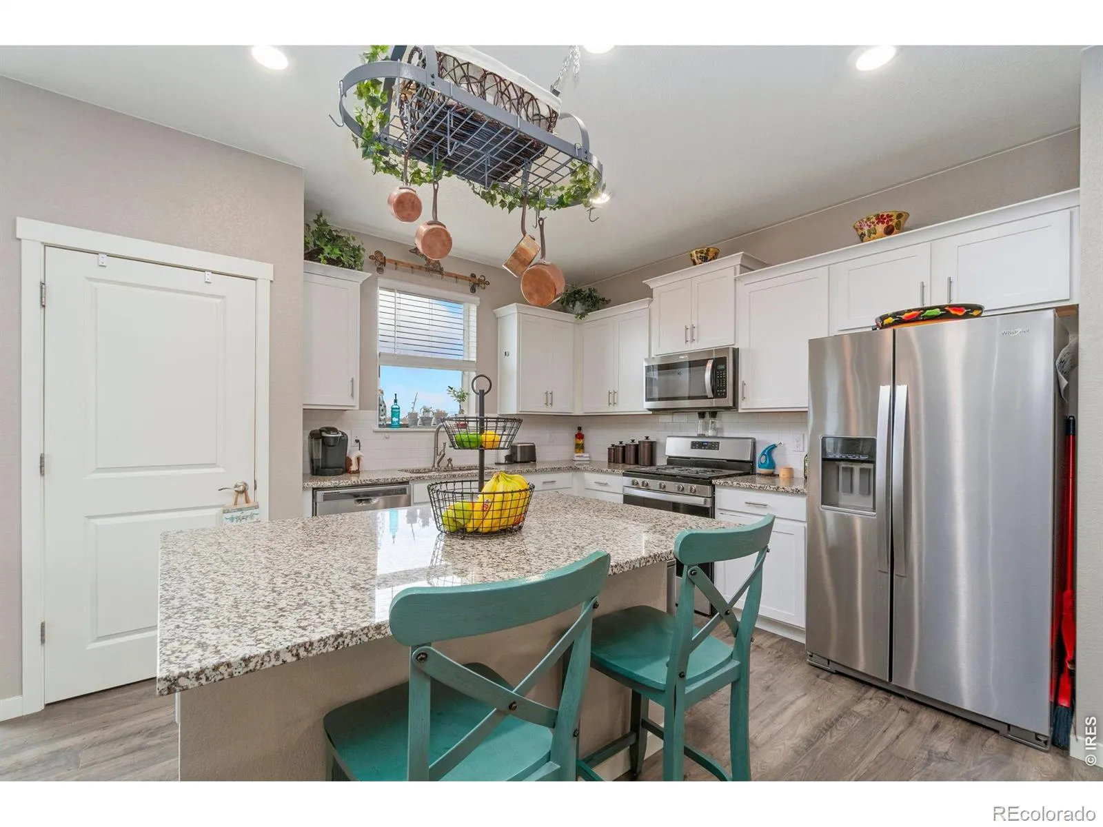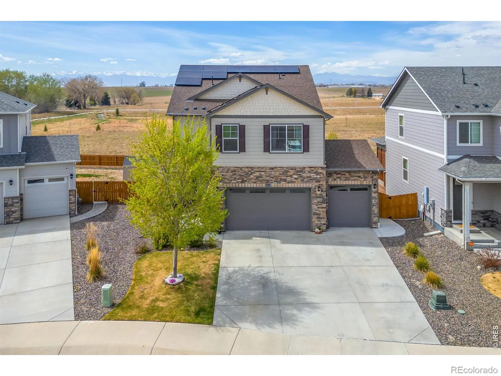 Kittle Real Estate presents this two-story home, backing to open space with incredible views of Longs Peak, offering a rare setting where mountain scenery and wide-open skies become part of your everyday experience! Step through the foyer that leads into a light-filled main living area, creating a welcoming first impression with a layout that feels open and connected. The kitchen features stainless steel appliances, granite countertops, a pantry, and a large island with seating, offering both functionality and style with plenty of room to gather and prepare. A private upper-level retreat awaits, with all four bedrooms and the laundry conveniently located upstairs, including a spacious primary suite with an ensuite bathroom and a walk-in closet. The basement adds valuable extra living space with a recreational area centered around an electric fireplace that adds a cozy touch for relaxing or entertaining. Outside, the fenced backyard features a two-tiered raised deck designed to take full advantage of unobstructed Front Range views and wide-open night skies, creating a perfect space to unwind or gather outdoors. A three-car oversized garage provides plenty of room for vehicles, storage, and even a workshop setup, adding flexibility to fit your needs. Jellyfish exterior lighting adds both style and convenience, allowing you to customize lighting directly from your phone for any occasion. Another feature is the solar panels that helps reduce energy cost and adds long-term value to the home. The neighborhood offers plenty of opportunities to get outside and enjoy the surrounding community with walking paths and several parks nearby. Perfectly positioned for convenience, you’ll have speedy routes to I-25 and nearby Longmont, plus easy trips to DIA just 42 miles away.