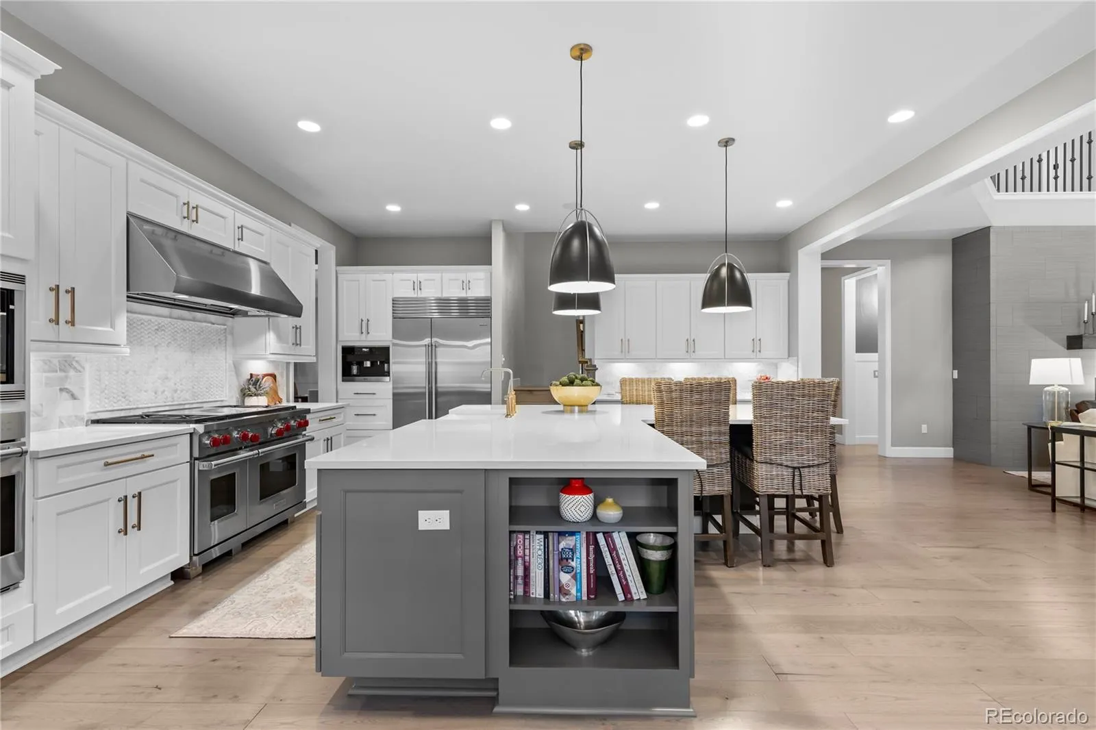 At the heart of the home, the chef’s kitchen is designed to impress—featuring top-of-the-line Wolf appliances, a Sub-Zero refrigerator, built-in Miele coffee system, premium ice maker, custom cabinetry, and an oversized pantry. It’s a space that effortlessly blends function and style, ideal for both entertaining and daily living.