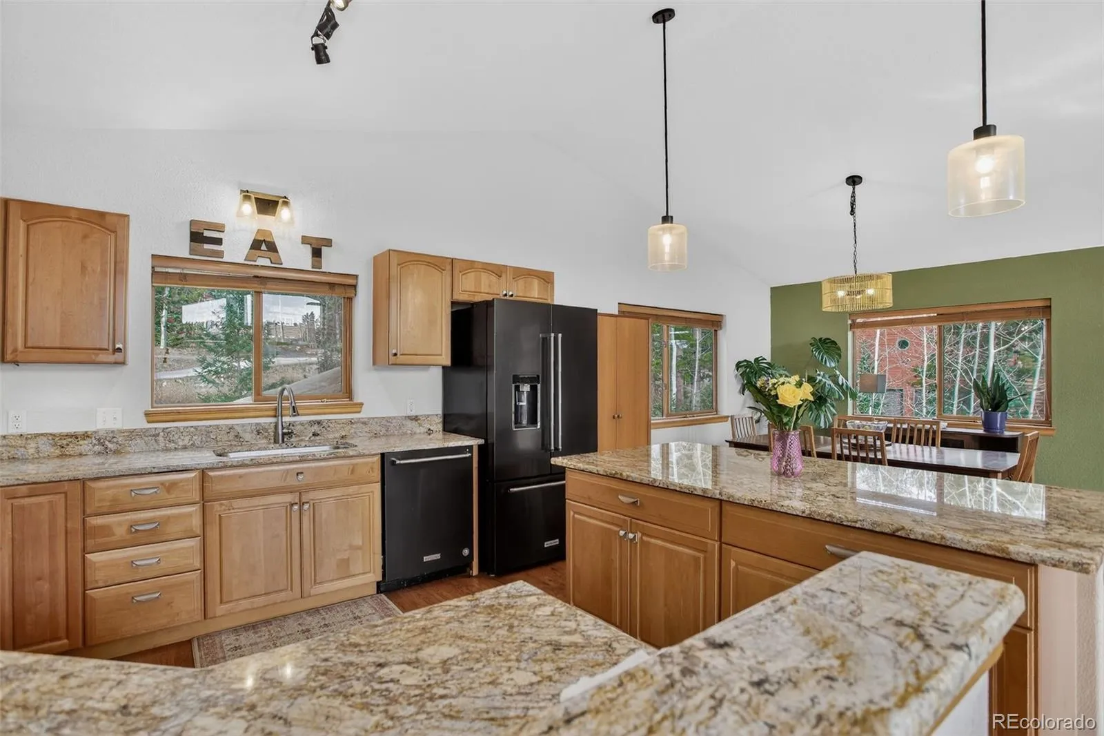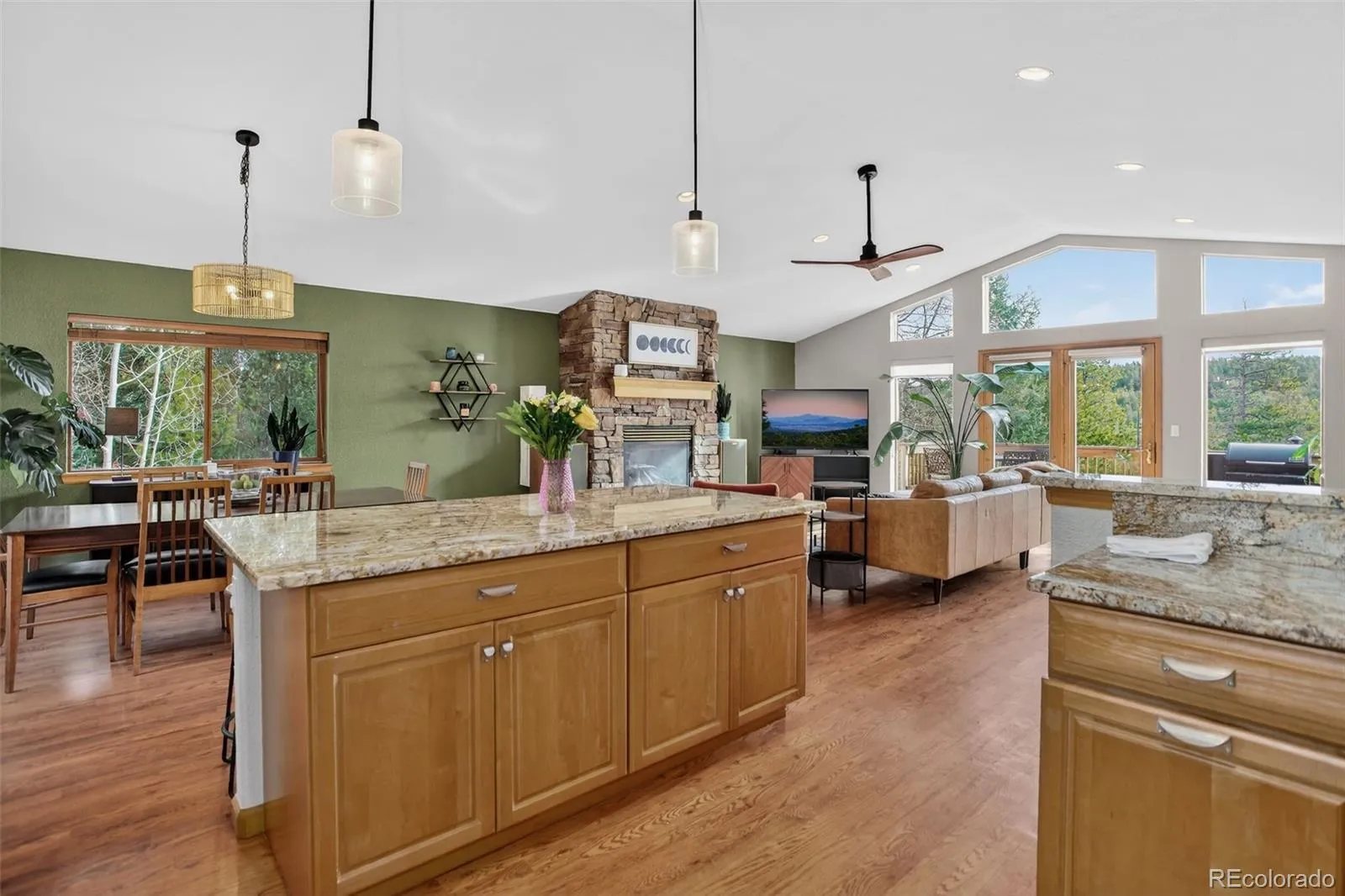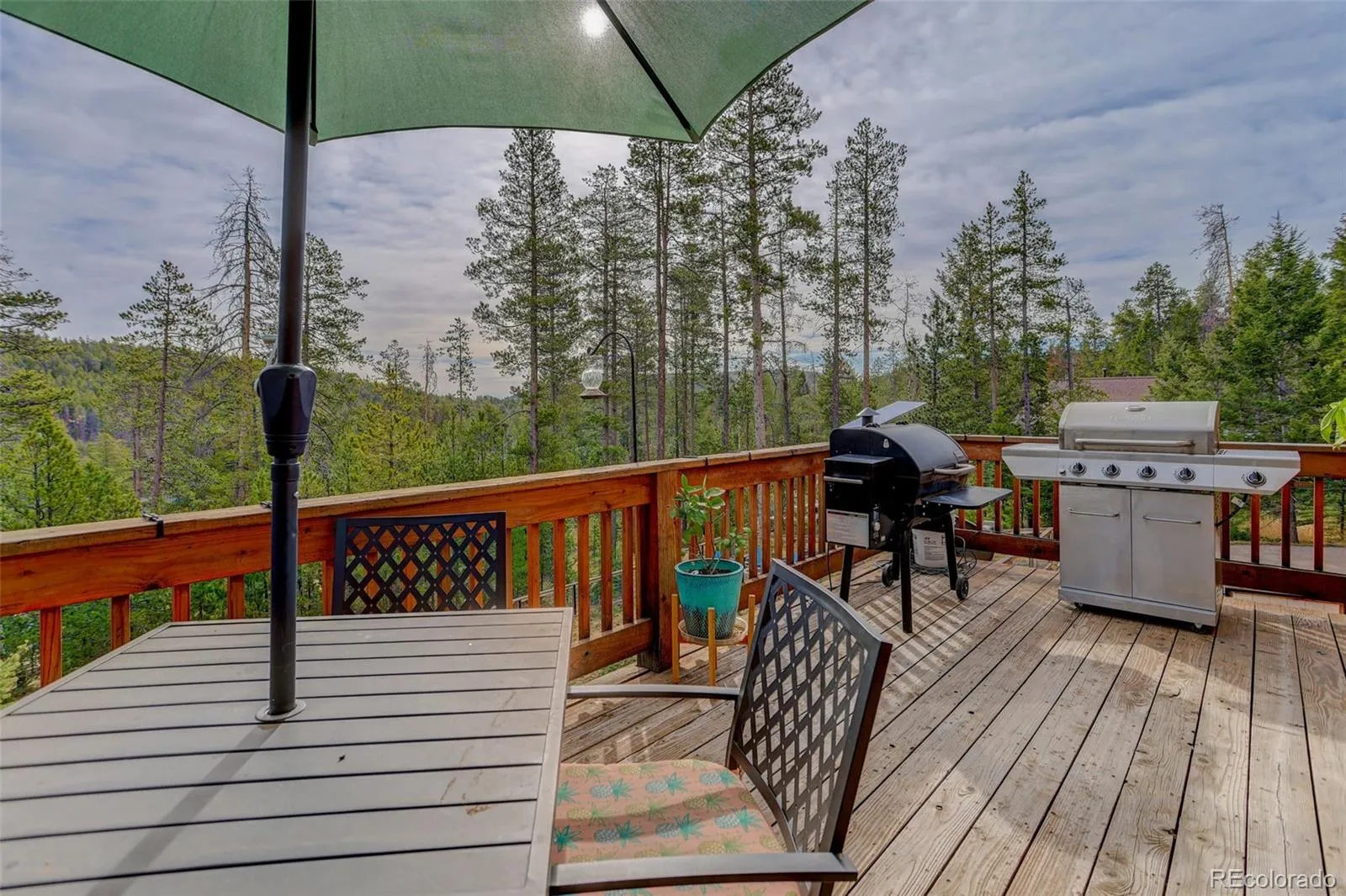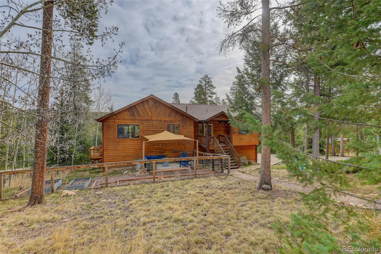 Tucked into a serene 1.03-acre setting surrounded by mature aspen and pine, this mountain contemporary home captures the essence of Colorado living with a perfect balance of comfort and nature. Thoughtfully designed to bring the outdoors in, the 2,352 square foot layout is filled with natural light from expansive windows that frame peaceful forest views in every direction. The open main level features vaulted ceilings and a welcoming great room anchored by a gas-log fireplace, flowing seamlessly into a spacious kitchen with granite counters, a large island, stainless appliances, and true wood flooring. Step outside to the covered front porch and covered outdoor spaces where you can take in the quiet, fresh mountain air or gather around the fire pit under the stars. The private primary suite offers a tranquil retreat with a walk-in closet and radiant-heated bathroom floor. High ceilings in the basement allow for lots of window space providing more natural light. The covered patio just out the basement living room door joins the outdoors with the interior with easy access to the usable fenced backyard completed by a stone patio and firepit. A third bedroom, full bath, and laundry nicely finish this living area. Additional highlights include new carpet, front yard stone patio seating, garden area, oversized insulated 2-car garage, RV parking, dog run, dedicated wood-working shed, and newer furnace, newer water heater. Located in the peaceful Pleasant Park Corridor this property offers the space, privacy, and authentic mountain lifestyle homebuyers are searching for without compromising convenient access to Conifer and Metro amenities.