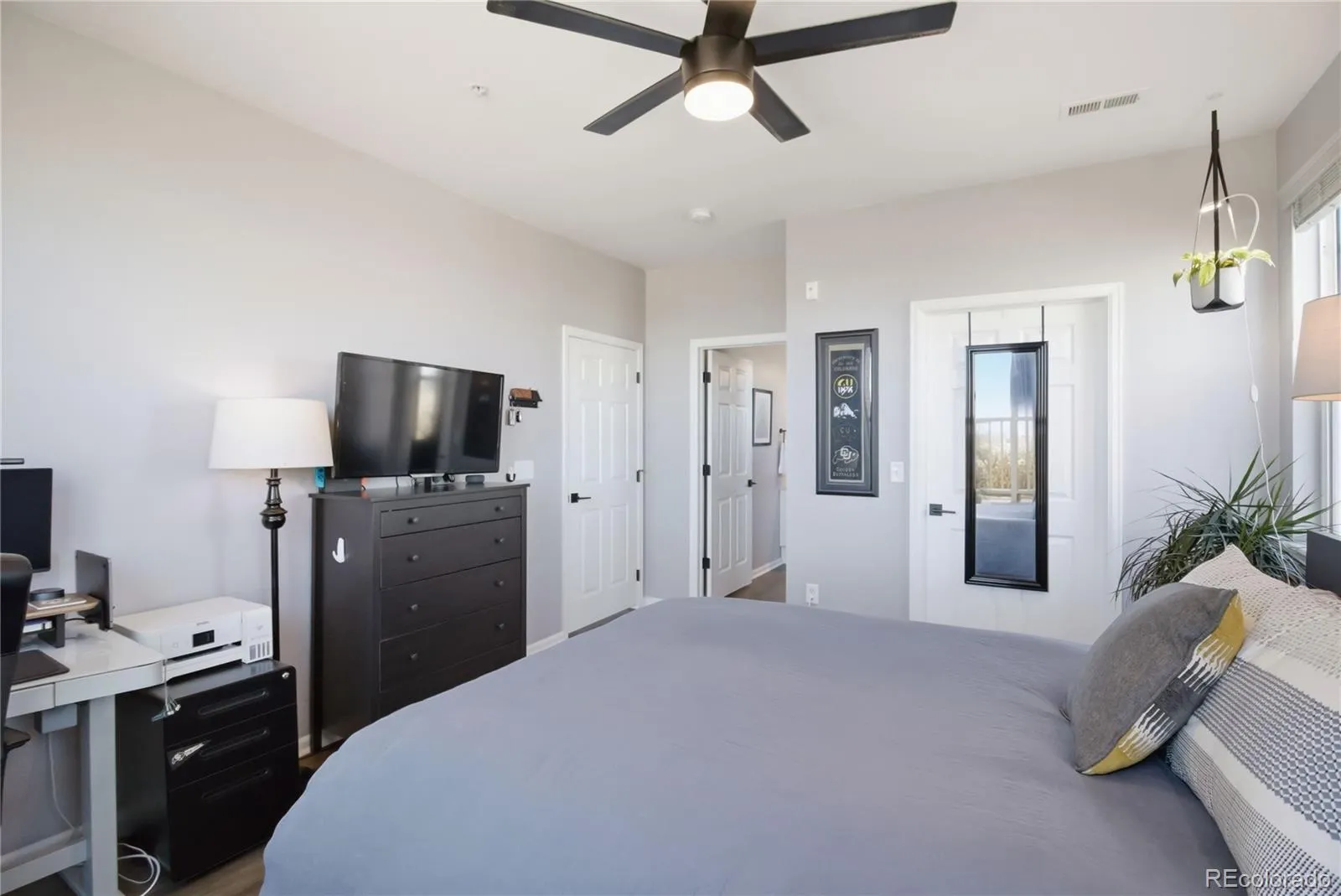 The spacious primary suite includes a walk-in closet and full ensuite bath. The secondary bedroom offers generous closet space and sits next to a second full bath—ideal for guests, roommates, or a home office. The flexible layout also makes renting the second bedroom an easy option.