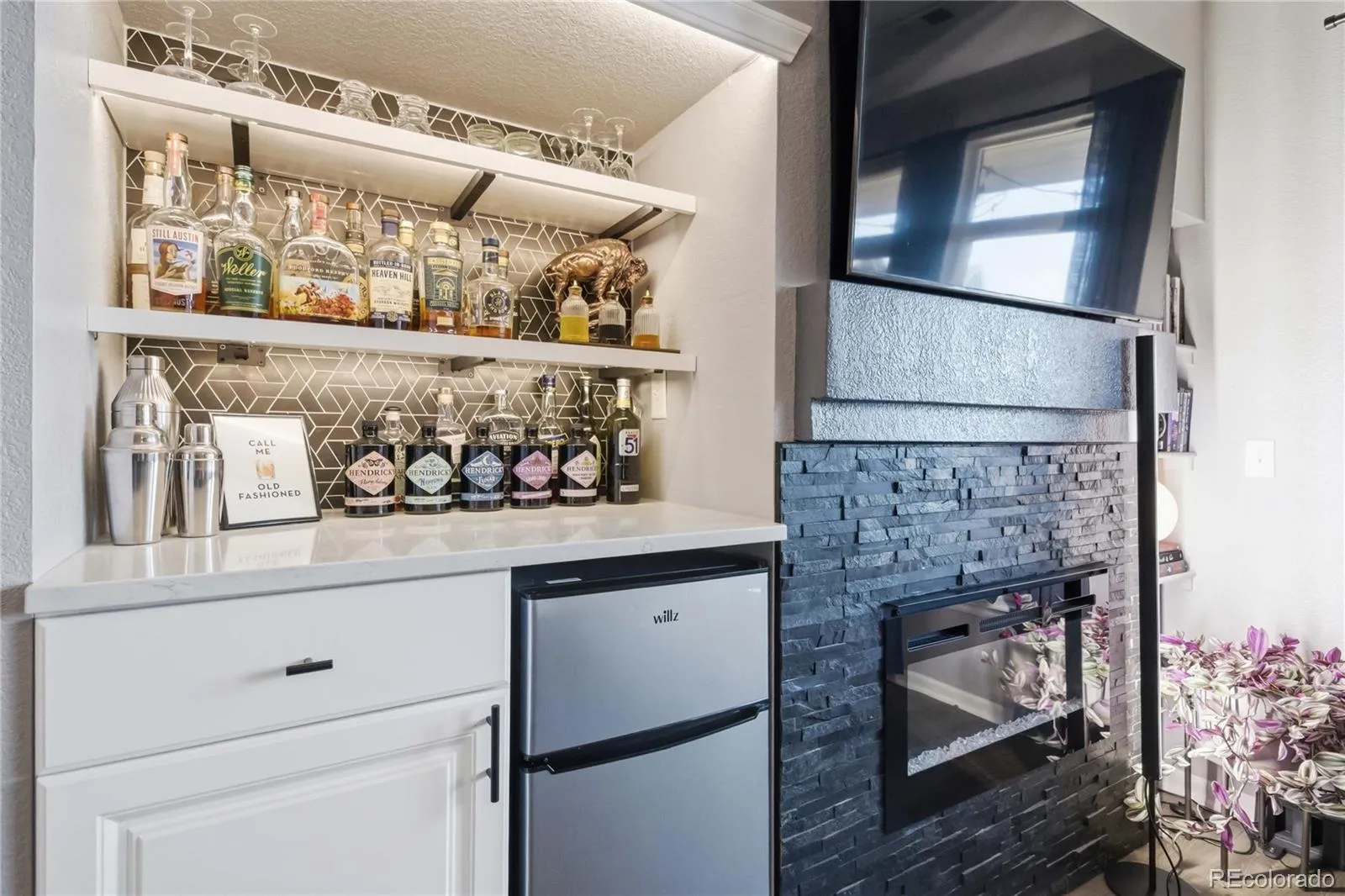 The inviting family room is perfect for relaxing or entertaining, complete with a built-in mini bar and beverage fridge, plus a cozy electric fireplace that adds warmth and ambiance year-round.