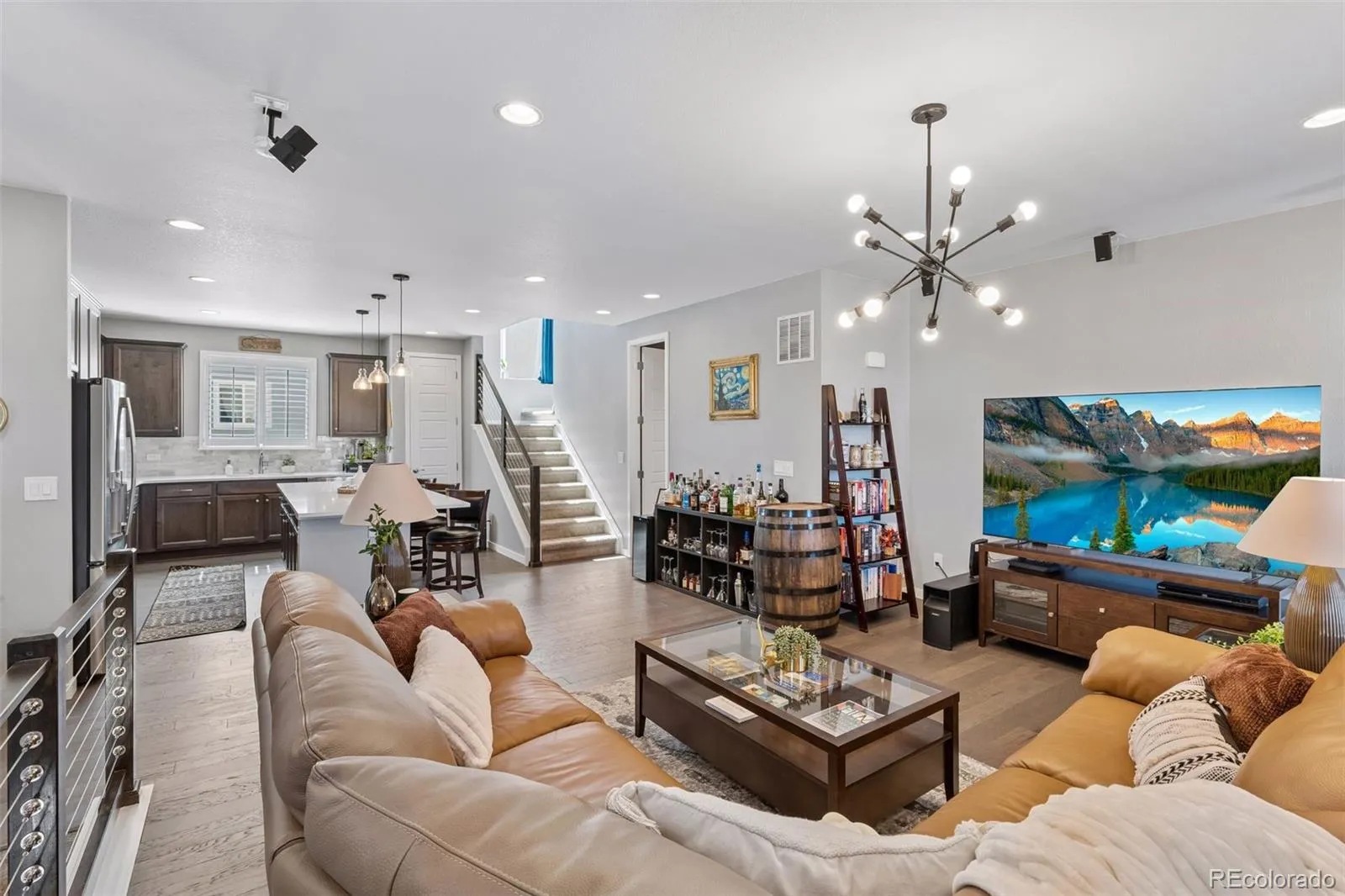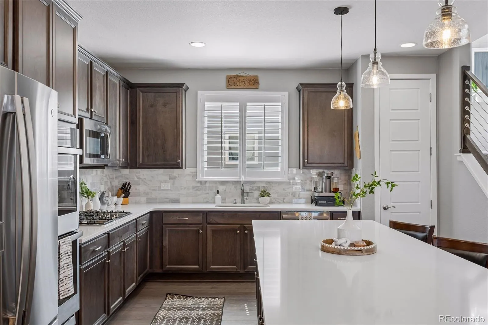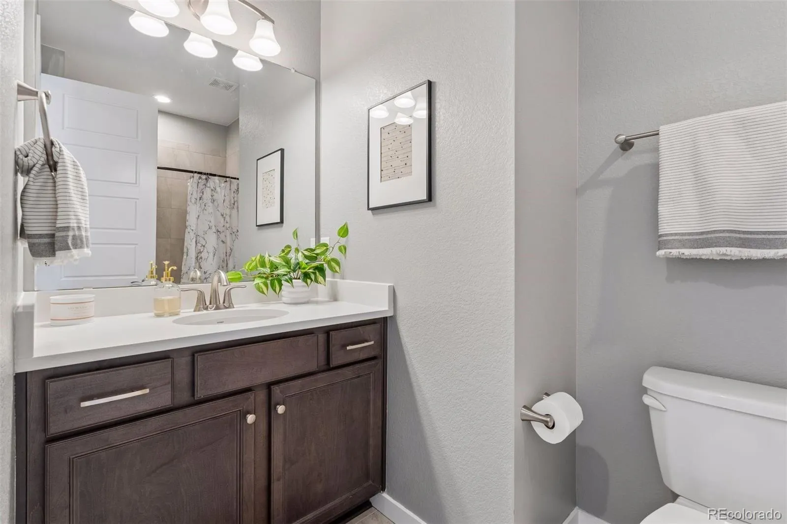 Experience sophisticated, low-maintenance living in this stunning residence perfectly situated in the heart of the Meadows. Spanning three levels of thoughtfully designed space, this home balances modern luxury with the quintessential Colorado lifestyle, featuring premium finishes like quartz countertops, a large eat-at kitchen with a functional island, and a high-end double oven. The main level is designed for effortless entertaining, offering a bright living area bathed in natural light, sleek engineered hardwood floors, and a conveniently located powder room. This home is further accented by elegant plantation shutters, contemporary cable railings, and recessed lighting throughout. On the upper level, the spacious primary suite serves as a private retreat with a walk-in closet and spa-like en-suite 3/4 bath with a huge walk-in shower and double sinks, while a second well-appointed bedroom enjoys easy access to a nearby full hallway bathroom. For added convenience, a laundry closet with an included washer and dryer is also located on the upper level. Functional spaces abound, including a dedicated lower-level office/den perfect for the remote professional, and a two-car attached garage featuring a custom floor coating. The crown jewel of this home is the expansive rooftop deck, where you can host summer gatherings against the backdrop of breathtaking panoramic Rocky Mountain views. Residents also enjoy access to world-class community amenities including a clubhouse and two pools, all while being just minutes from the Red Hawk Ridge Golf Course, local hiking trails, the Outlets at Castle Rock, and premier dining.