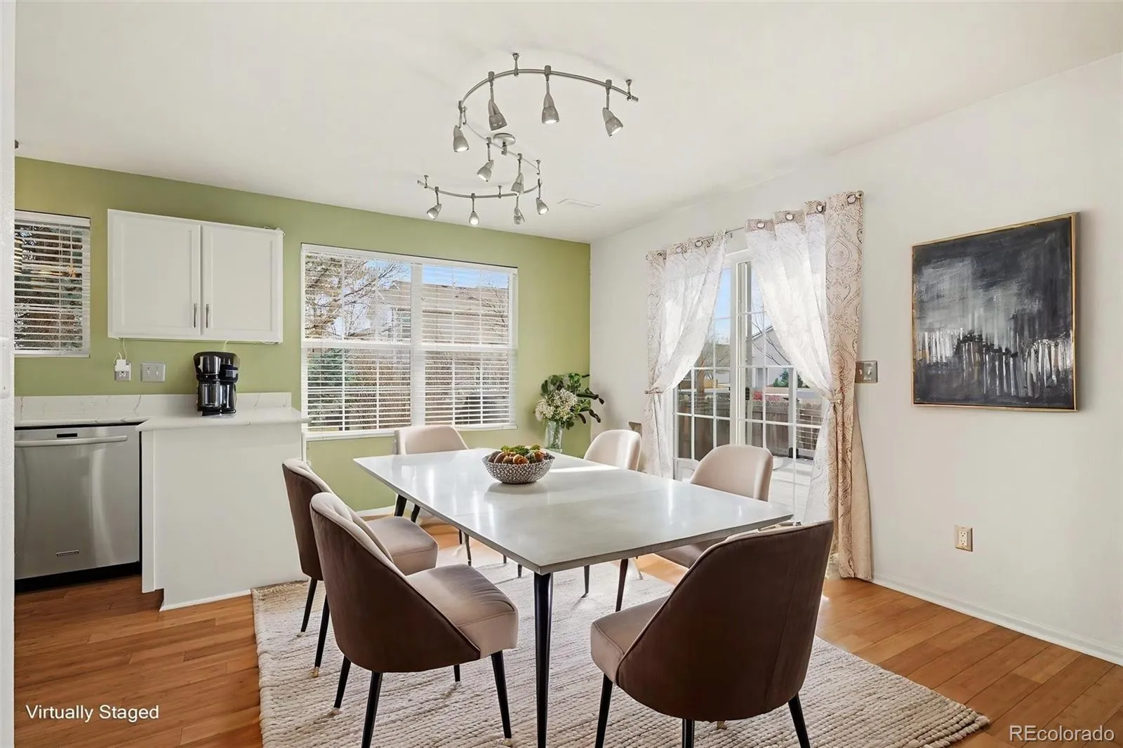 Stylish, move-in ready Townhouse in Cherry Creek School District has an abundance of extras. Enjoy a beautiful light filled kitchen with quartz countertops, custom pullout cabinetry and a floating island. High end appliances include KitchenAid double ovens, Samsung refrigerator with added filtration, touchless faucet, and outside vented range hood. Real bamboo flooring in the main open living area is enhanced with mirrored wall, ideal for dance, fitness or light filled entertaining. Gas fireplace with blower adds comfort on cold winter evenings. Smart home features through out. Nest 4 thermostat, Wyze smart lock and lighting, Wemo garage lighting, programmable switches, and MyQ enabled garage access. Primary suite features custom closet and standout bathroom with backlit color programable mirror. Updated bathrooms through out the home. All bedrooms feature custom closets. Outdoor living shines with a custom deck, remote control sprinkler system with dedicated drip zone for potted plants. Finished garage has rubber flooring, Proslat wall system, storage cabinets, overhead storage, air filtration system, and custom hoist for up to 8 tires. Additional upgrades include hot water recirculating pump, ceiling fans throughout, TV mounts and Whirlpool Cabrio washer and dryer. This property backs to greenbelt with access to 20+ miles of trails along Cherry Creek Tail.