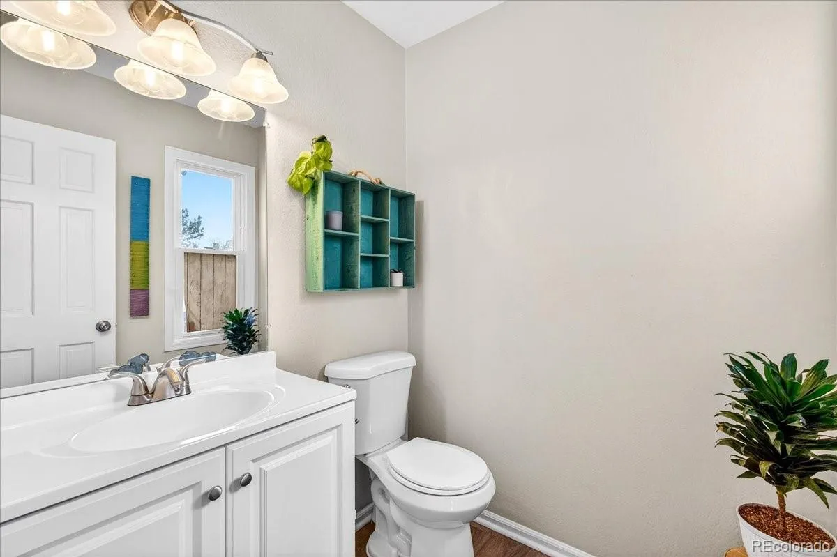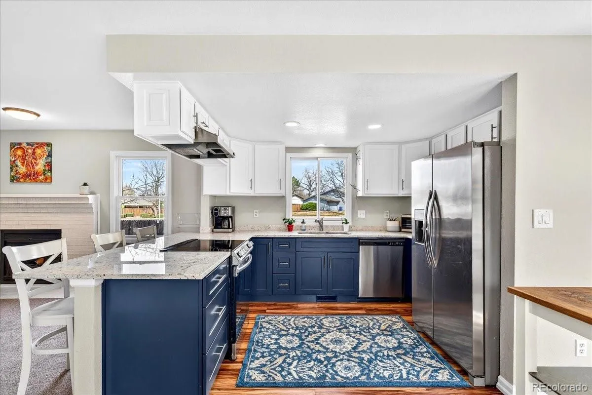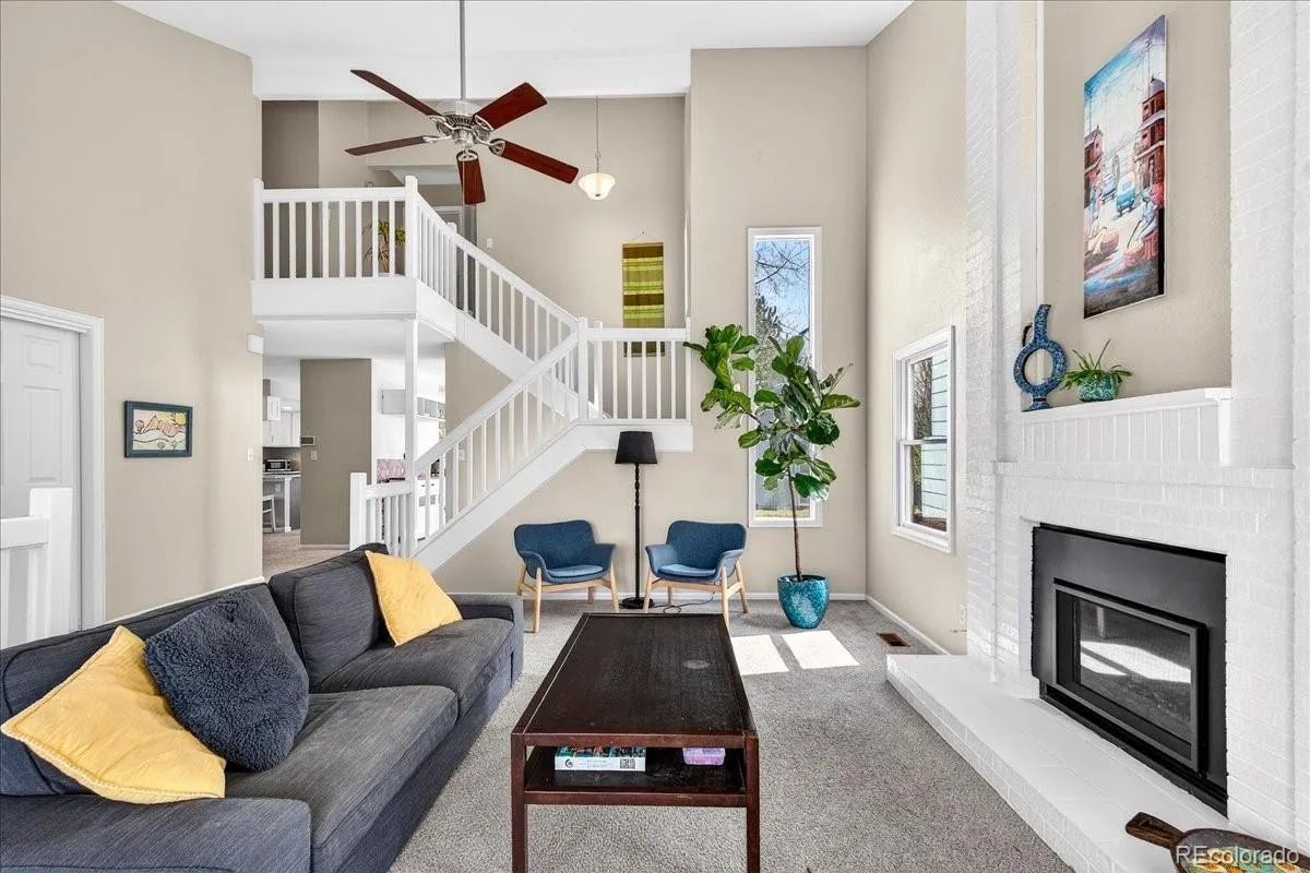 Step inside to find two spacious living areas, each with its own cozy wood-burning fireplace—perfect for Colorado evenings. One living room is highlighted by a charming bay window that fills the space with natural light, while vaulted ceilings create an open, airy feel. The kitchen features newer lower cabinets, a breakfast nook for casual dining, and a separate formal dining area.