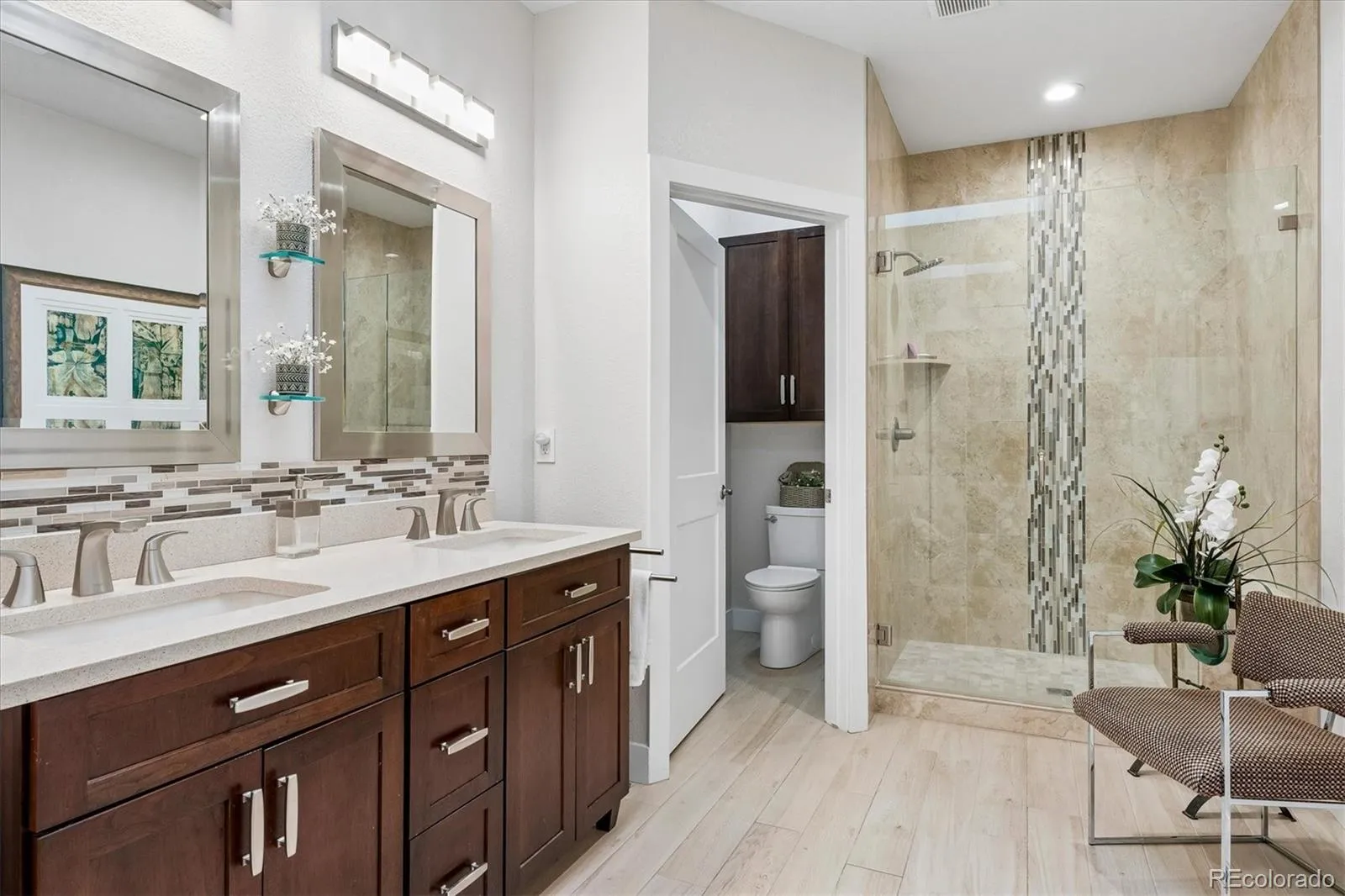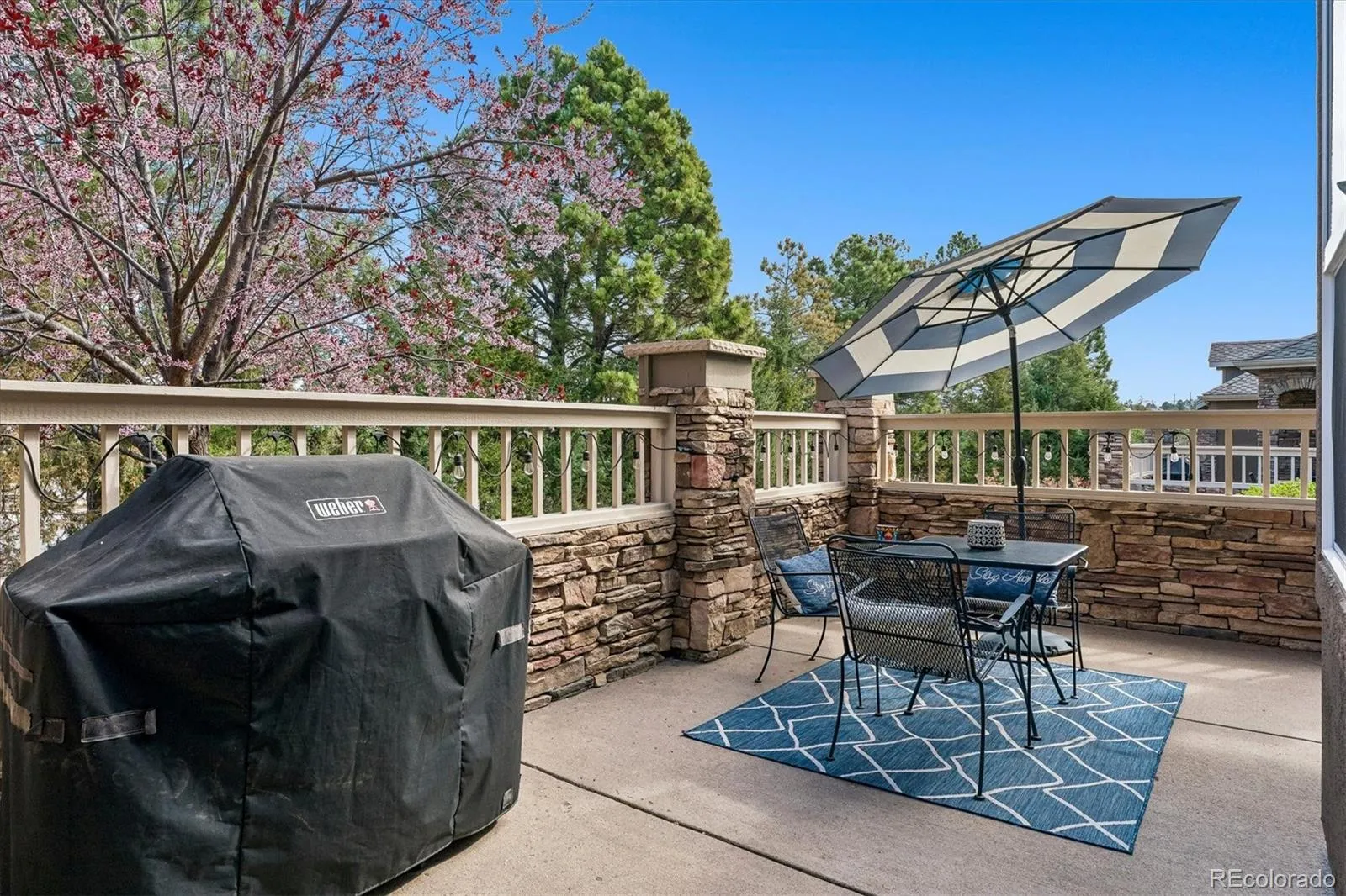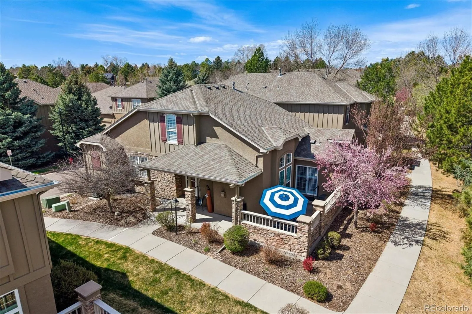 Take a look at this former model in Broadwick at Castle Pines North, perfectly set on a corner with a wraparound patio that feels private and tucked away. Lives like a ranch-style home and has a fantastic, easy-flow floorplan with just the right mix of style and comfort, the current owner has a great eye and has updated the home so it truly feels turnkey. From the moment you walk in you’ll notice the soaring two-story ceilings and engineered plank wood floors that run throughout the main level, creating an open, airy feel, the great room is warm and inviting with a gas fireplace, rock surround and mantel as the focal point. Shutters throughout add a clean, finished look, the dining space sits just off the kitchen making entertaining simple, and the remodeled kitchen really shines with quartz countertops, a waterfall edge, tile backsplash, breakfast bar, stainless appliances, gas cooktop, and a sliding door out to the patio for easy indoor-outdoor living, the primary suite offers a relaxing retreat with an updated bath featuring a spa-style shower with floor-to-ceiling tile, a skylight, and a walk-in closet with built-ins. The secondary bedroom is spacious with its own walk-in closet, and you’ll also appreciate the main level laundry with washer and dryer included and a built-in ironing board. Bonus upstairs, there’s a versatile loft with a full bath that works great as an office, gym, or extra living space, and if you need more room the unfinished basement is ready for your vision whether that’s additional living space, a home theater, or storage, the attached two-car garage includes built-in cabinets for storage, all of this just minutes to the pool, parks, trails, restaurants, and I-25, making it a super convenient location.