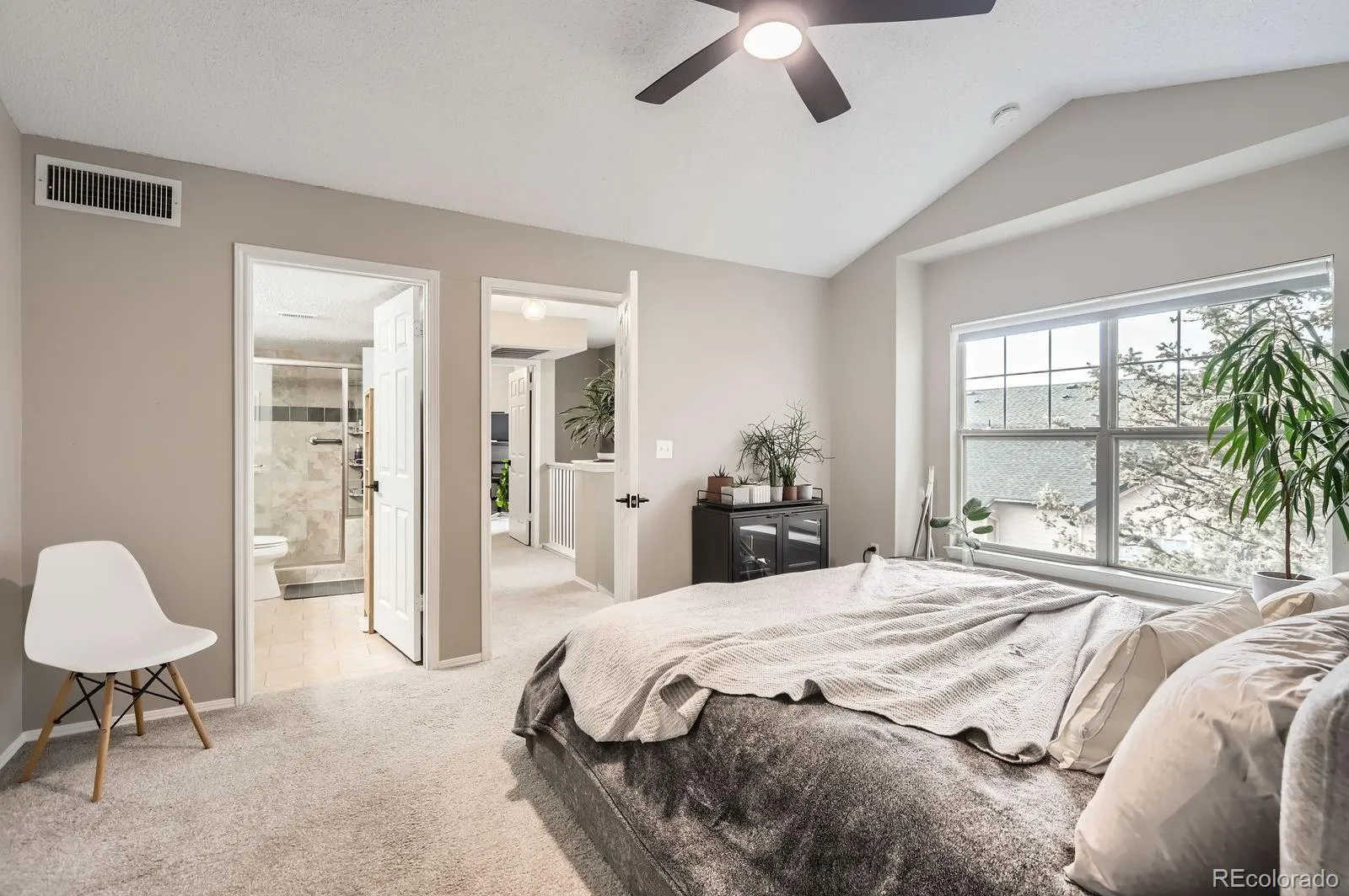 Filled with natural light, the home features an open, functional layout with added privacy from its end-unit location. The main level includes spacious living and dining areas, a bright kitchen, a full bathroom, and a generously sized bedroom—ideal for guests or a home office. Upstairs, the expansive primary suite connects to a shared en suite bathroom and is complemented by a comfortable secondary bedroom.