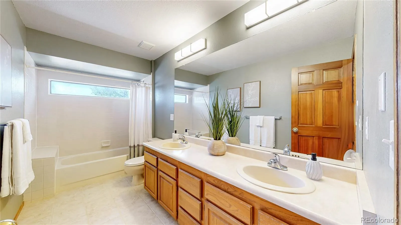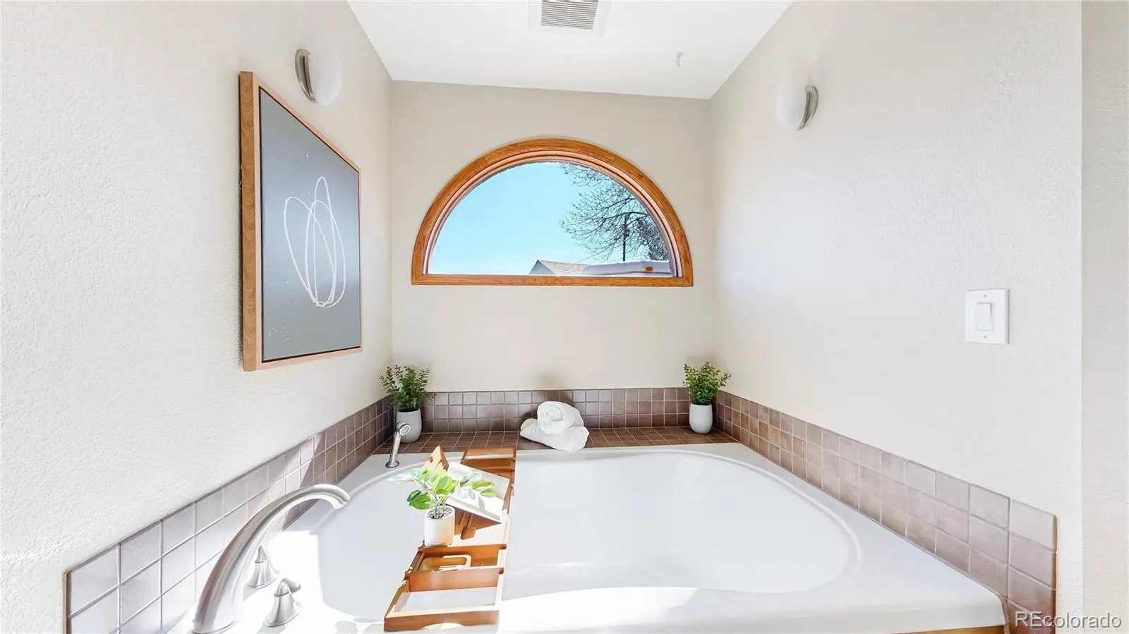 The 4-bedroom, 3.5-bath home features an open floor plan with vaulted ceilings and skylights that bring in natural light throughout the main level. The main-floor primary suite includes a soaking tub and separate shower.