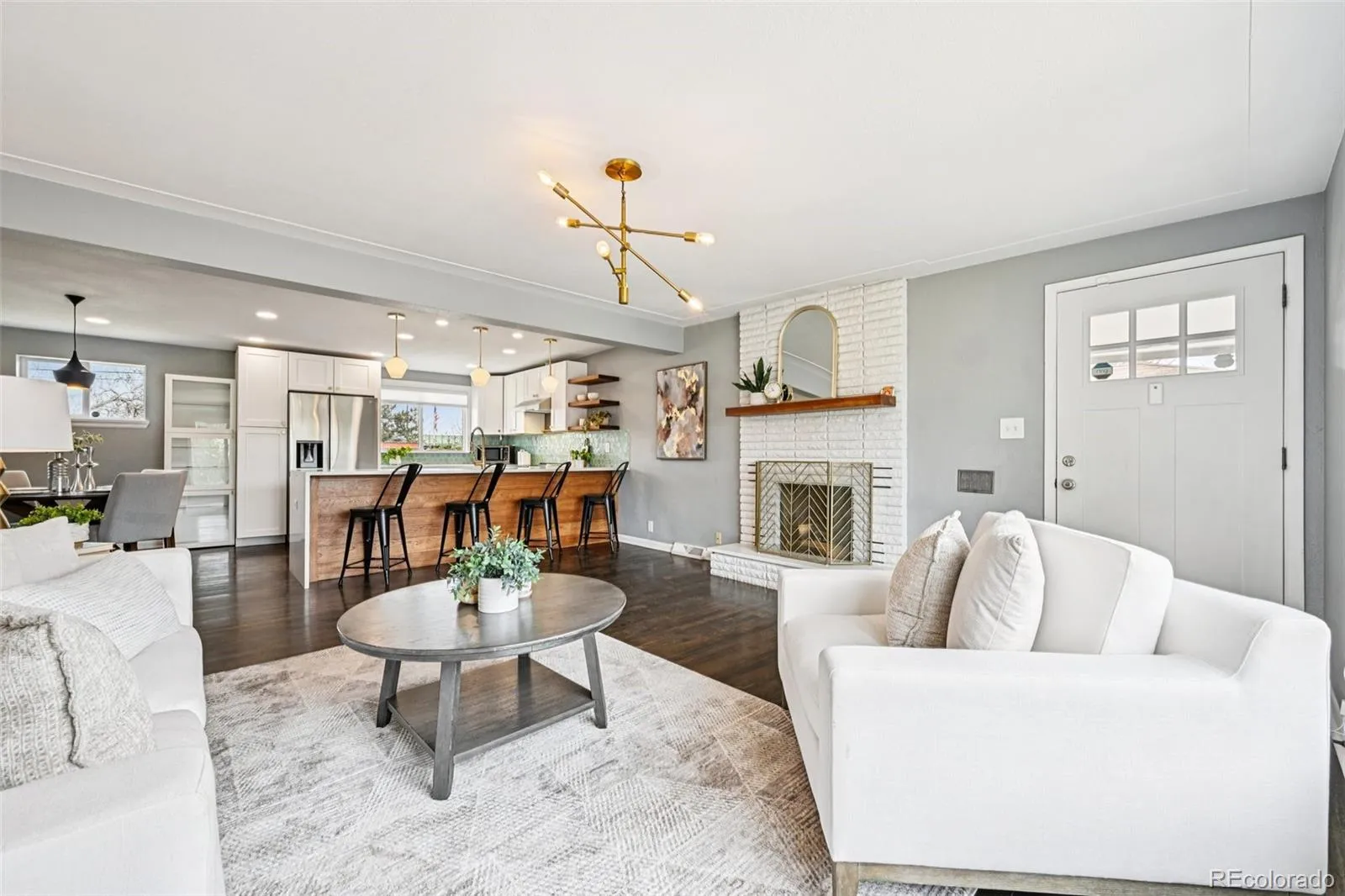 This bright and open ranch home features a smooth flowing floor plan highlighted by a beautifully updated kitchen. The living area is anchored by a charming painted brick fireplace with a warm wood mantel, creating an inviting focal point. The updated kitchen showcases crisp white cabinetry, sleek countertops, stainless steel appliances, gold-tone hardware, open wood shelving, and a large island with seating—perfect for gathering and entertaining.