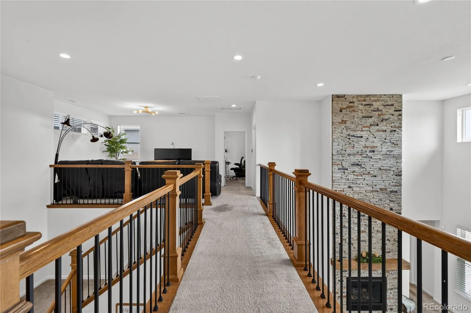 Set within Toll Brothers’ Allison Ranch Executive Collection, this upgraded home offers a rare combination of thoughtful design, premium finishes, and an open setting with no neighbors directly behind. Positioned on an east–west facing premium lot with southeastern views from the backyard, the home features an extended covered patio that creates a seamless indoor-outdoor connection. The main level is anchored by a dramatic two-story great room and a floor-to-ceiling stone fireplace, adding both warmth and architectural presence. The kitchen is designed for both function and style, featuring quartz countertops, an extended island, a single-bowl sink, a patterned backsplash, and a Whirpool appliance suite for a clean, modern finish. Wide-plank flooring and upgraded lighting carry throughout, complemented by iron stair railings and cohesive designer-selected finishes. The layout offers flexibility with a main-level guest bedroom and adjacent 3/4 bathroom, ideal for visitors or multi-generational living. The main floor primary suite stands out as a true retreat, featuring a spacious layout, a luxurious five-piece bath with upgraded finishes, and a large walk-in closet. Additional bedrooms and bathrooms upstairs continue the same level of detail and design. Additional features include a 3-car garage, dual HVAC system, finished garage space, ADT alarm with fire and smoke monitoring, and enhanced electrical and low-voltage upgrades. The backyard has been fully landscaped with a sprinkler system, solar lighting, and split-rail fencing with gopher netting, while the front porch and driveway have been resurfaced for a refreshed exterior. Located in a quiet, well-kept neighborhood with convenient access to an award-winning charter school, this home also includes kitchen appliances, blinds, window coverings, and select outdoor elements for a move-in-ready experience, plus a premium lot with added privacy and long-term value.