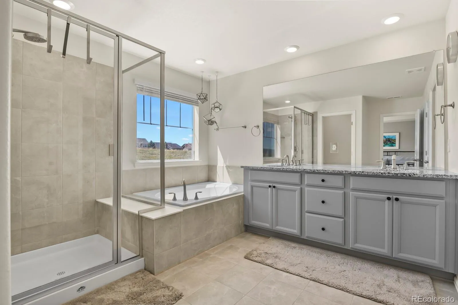 The primary suite is a true retreat, complete with a luxurious five-piece bathroom featuring dual sinks, a soaking tub, a separate shower, and a spacious walk-in closet.