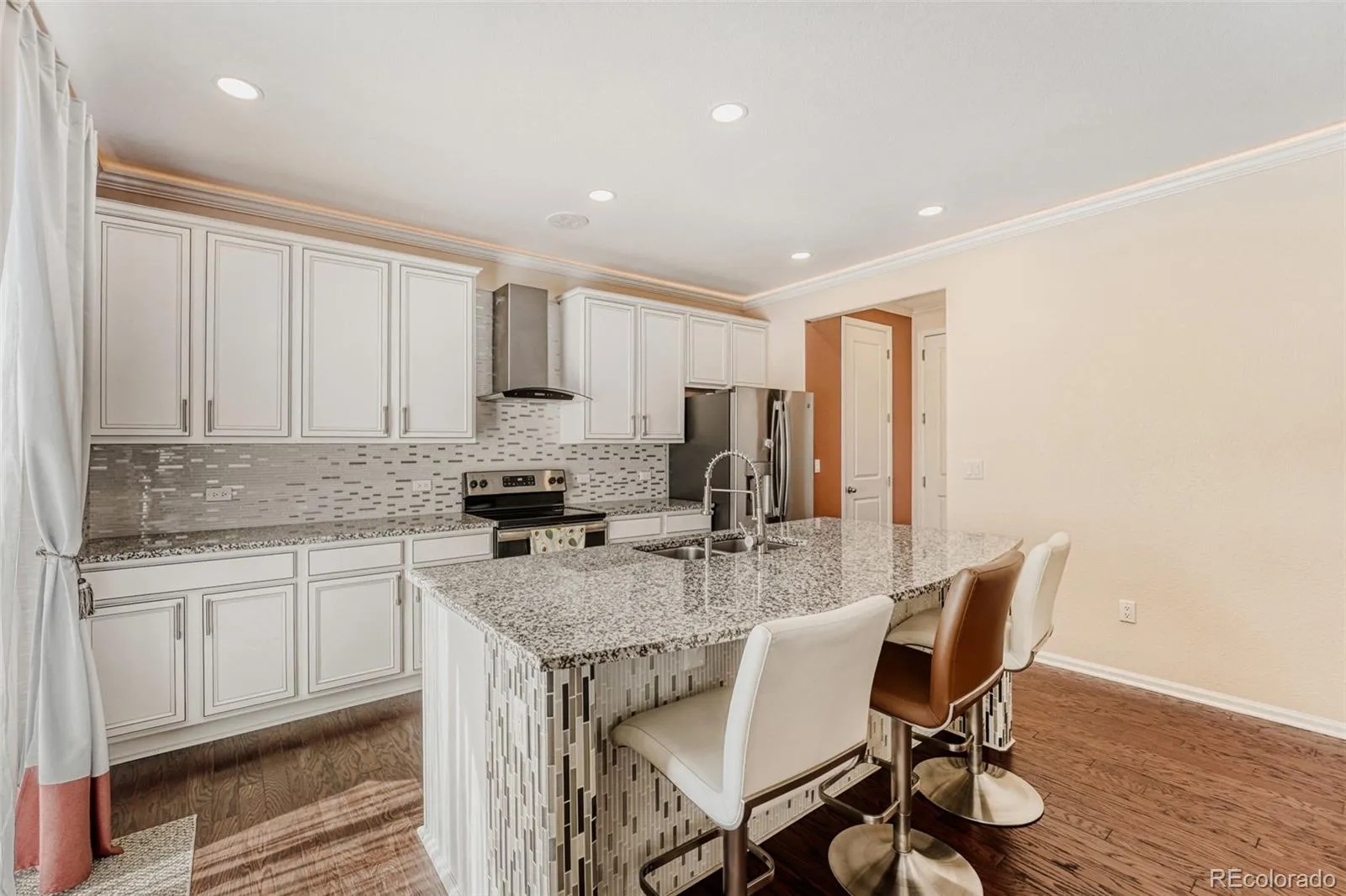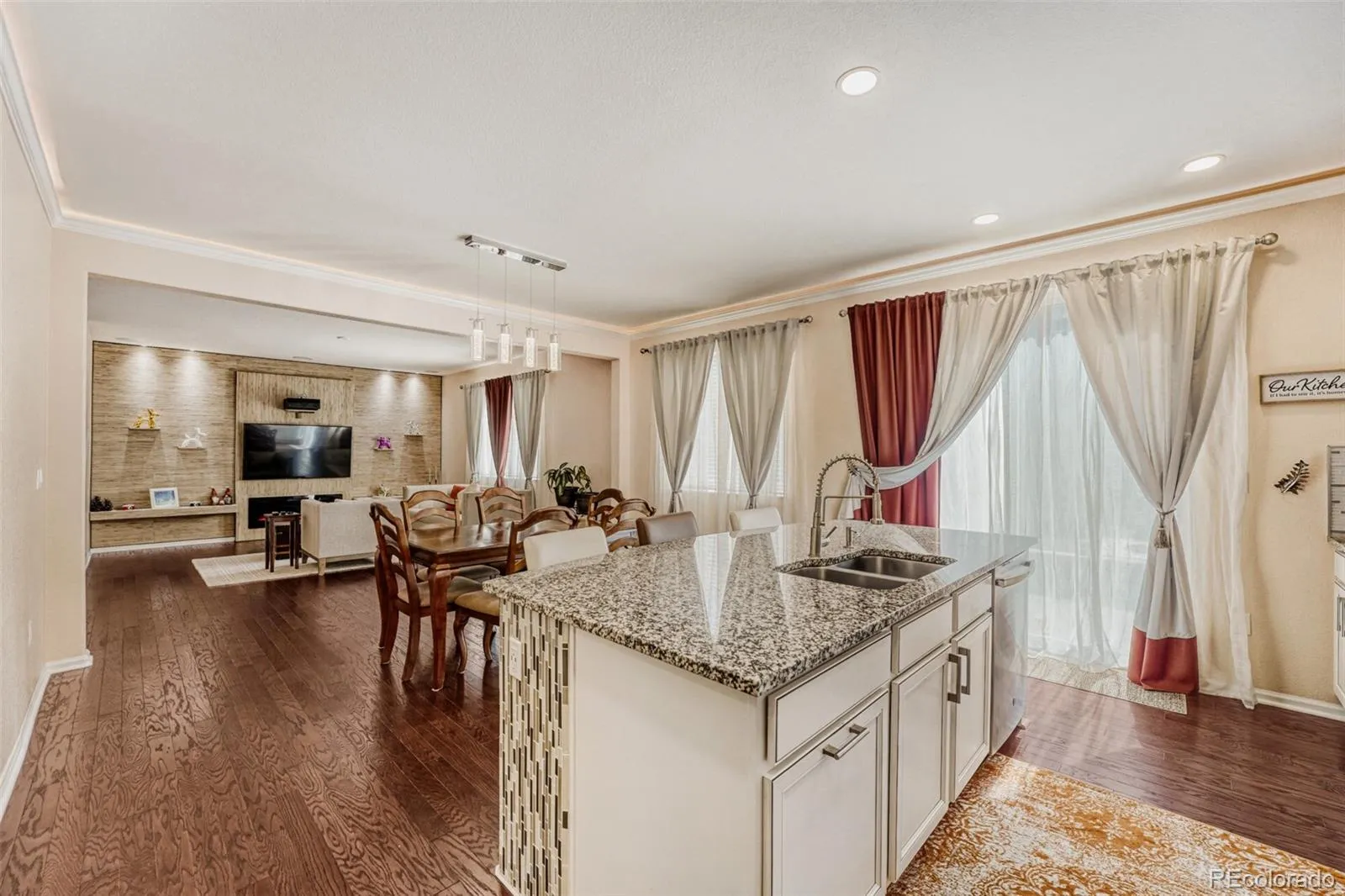 The heart of the home is a chef-worthy kitchen featuring a granite waterfall island, glass mosaic backsplash, stainless steel appliances, and white shaker cabinets with a designer range hood – perfect for entertaining. The adjacent living area showcases a custom stone accent wall with built-in electric fireplace and floating shelves, creating a warm focal point.