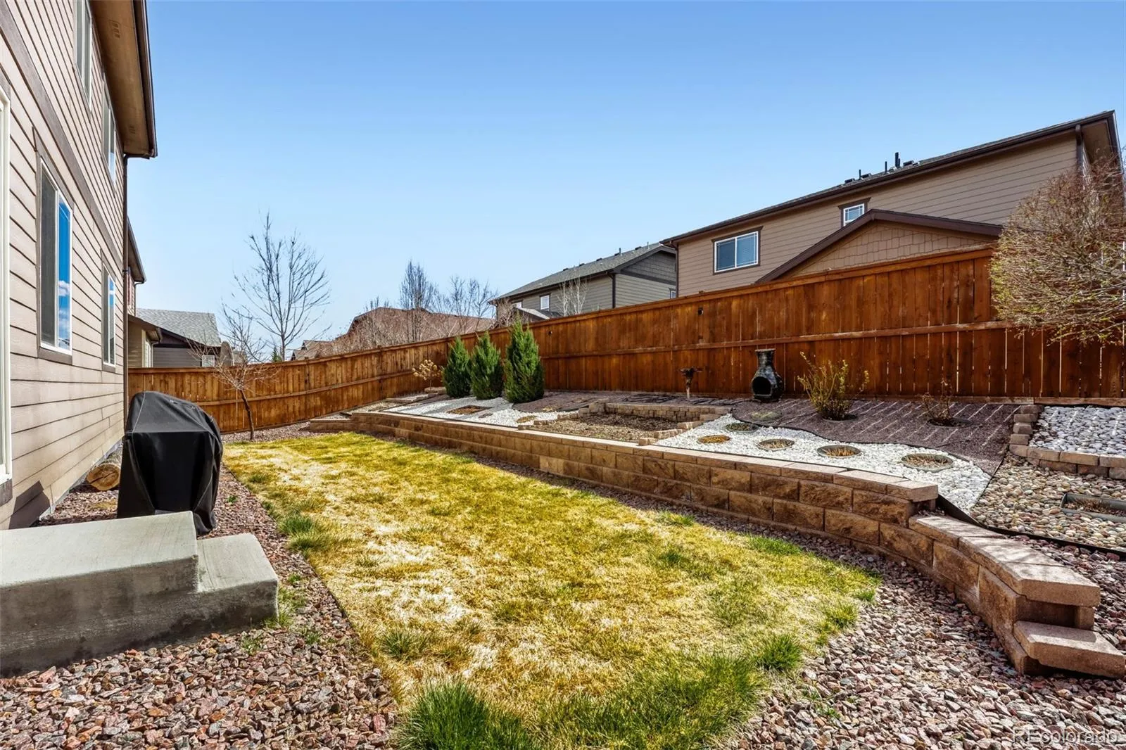 The heated, insulated garage features epoxy floors and built-in storage, while the fully fenced backyard includes tiered retaining walls, raised garden beds, xeriscape landscaping, and a sprinkler system to every plant.