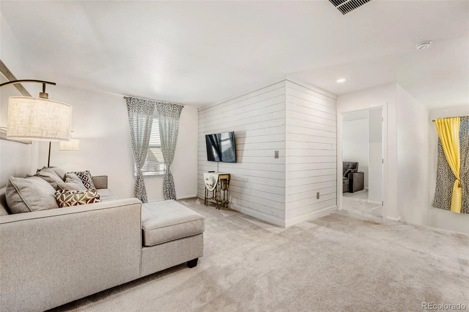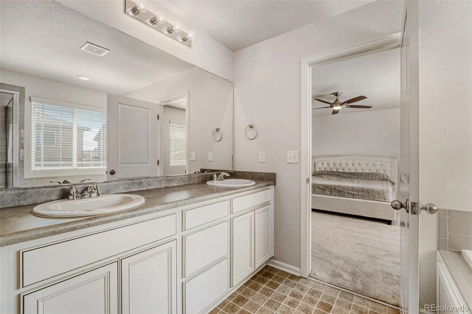 Upstairs, the spacious primary suite offers plush carpet, a tufted headboard, ceiling fan, and an ensuite with dual sinks, soaking tub, and glass-enclosed walk-in shower. A dedicated office with frosted glass doors doubles as a non-conforming 5th BR.