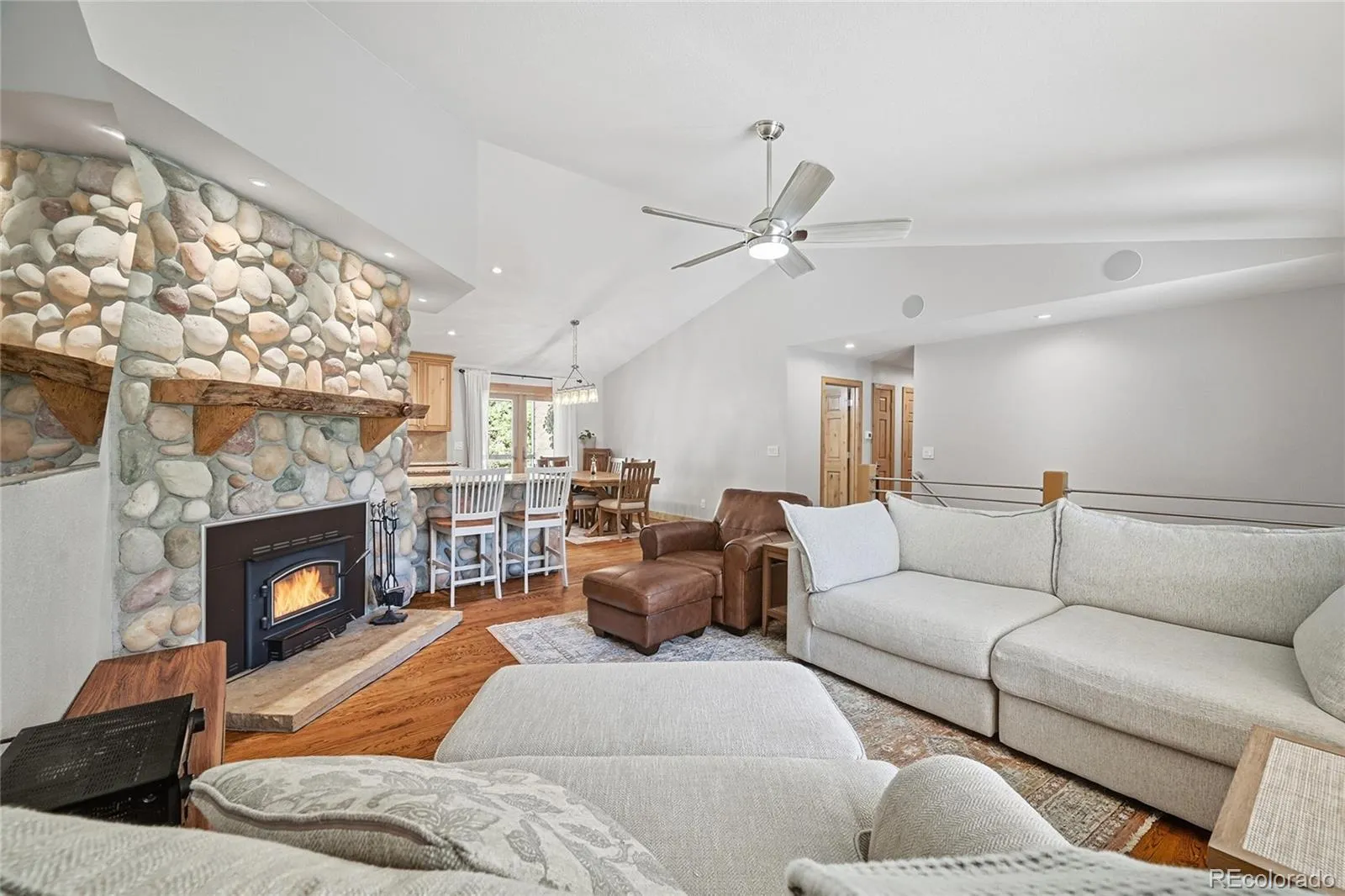 Rare Gambel Oaks Opportunity – A 6-Bedroom 3 Bath Ranch Luxury Home That Truly Stands Out! Some homes make you pause when you see them. This one does exactly that with its elegant stone, curb appeal with pine trees and a presence that feels elevated from the very first glance. This property sits in a cul-de-sac, south facing for snow melt, and does not have anyone to the east which makes this home unique and private. The inside of this home offers bright open living areas, and a layout designed for real life hosting, working from home, multi-generational living, or simply spreading out in comfort. What makes this home unforgettable is the light filled open main level with a beautiful flow of hardwood floors throughout, gourmet kitchen with granite stainless appliances (new dishwasher), elegant living and dining spaces for gatherings, main floor laundry for convenience, separate coffee/tea bar for your morning treat before the day gets started, 3 bedrooms (primary bath has heated floors) and 2 full baths. Off the kitchen is a fully covered large deck with lights and fan to create ambience and privacy. The basement is a full finished walkout with sliding glass door, new carpet, 3 additional bedrooms all spread out for privacy, 1 full bath and a bonus/storage room with a sink and full counter space. Additional features are reverse osmosis system, alarm system and water alarm system. The private back yard is an oasis with the seller adding landscaping. There is a full covered patio, mature pine trees, sprinkler system front/back and plenty of yard space. HOA covers water, trash, pool, picnic area with outdoor games/playground. Gambel Oaks offers 100 open acres for the community as well as a neighborhood horse arena. Horse boarding and additional storage available for rent if needed.