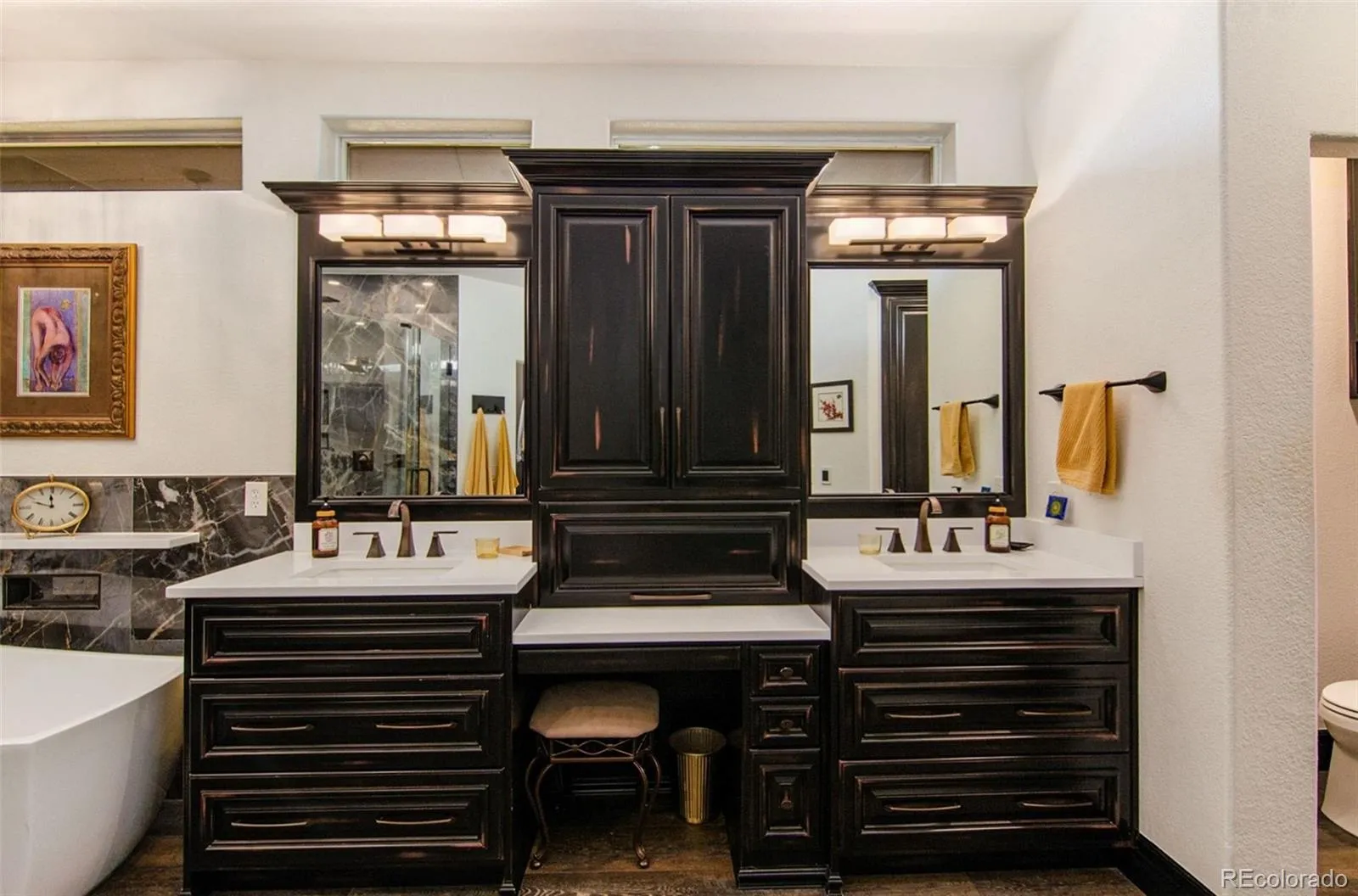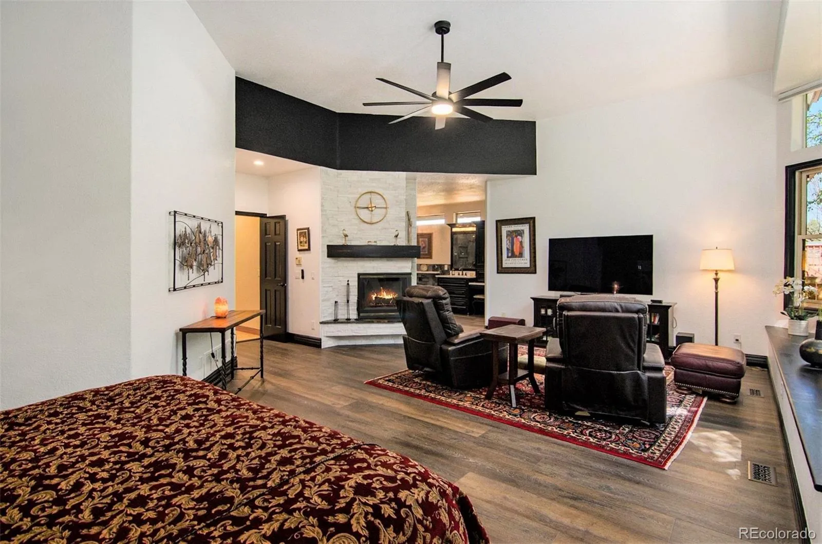 Spacious main-floor primary retreat with fireplace, spa-like bath with marble finishes, heated floors, dual walk-in closets, oversized shower, and soaking tub.