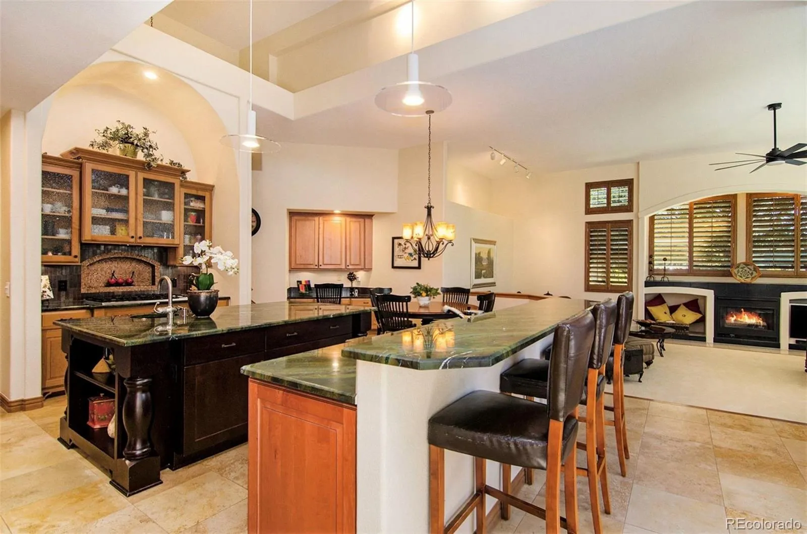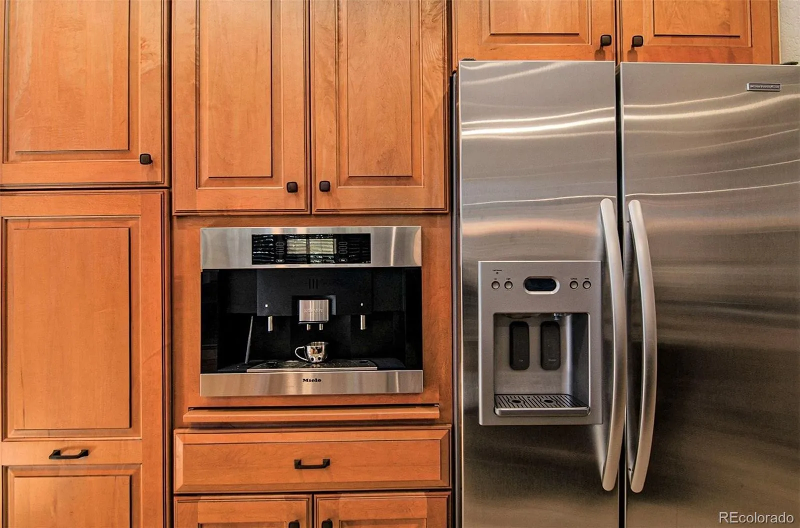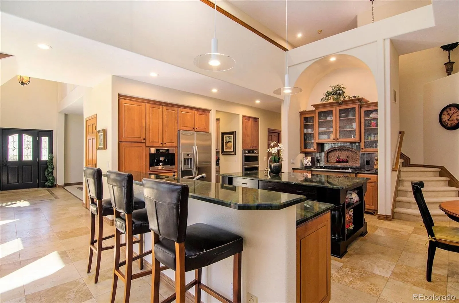 Custom gourmet kitchen with maple cabinetry, granite countertops, expansive center island with prep sink, breakfast bar, and eating space. Includes Viking gas range, stainless appliances, built-in Miele espresso system, wine cooler, and walk-in butler’s pantry.