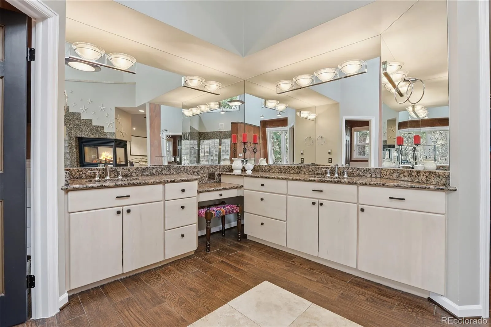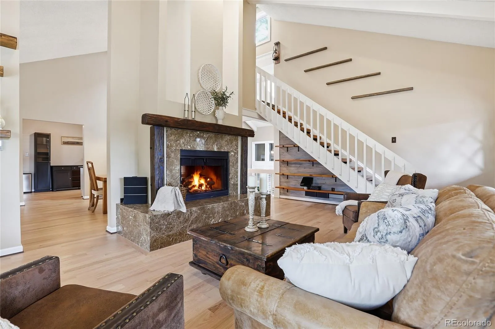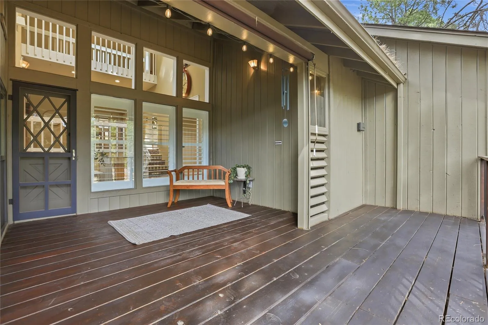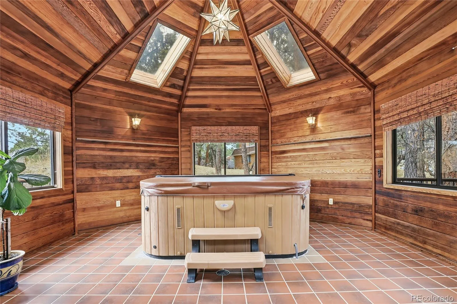 If you’ve ever said you actually want to enjoy where you live, then welcome home! Gracefully perched at the end of a private cul-de-sac, & enveloped by towering pine trees, this 4 bedroom, 4 bath residence is thoughtfully designed to balance grand-scale entertaining with intimate restorative living both inside and out. Soaring ceilings & beautiful hardwood floors set a tone of understated luxury, while bespoke details evoke the timeless charm of a Santa Fe-inspired mountain retreat. At the heart of the home, a chef’s kitchen anchors the living spaces, showcasing luxury Gaggenau double wall ovens & range, SieMatic cabinetry, complemented by a commercial-grade KitchenAid refrigerator & elegant granite surfaces. Gather in the substantial dining & living rooms with a striking double-sided fireplace, or step onto the expansive covered deck featuring a built-in grill, smoker, & beautifully appointed gazebo with private hot tub. The primary suite serves as a serene sanctuary, complete with its own fireplace, wet bar, custom built-ins, & spacious walk-in closet. The spa-inspired ensuite bath offers a soaking tub & walk-in shower – creating a true retreat in every sense. Two additional bedrooms each with their own baths share a private deck looking out onto the beautiful yard with a sunny lawn & shady pines. Wellness and productivity integrate effortlessly here. Enjoy the dedicated home gym & adjacent steam shower bath and a refined home office featuring custom built-ins and a wood-burning stove. A crow’s nest loft offers elevated perspectives while the finished basement offers additional room to stay and play. Soak up the best of Colorado living from the large back yard that leads you to 14 acres of open space. Set within the highly sought-after Pinery community, this home delivers the rare combination of privacy, character, and accessibility. Enjoy a lifestyle where nature & neighborly connection connect to the convenience of nearby amenities.