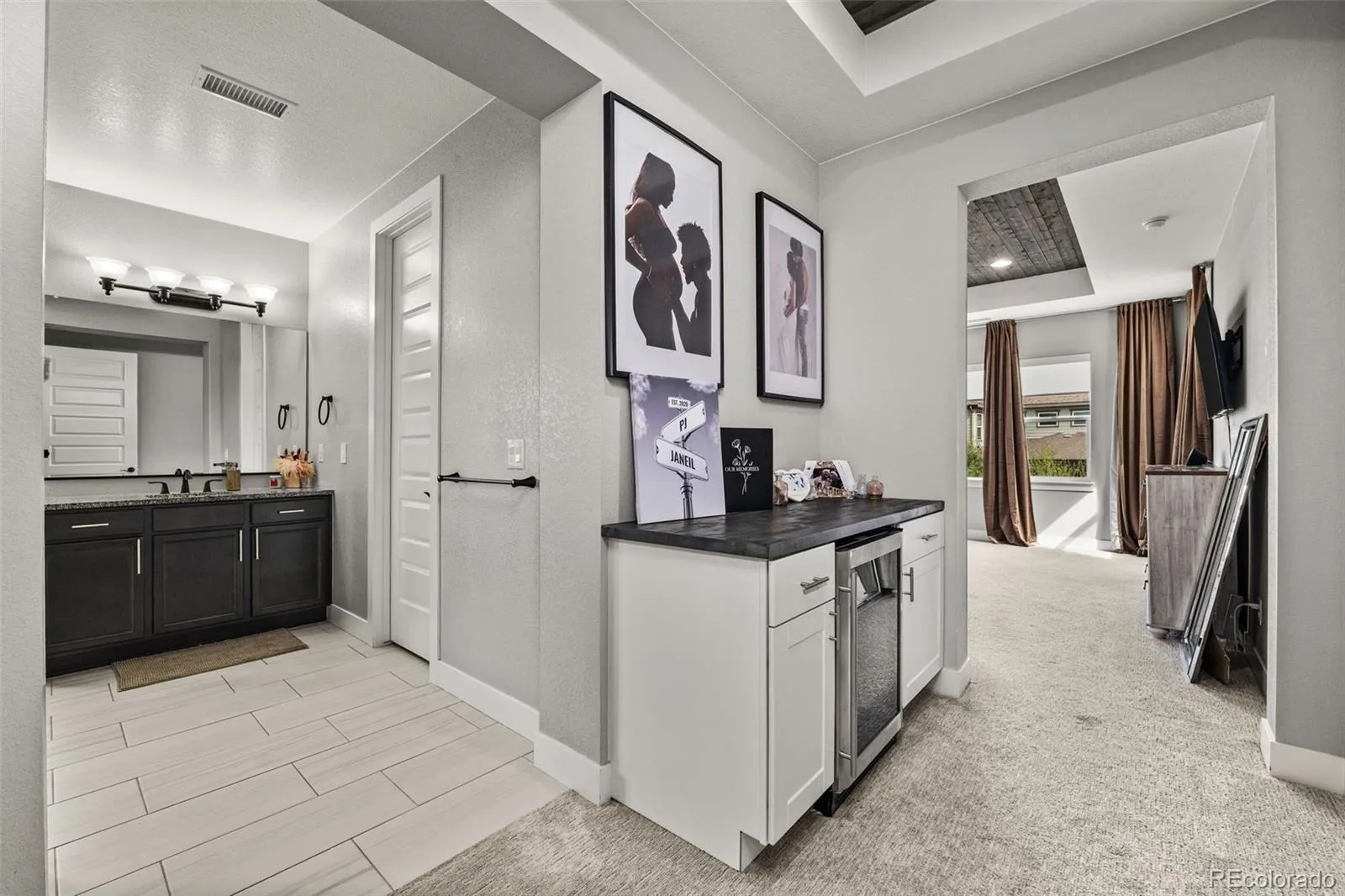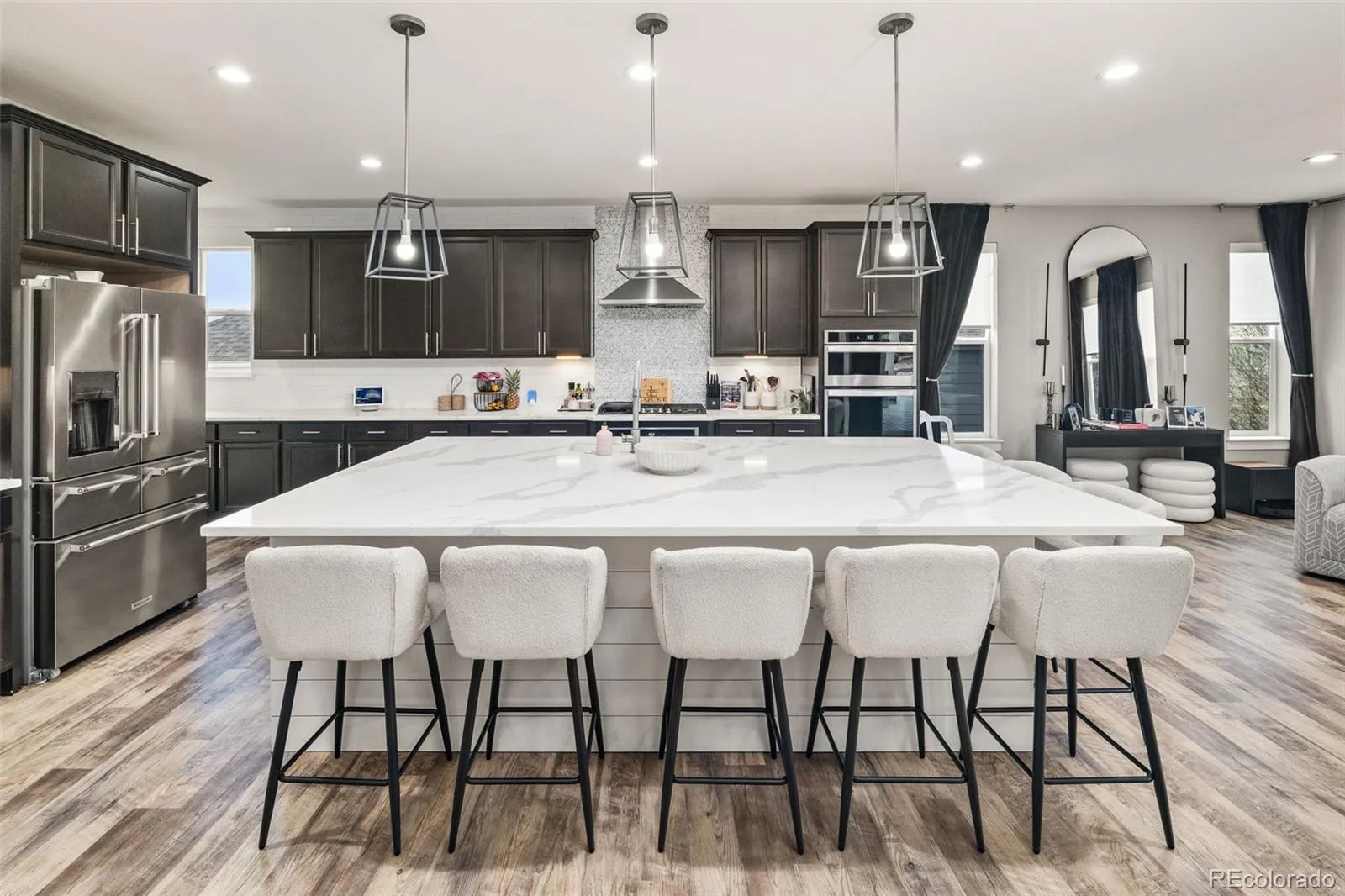 The chef’s kitchen is a true centerpiece, complete with high-end appliances, under-cabinet lighting, expansive counter space, and an impressive amount of cabinetry—perfect for both everyday living and entertaining.