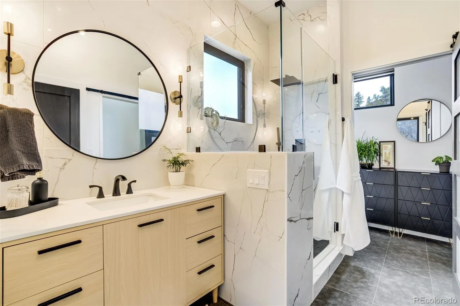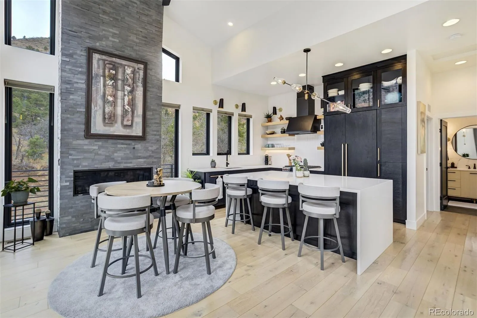 This luxury mountain retreat has a coveted Crystal Park Road location—just before the Crystal Park gated community—only 5 minutes to Manitou Avenue and Highway 24. Enjoy the best of mountain living without the long commute. Set on 2.54 acres with mountains on three sides, this remarkable contemporary home offers breathtaking panoramic views and direct access to the Intemann Trail—your backyard truly becomes your playground. Built in 2023, the home blends modern design with natural surroundings, featuring soaring vaulted ceilings, abundant natural light, and high-end finishes throughout. The custom kitchen showcases paneled front appliances seamlessly integrated into cabinetry, and waterfall quartz countertops creating a clean, sophisticated aesthetic. The main-level primary suite offers a fully tiled bath with quartz countertop and spacious walk-in closet. Step outside to the expansive 652 sq ft deck complete with KE Elite Plus awnings with drop valance —an extension of your living space—perfect for dining, relaxing, and taking in the surrounding beauty. The lower-level features two additional bedrooms and a luxurious bathroom complete with a soaking tub and oversized shower. A second kitchen/laundry area, mudroom entry from the fully finished and insulated garage, and thoughtful layout provide flexibility and convenience. Additional upgrades include Hunter Douglas window coverings throughout (with blackout option in lower-level and master bedrooms), and a carport designed to accommodate oversized vehicles. A rare opportunity to own a modern mountain retreat with unmatched access, views, and convenience.