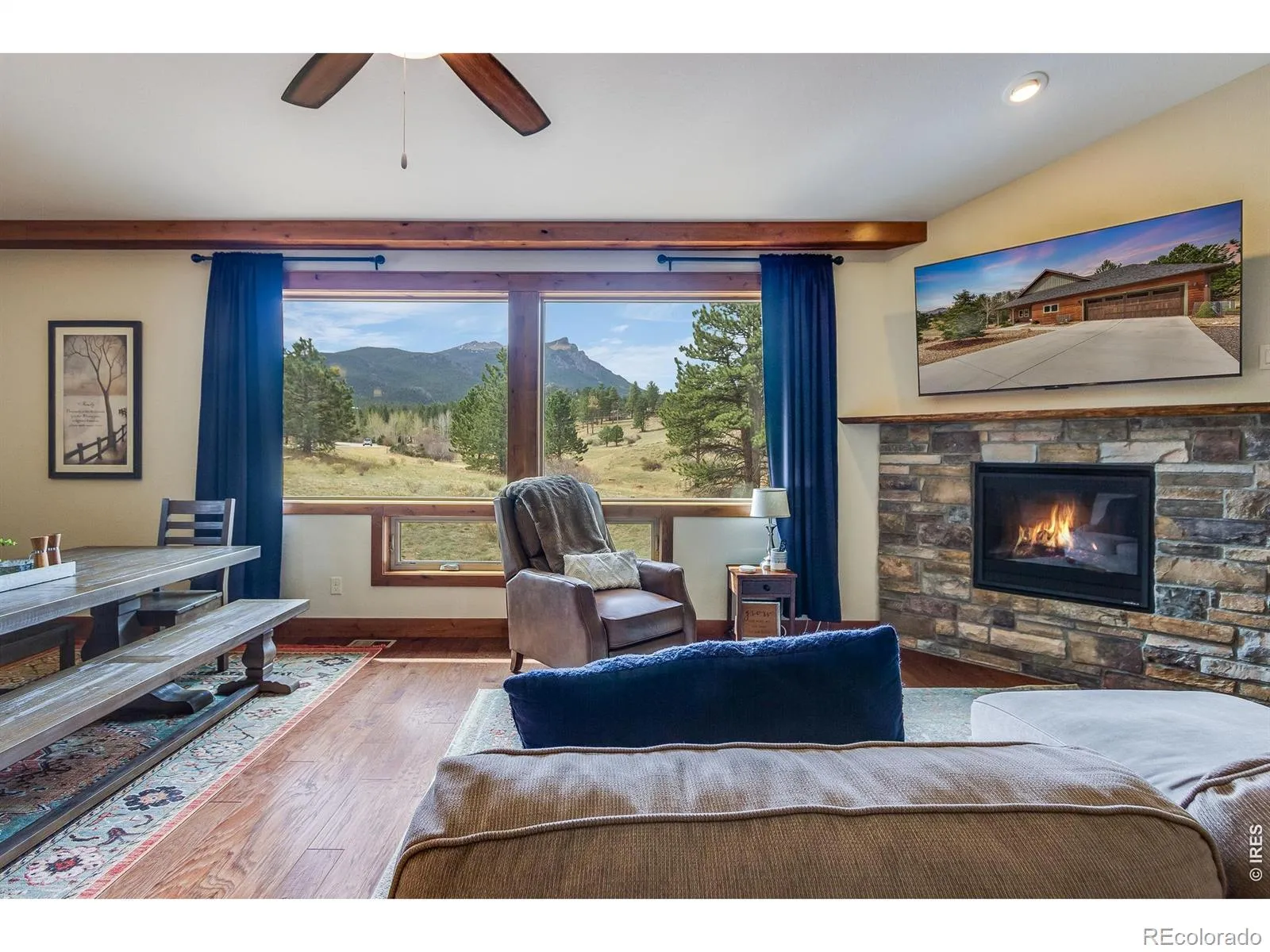 Discover the ultimate mountain sanctuary where modern luxury meets the rugged beauty of the Rockies. Situated beside a large conservation easement, this home offers the rare luxury of expansive views and privacy, extending the 1/2 acre retreat to miles and miles of the views and serenity of its surrounding natural beauty. This meticulously maintained residence offers a sophisticated lifestyle in a serene, treed setting. As you step inside, the open-concept great room greets you with soaring vaulted ceilings, dramatic timber beams, and rich wood floors that glow under an abundance of natural light. The heart of this home is a chef’s dream kitchen, designed for both daily life and entertaining. It features expansive granite countertops, premium stainless-steel appliances, and a center island that serves as a natural gathering spot. Whether you’re hosting a holiday dinner in the spacious dining area or enjoying a quiet morning coffee by the stone fireplace, every corner of this main level feels connected to the stunning landscape just outside your windows. Versatile lower-level bedrooms offer flexibility for your lifestyle. Retreat to the primary suite-a true private oasis featuring large picture windows and a spa-inspired ensuite complete with dual stone vanities, and contemporary fixtures. The walk-out lower level expands your living space significantly, offering a versatile recreation room perfect for a home theater, gym, or guest wing. The outdoor amenities truly set this property apart. Step out onto the expansive composite deck to take in the crisp mountain air and frequent local wildlife sightings. The rare, fully fenced backyard is an outdoor paradise, featuring a private patio for year-round relaxation. With an oversized 2-car garage providing ample storage for all your mountain gear, this home is a rare find. Minutes from the gates of Rocky Mountain National Park and the vibrant culture of downtown, this is the Estes Park retreat you’ve been waiting for.