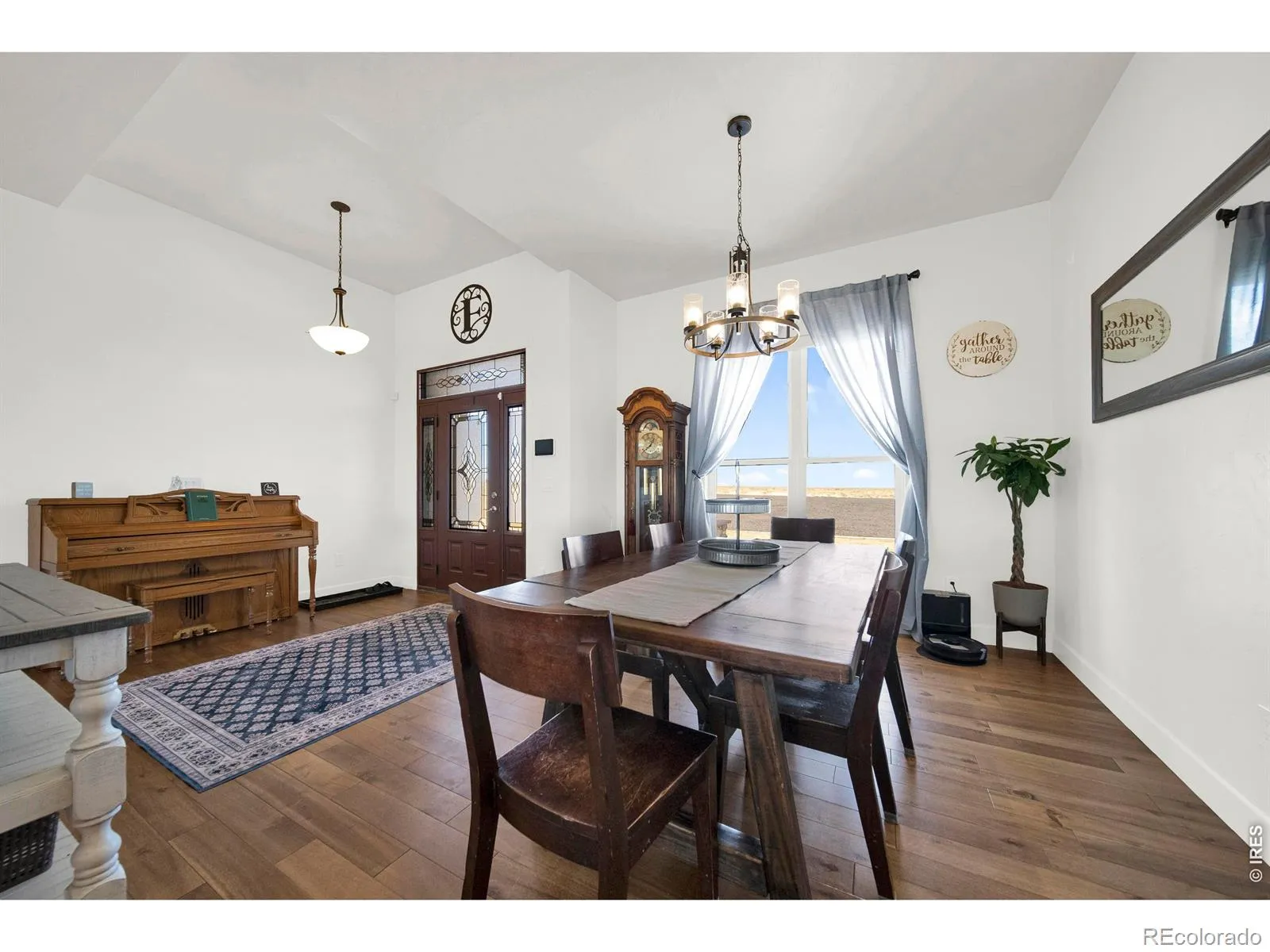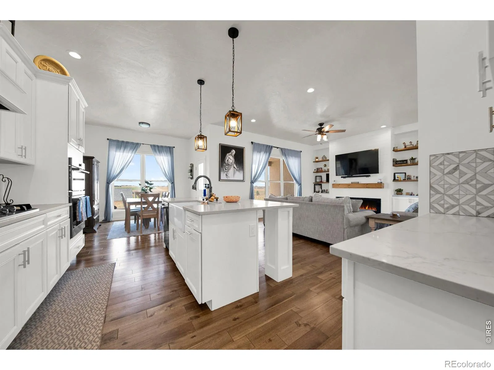Beautiful Views! Custom Home on 3.61 Acres with Shop! Open-concept design with stunning hardwood floors throughout the main level. Gourmet eat-in kitchen features quartz countertops, breakfast bar, 5-burner gas cooktop with pot filler, farmhouse sink, built-in oven, and both walk-in and butler’s pantries. Living room offers electric fireplace and automatic blinds. Formal dining area. Split floor plan with spacious primary suite featuring a large walk-in closet, soaking tub, and luxurious shower. Two additional main-level bedrooms. Finished basement includes oversized family/recreation room with dry bar, built-in vault, 2 additional bedrooms, and office. Enjoy outdoor living with large covered patio, covered dining area, outdoor kitchen, fire pit, in-ground trampoline, and dog run. 40′ x 50′ heated shop with golf simulator, oversized 2-car attached garage, and plenty of space for animals. Tankless water heater and radon mitigation system.