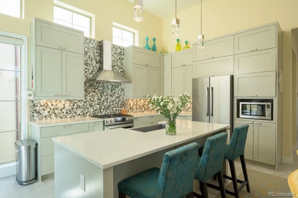 The kitchen seamlessly connects indoor and outdoor living, with direct access to a private patio overlooking the greenbelt and Green Mountain, ideal for entertaining or relaxing in a peaceful open-space setting. Upstairs, a loft offers flexible space for an office or retreat, complemented by generously sized two secondary bedrooms and a full bath.