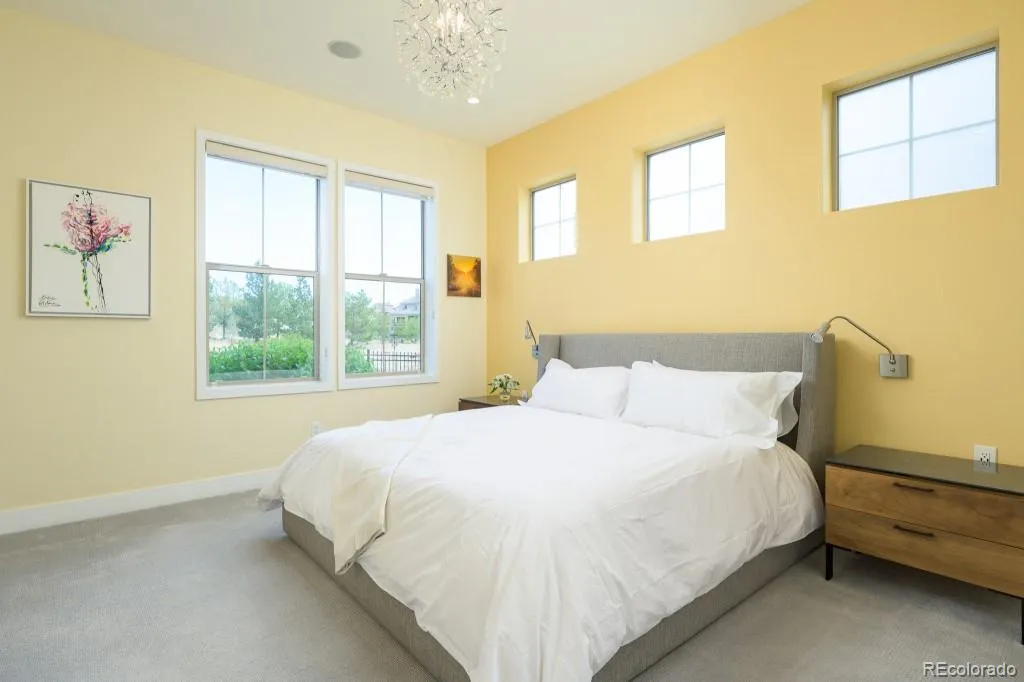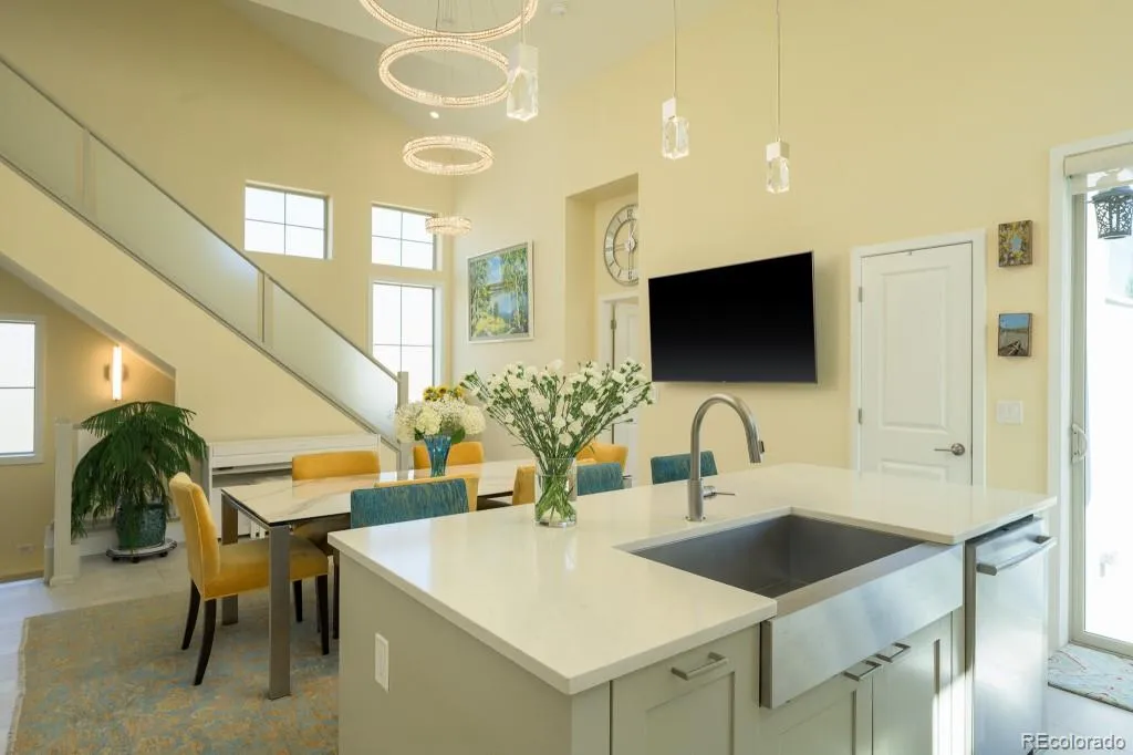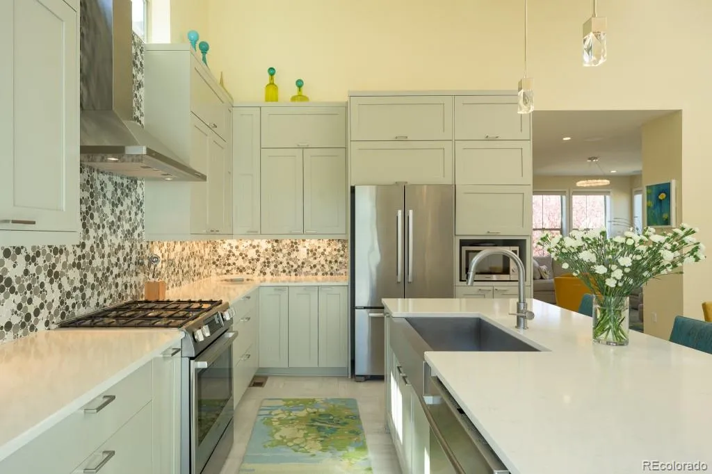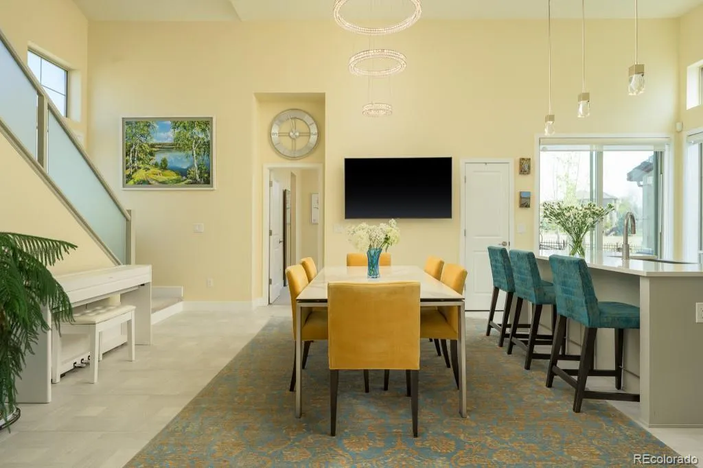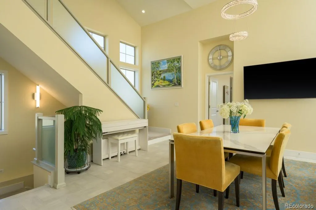 Spanning over 3,000 sq ft, the home features a bright open-concept floor plan with soaring ceilings, expansive windows, and designer finishes throughout. The main-level primary suite and laundry add a level of convenience rarely found in comparable homes. The living area is anchored by a gas fireplace and framed by stunning Front Range views, creating a warm yet refined atmosphere.