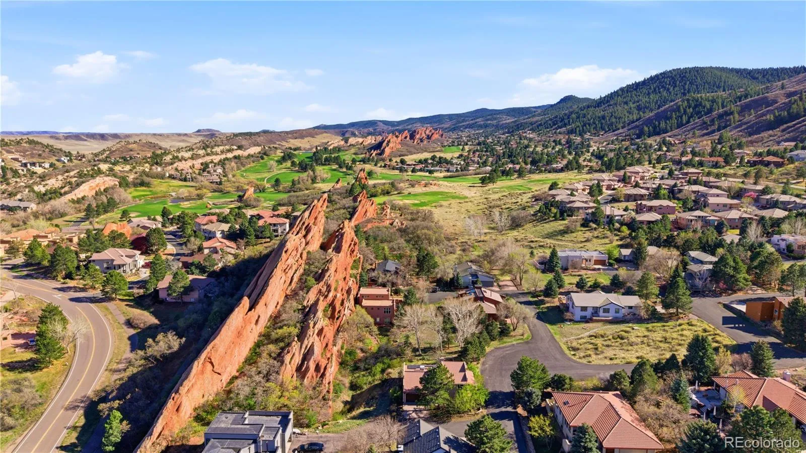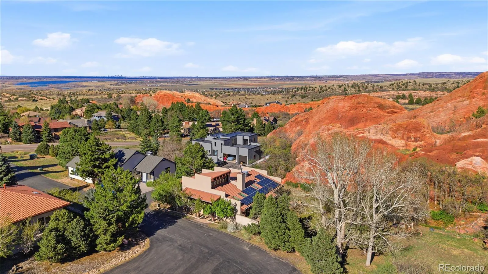 Welcome to your private Colorado luxury retreat in the heart of Roxborough Park, where striking Southwestern design meets unforgettable natural beauty. Perfectly positioned against one of Colorado’s iconic red rock formations— partially incorporated into the property itself—this extraordinary home offers a setting that feels both dramatic and serene. At the base of the rock, this idyllic home creates a place to relax, entertain, and take in the surrounding wildlife and scenery. Designed with sustainability in mind, the home features passive solar design with Trombe walls, solar panels, and expansive windows and skylights that flood the interior with natural light while enhancing year-round efficiency. A wood-burning stove adds warmth and ambiance, complementing the home’s thoughtful, eco-conscious design. Inside, distinctive architectural elements set the tone—from exposed wood beams and repurposed hardwood floors to a stunning spiral staircase and expansive loft overlooking the primary suite. This is a true sanctuary by itself, complete with a generous walk-in closet, steam room, and direct access to a secluded patio with a hot tub, offering a spa-like escape. This oversized lot is a breathtaking oasis featuring a stamped concrete patio, a pea-gravel firepit area, mature trees, and a hidden Trex deck at the base of the iconic red rock—making it one of the most unique properties in the Front Range. Additional highlights of this meticulously maintained home include abundant storage throughout and a large two-car garage with a walk-in storage closet, which are ideal features for your Colorado lifestyle. Ideally located just minutes from the iconic Arrowhead Golf Course, Waterton Canyon, Chatfield Reservoir, and nearby retail and dining, this home offers the perfect balance of secluded tranquility and everyday convenience. A rare offering that seamlessly blends luxury, privacy, and the rugged elegance of its natural surroundings—this is Colorado living at its finest.