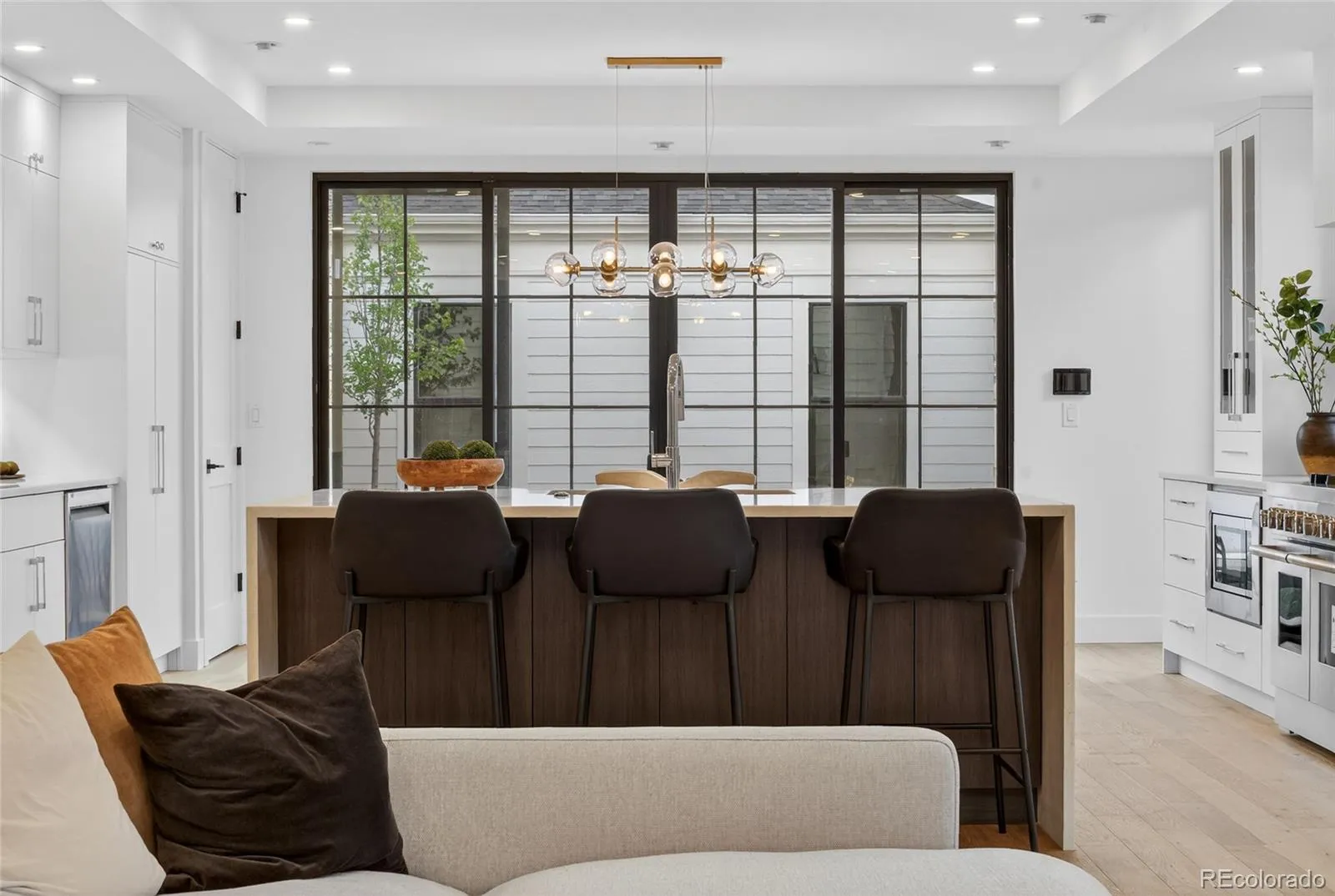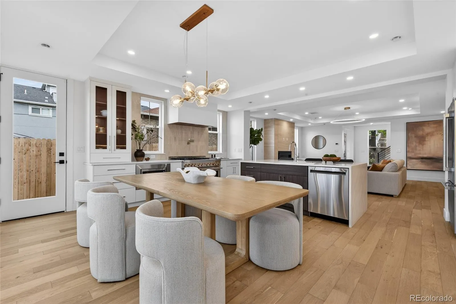 The main level features wide-plank hardwood floors, coffered ceilings, a gas fireplace, and a front-positioned staircase that creates a wider, more functional feel. The chef’s kitchen offers a JennAir appliance suite, custom white oak cabinetry, quartz island, and floor-to-ceiling storage. An oversized sliding door opens to a landscaped backyard with hydrangeas and a spacious patio for seamless indoor-outdoor living.