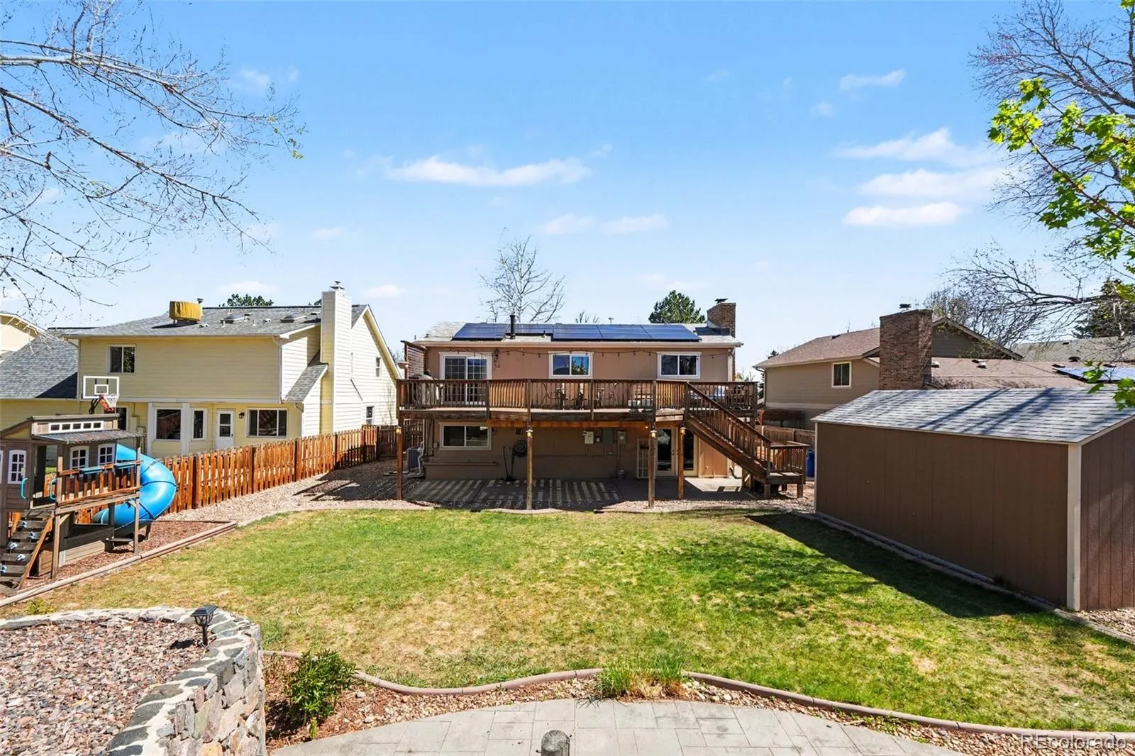 This beautifully updated 3-bedroom, 3-bath home offers exceptional indoor and outdoor living spaces designed for both comfort and entertaining. The upper level welcomes you with a bright, open-concept layout featuring a living room, dining area with ceiling fan, and kitchen equipped with newer stainless steel appliances and a range hood. A versatile hall closet currently functions as a pantry with removable shelving for optional coat storage. The dining area opens double doors to an expansive elevated deck—perfect for entertaining and enjoying stunning mountain views. The primary suite is conveniently located on the upper level and features a custom closet and a fully remodeled en-suite ¾ bath. A second bedroom and an upgraded full hall bathroom complete the upper level, with both bedrooms offering ceiling fans for added comfort. The lower level provides functional and flexible living space, including direct access to the garage and a laundry closet with new doors. A hallway leads to a dedicated office/flex space with a full-size window, as well as a guest bedroom with its own window and closet. On the opposite side, the inviting family room features a cozy fireplace and ample seating space, along with an updated half bath. New French doors open to a large covered patio and a spacious, landscaped backyard. Outdoor features continue to impress with an oversized 20x12x11 shed, a custom rock wall, and a built-in fire pit. The upper yard offers additional space for gardening. Beyond the back fence, enjoy direct access to the scenic Ralston Creek Trail, providing connectivity to Golden and east Arvada. Additional highlights include: High-efficiency HVAC system, electric panel, water heater, and thermostat (2022), Solar panels (2022)average energy bill approx. $35/month, New attic/roof insulation (2021), Gated RV parking next to garage. This home combines thoughtful upgrades, versatile living spaces, and an unbeatable outdoor setting—ready for you to move in and enjoy.