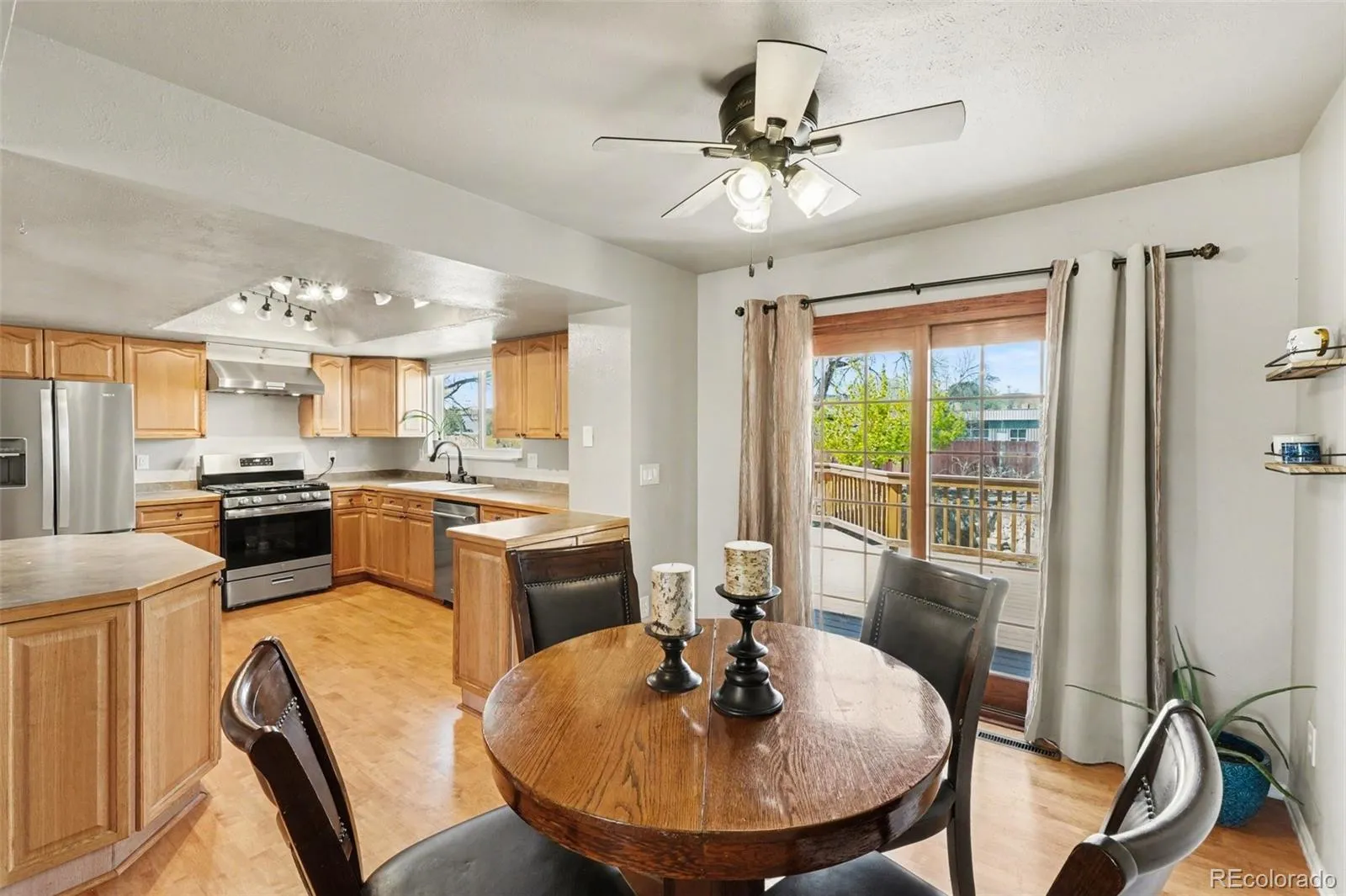 This beautifully updated 3-bedroom, 3-bath home offers exceptional indoor and outdoor living spaces designed for both comfort and entertaining. The upper level welcomes you with a bright, open-concept layout featuring a living room, dining area with ceiling fan, and kitchen equipped with newer stainless steel appliances and a range hood. A versatile hall closet currently functions as a pantry with removable shelving for optional coat storage. The dining area opens double doors to an expansive elevated deck—perfect for entertaining and enjoying stunning mountain views. The primary suite is conveniently located on the upper level & features a custom closet and a fully remodeled en-suite ¾ bath. A second bedroom and an upgraded full hall bathroom complete the upper level, with both bedrooms offering ceiling fans for added comfort. The lower level provides functional and flexible living space, including direct access to the garage & a laundry closet with new doors. A hallway leads to a dedicated office/flex space with a full-size window, as well as a guest bedroom with its own window and closet. On the opposite side, the inviting family room features a cozy fireplace and ample seating space, along with an updated half bath. New French doors open to a large covered patio and a spacious, landscaped backyard. Outdoor features continue to impress with an oversized 20x12x11 shed, a custom rock wall, & a built-in fire pit. The upper yard offers additional space for gardening. Beyond the back fence, enjoy direct access to the scenic Ralston Creek Trail, providing connectivity to Golden and east Arvada. Additional highlights include: High-efficiency HVAC system, electric panel, tankless water heater, and thermostat (2022), Solar panels (2022)average energy bill approx. $35/month, New Roof (2023), New attic/roof insulation (2021), Radon Mitigation, Gated RV parking next to garage. This home combines thoughtful upgrades, versatile living spaces, and an unbeatable outdoor setting!