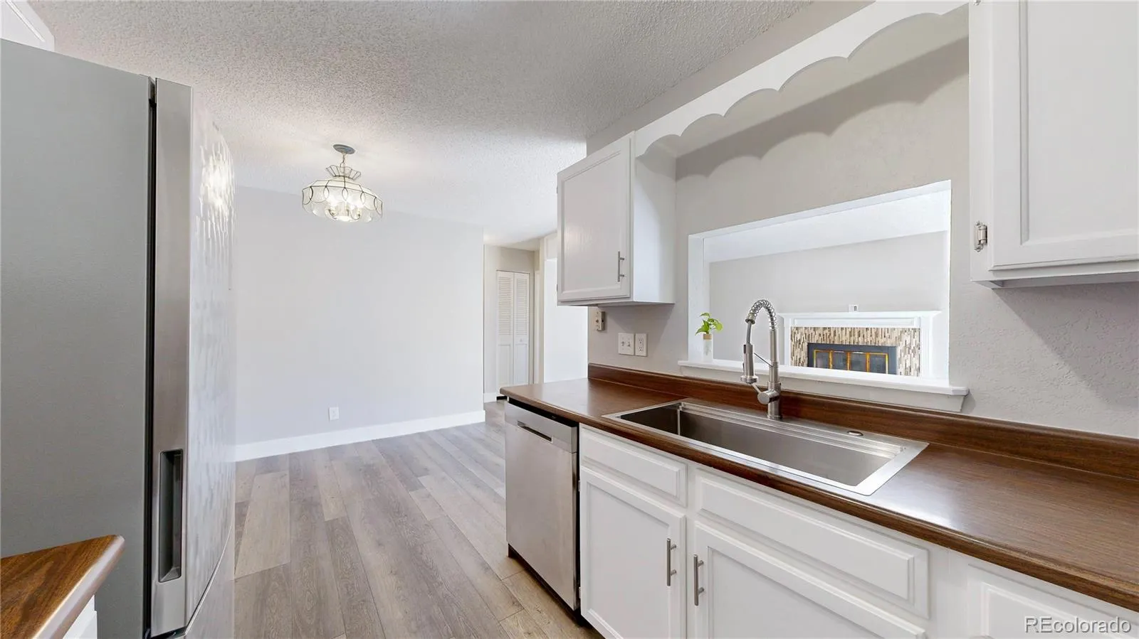 The kitchen offers generous cabinet space and flows into a comfortable dining area and open living room with a cozy wood burning fireplace overlooking the private patio and updated LVP flooring throughout.