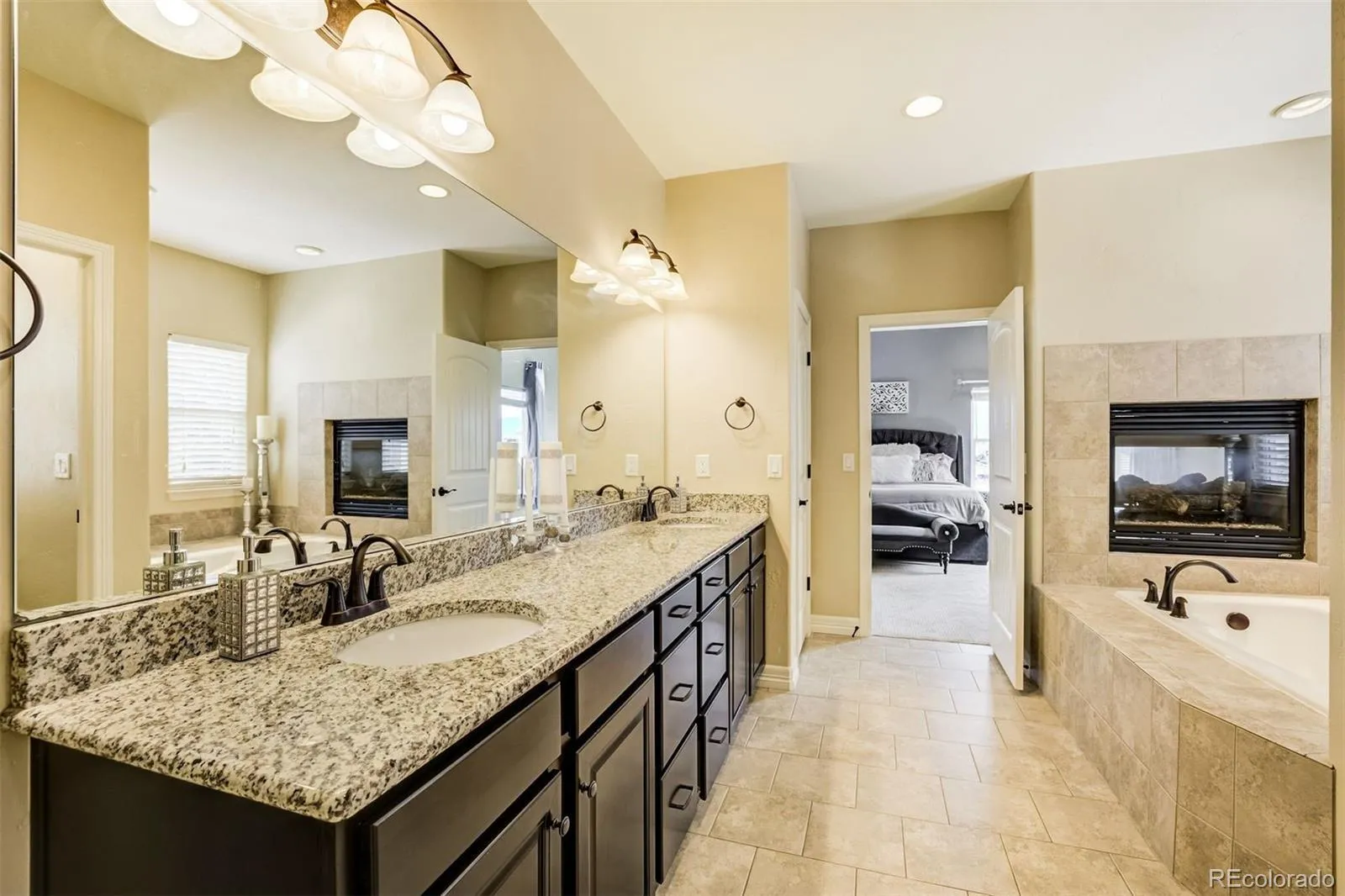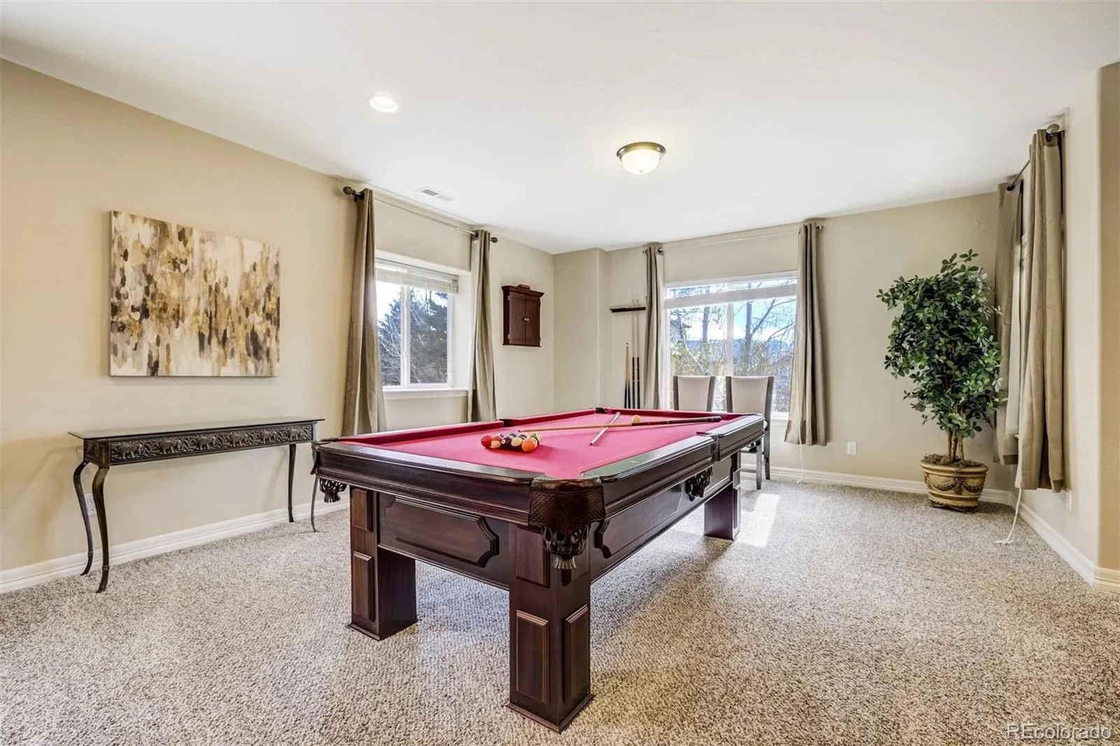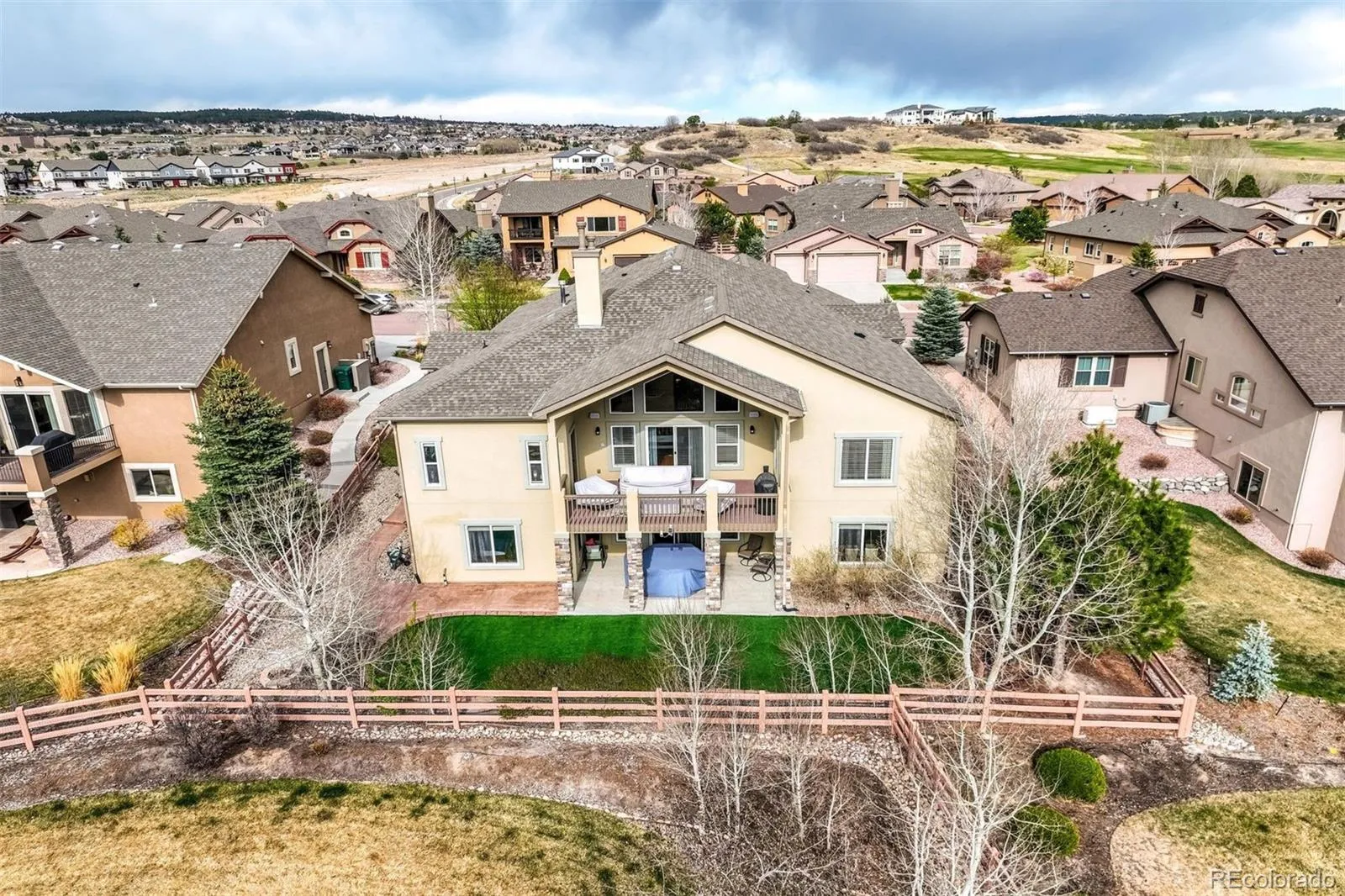 The One for Elevated Living, with commanding covered deck, kitchen and great room views of Pike’s Peak, USAFA and the glorious Colorado Front Range. Generous spaciousness brings in flowing natural light to the entirety of the home, and genuine hardwood flooring provides enduring value and warmth. Three main level bedrooms with two additional bedrooms in the basement accommodate a host of applications, with the primary suite embracing the westerly views and enjoying it’s own private access to the rear deck. A dreamy closet measuring 11×12 feet is attached to the main level laundry. Two other main level bedrooms share a bath on the opposite side of the main level. In the lower level, a second primary en suite (no window well) has it’s own grand walk-in closet, while the fifth bedroom is alongside a full bath with wonderful natural southern exposure. The kitchen includes a massive island with seating for up to five at the bar, a gas range with hood plus a 2nd wall oven and microwave, and a wonderfully casual eating area. The dining room is simply enormous, easily accommodating a ten-person table with a picture window to the south and hardwood flooring. Anchoring it all is the great room with one of three fireplaces, a walkout to the covered deck, and windows filled with the westerly view, accented by hardwood flooring. In the basement is an entertainer’s delight: a kitchen-sized granite wet bar features a full-size refrigerator, a beverage fridge and a dishwasher. The entertainment area has a fantastic speaker system for couch time and hosting the game, while a billiards area presents even more possibilities. The backyard is fenced in with a lower level walkout patio protected by the overhead deck. The garage provides maximum flexibility with a 37′ long tandem side and enters the home via the laundry room. With ideal proximity to the Air Force Academy, the lifestyle afforded by the Flying Horse Community, D20 schools, luxurious shopping and dining awaits.