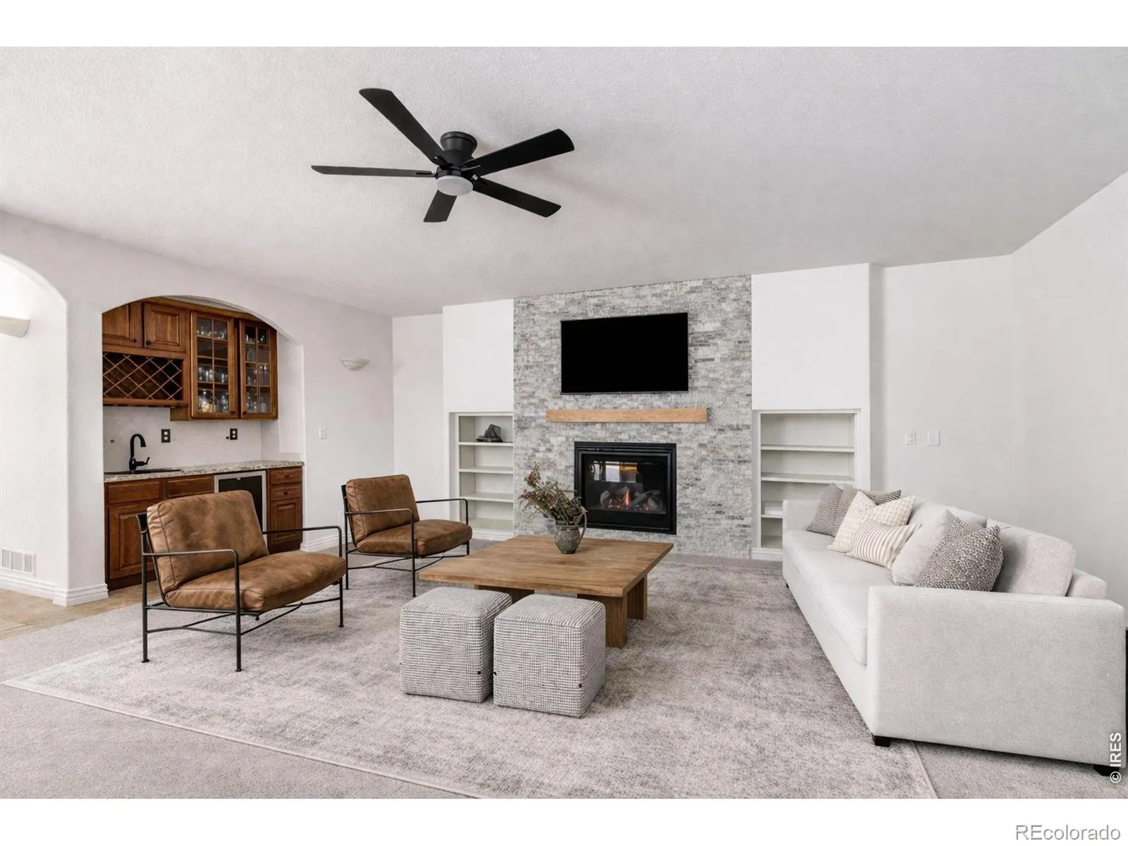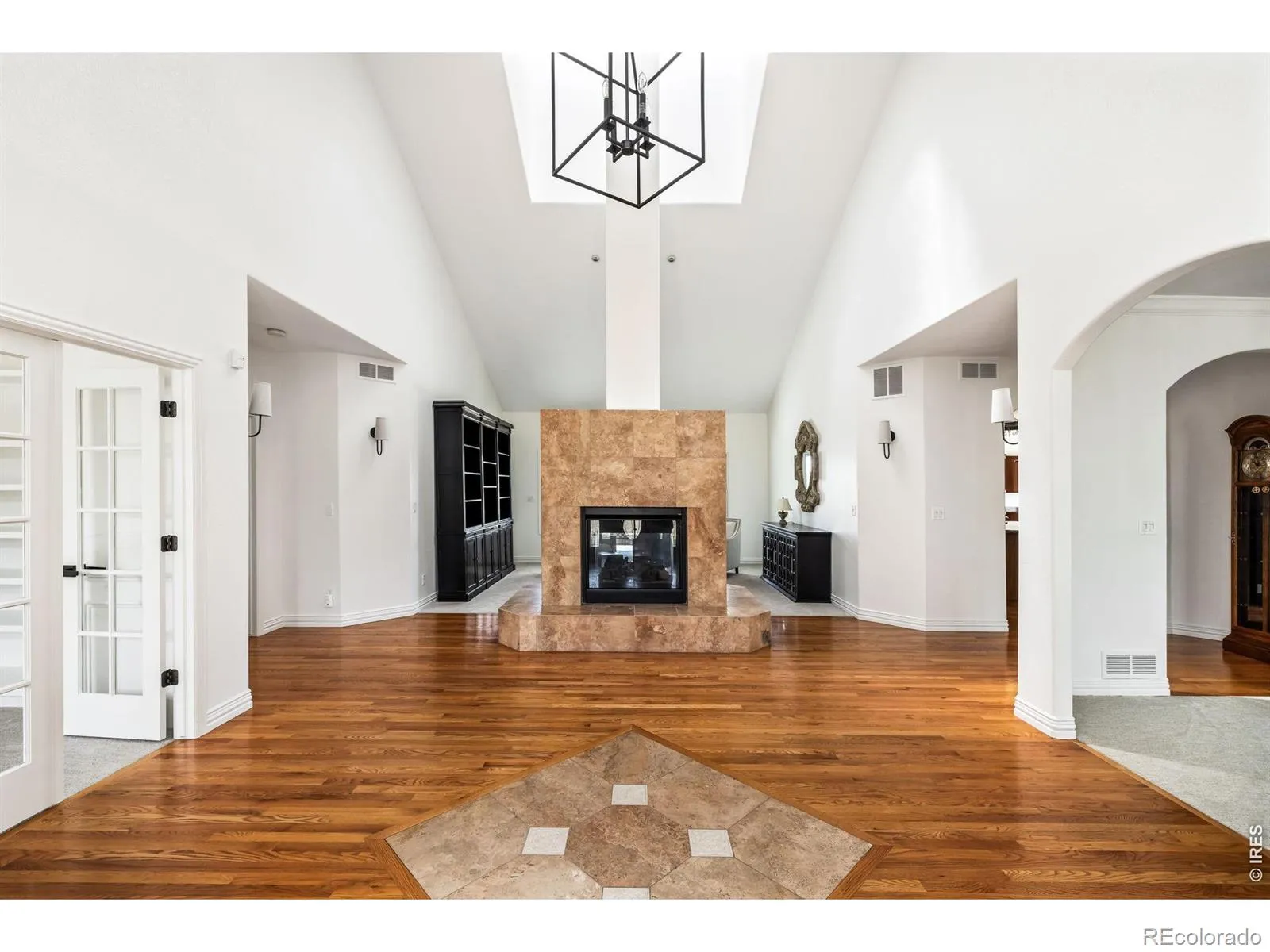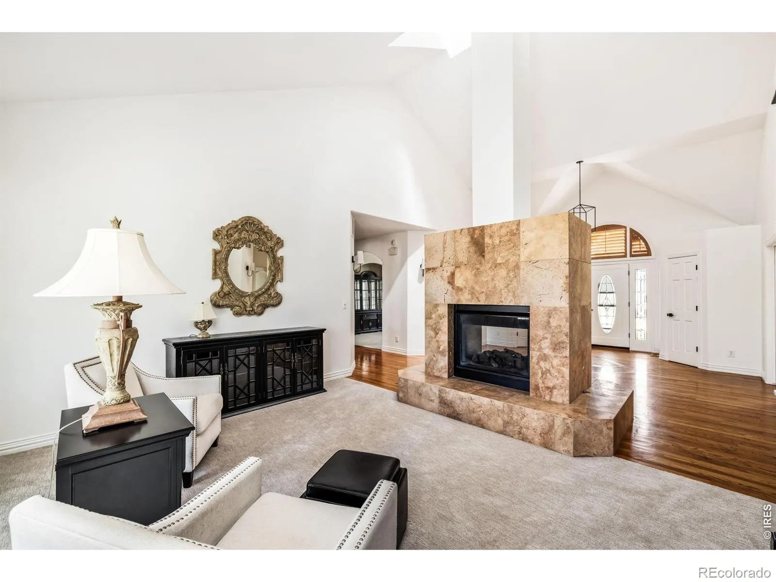 Experience exceptional lakefront living at 61 Blue Heron Drive, perfectly situated on nearly half an acre backing to a private lake with mature landscaping and breathtaking views. Enjoy lake access with non-motorized boats or electric trolling motors and fishing allowed. A grand entry with hardwood floors welcomes you and features a striking dual-sided fireplace that opens to the formal living room with access to a covered deck-ideal for indoor-outdoor entertaining. The main level also includes a private study with wainscoting, French doors, and built-ins, along with a formal dining room showcasing a tray ceiling, crown molding, custom archways, and a designer chandelier. The gourmet kitchen is equipped with a gas range, granite island with seating, abundant cabinetry, and an attached kitchen nook with deck access and built-ins. The adjacent family room offers a newly updated fireplace with custom stone, built-ins, and a wet bar with beverage fridge. The primary suite is a true retreat with a three-sided fireplace, private sitting area, deck access, and a spa-like five-piece bath with dual vanities, soaking tub, walk-in shower, and walk-in closet. An additional upstairs bedroom features an ensuite bath, plus a convenient laundry room. The finished basement is designed for entertaining and relaxation with a theater room (projector, screen, surround sound), additional bedrooms including one with ensuite bath, a hall 3/4 bath, and gym with patio access. A large storage room provides direct backyard access. Enjoy the incredible outdoor setting with covered deck and patio, and peaceful lake views. Additional features include newer roof, gutters, furnaces, A/C units, water heaters, exterior paint, new main-level carpet and paint, and a 4-car garage with newer doors.