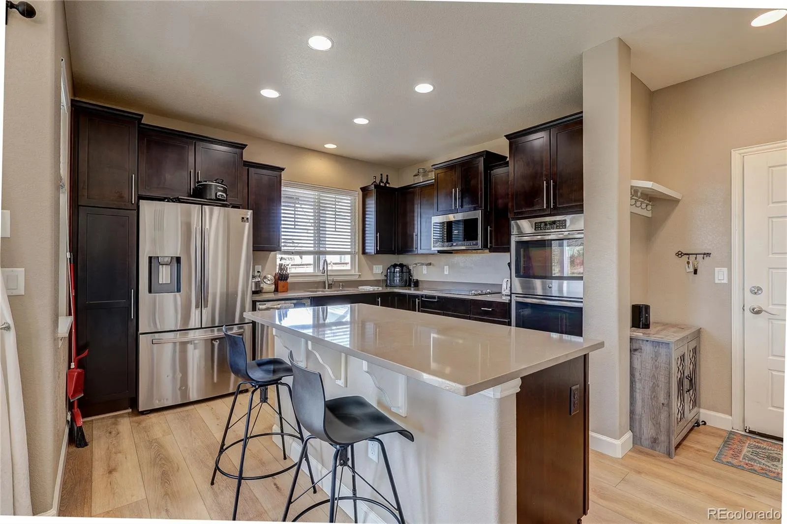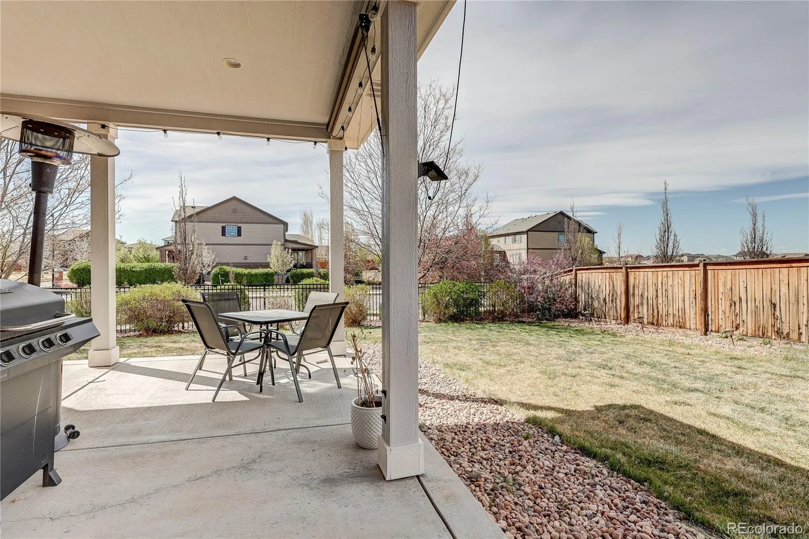 Discover the perfect blend of luxury and convenience in this beautifully updated 4 or 5 bedroom, 4-bath home, ideally situated on a corner lot in a green space cul-de-sac in the desirable Traditions private park section of the neighborhood. With a newer roof, exterior paint, and solar panels, this home offers great curb appeal and efficiency. Inside, you’ll find custom upgrades throughout, including a gourmet chefs kitchen with quartz countertops double oven and pantry. Updated plank flooring, and an open-concept layout that flows into a warm and inviting living space with a cozy gas fireplace. A/C and ceiling fans provide year-round comfort. The spacious primary suite is a true retreat, featuring a sitting area, luxurious 5-piece bath, and large walk-in closet. The finished basement adds additional living space with a full bath—perfect for guests, a gym, media room, or a non-conforming 5th bedroom. Enjoy outdoor living with covered front and back patios and a great yard. The 3-car tandem garage offers plenty of room for storage and toys. Conveniently located near E-470 with easy access to DIA and Buckley Space Force Base, plus neighborhood amenities including a pool and community center—this home truly has it all!