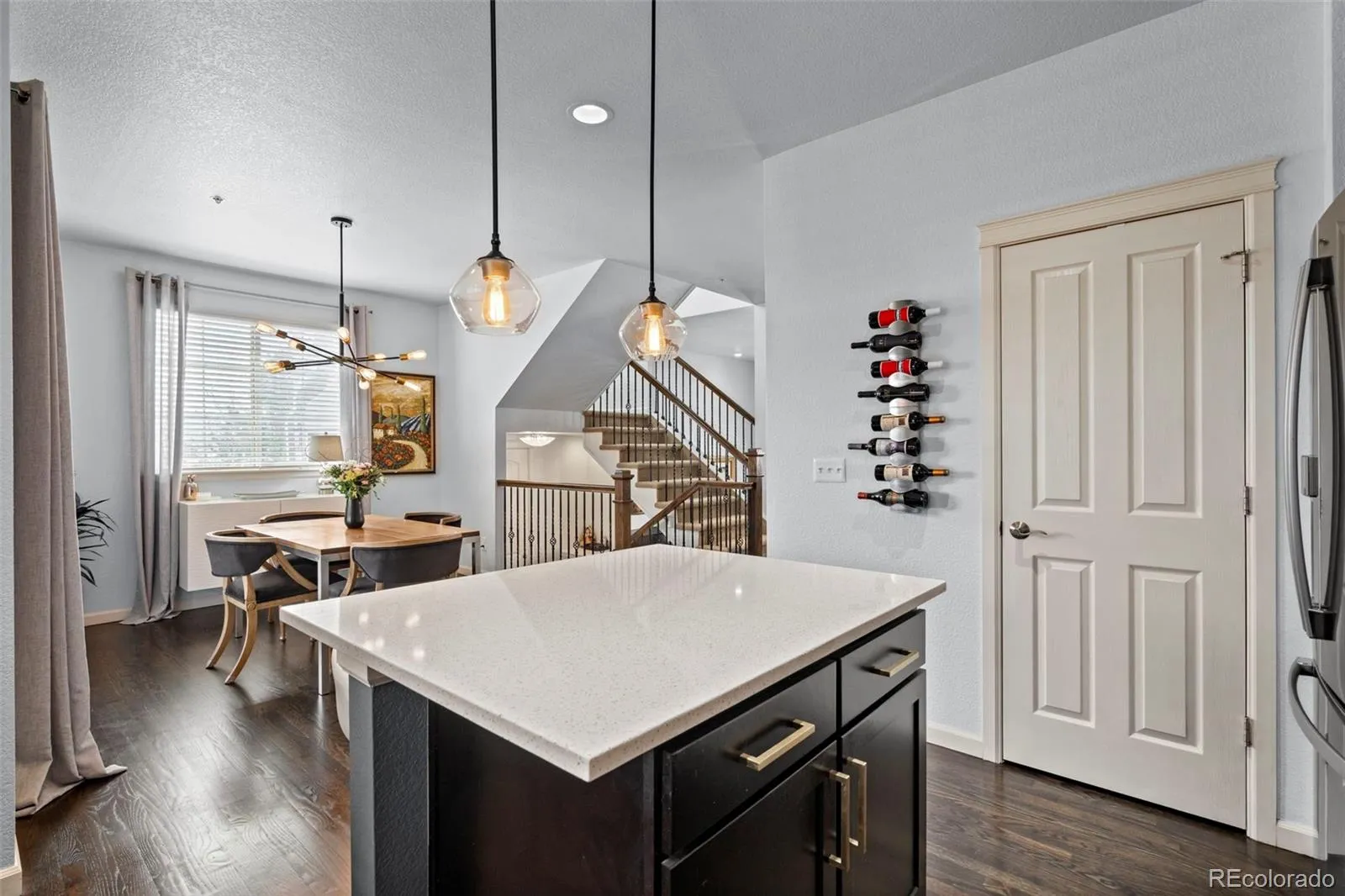 The kitchen is as functional as it is beautiful — espresso shaker cabinetry with brushed gold hardware, quartz countertops, subway tile backsplash, stainless steel appliances, and a center island with bar seating. A sculptural Edison-bulb chandelier anchors the dining room, which opens seamlessly to one of three private outdoor terraces, including an upper balcony with sweeping, unobstructed Front Range views.