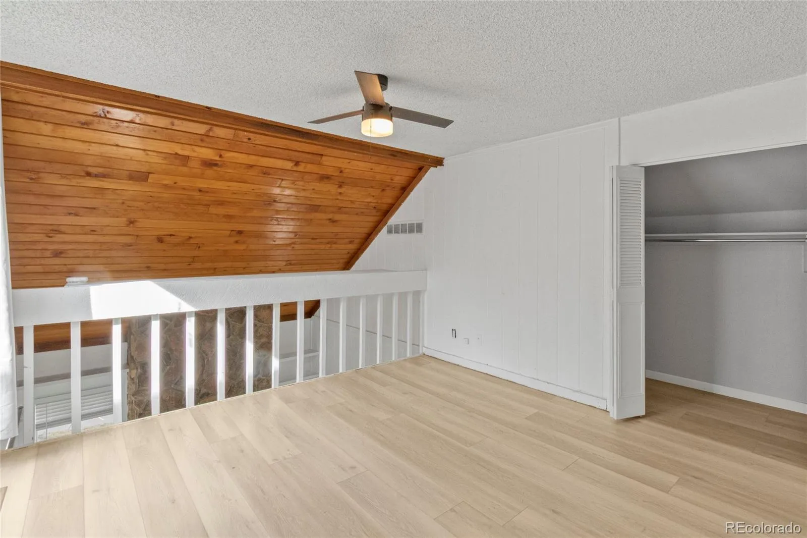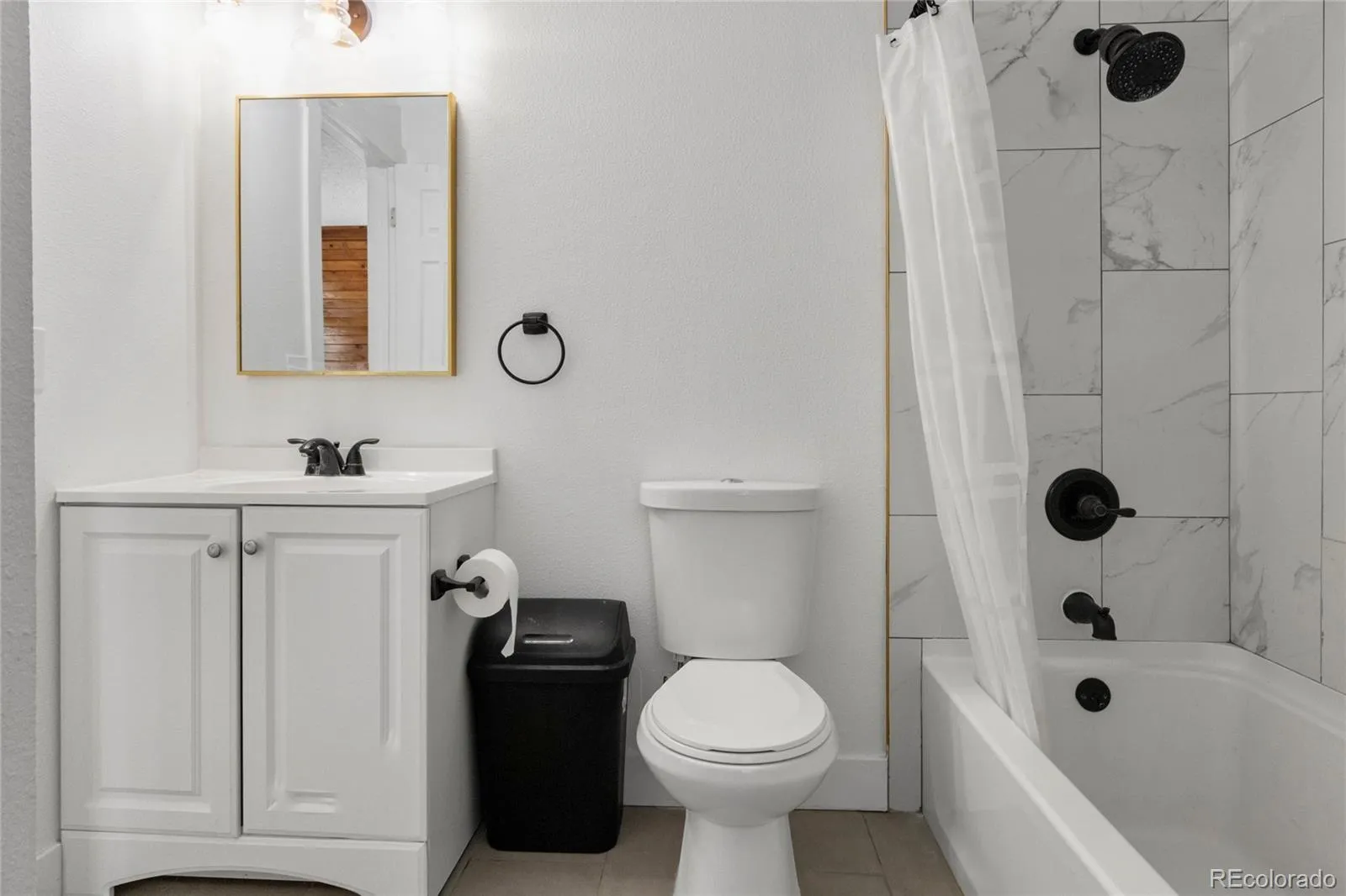 Both updated bathrooms feature large-format marble-look tile surrounds, gold-framed mirrors, and matte black fixtures for a clean, modern aesthetic. Upstairs, the primary loft-style bedroom includes new LVP flooring, a ceiling fan, private closet, and direct access to your upper balcony. The second bedroom offers plush carpet and a built-in desk and shelving system — perfect for a home office or guest suite.