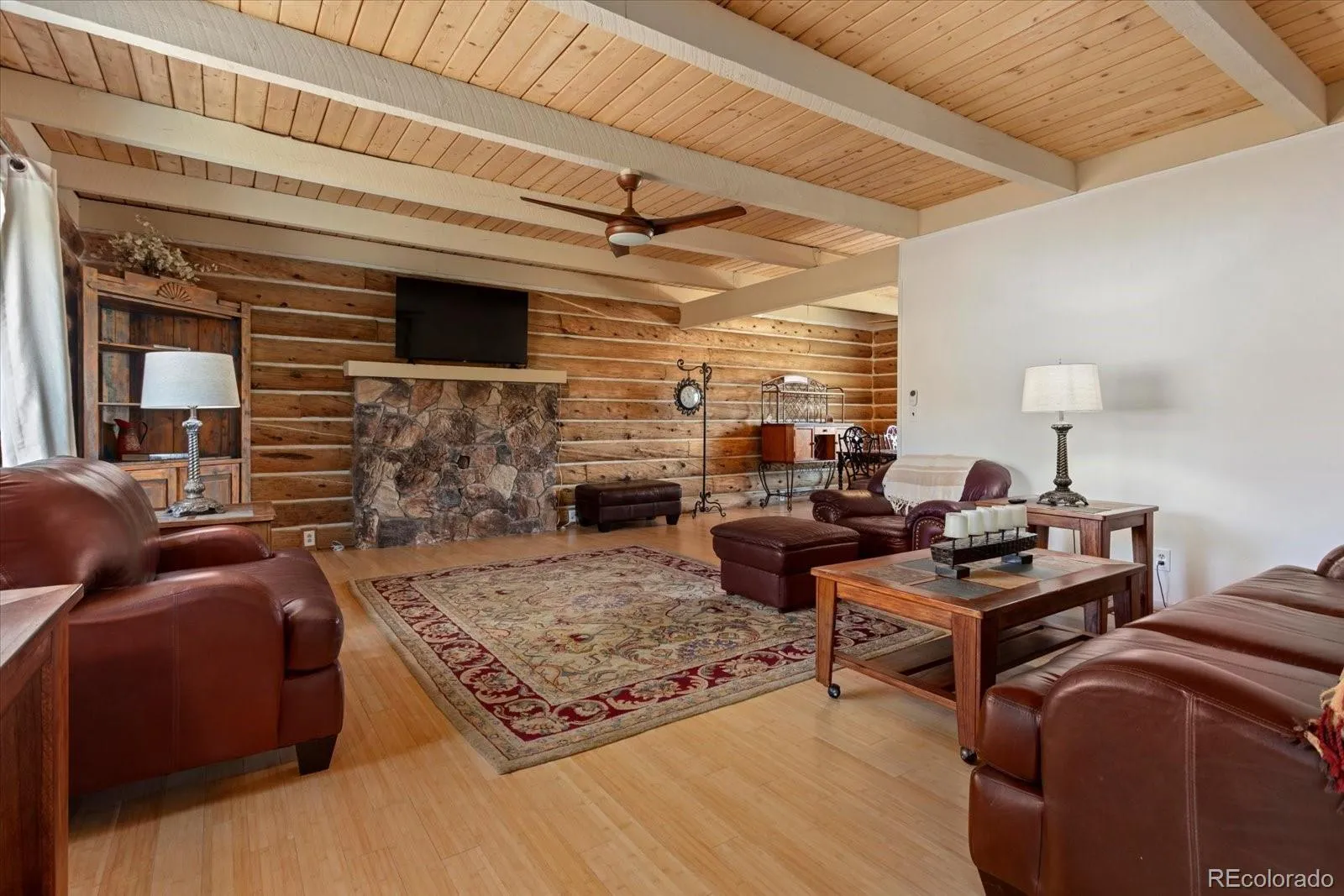 The heart of the home showcases classic log construction with exposed beams and tongue and groove ceilings, creating a warm, grounded mountain feel. Large windows bring in natural light and frame the surrounding views. The kitchen has been updated with light cabinetry, solid surface counters, and a central island, opening into the dining and living areas for a practical, easy flow.