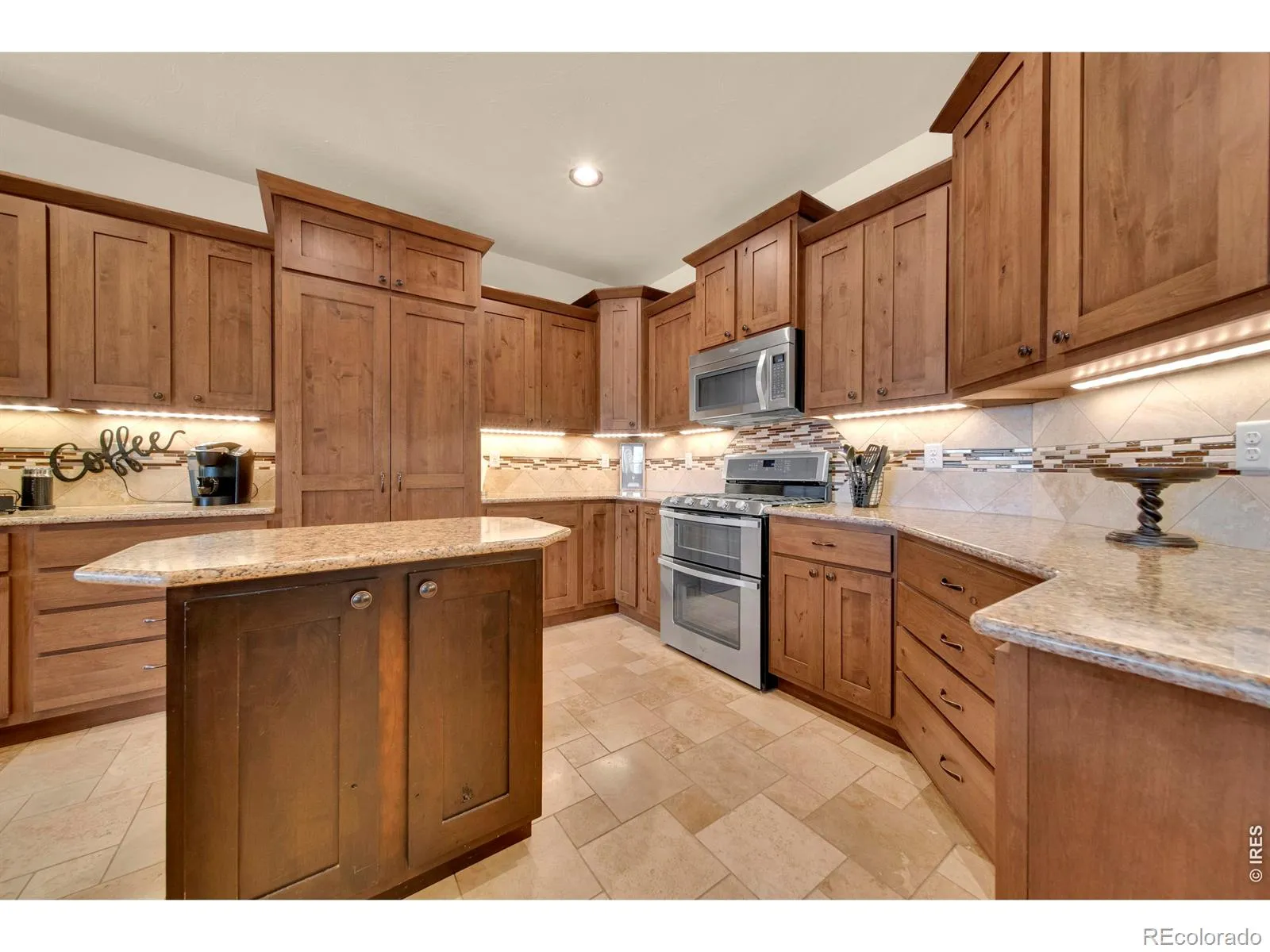 Stunning Custom Home with Shop & Exceptional Features! Beautiful open-concept home with upgrades throughout. Gourmet kitchen features island, walk-in pantry, breakfast bar, quartz countertops, travertine tile, and accent lighting. Spacious primary suite offers patio access, large walk-in closet, and luxurious bath with jetted tub and walk-in shower. Main level includes living room with gas fireplace, formal dining, office, additional suite, laundry/mudroom, and half bath. Finished basement features wet bar with full-size refrigerator, 2 additional suites, large family room, electric fireplace, and theater room. Mature landscaping with custom fence and stone pillars. Outdoor amenities include POOL, pond with waterfall, large patio, fire-pit, garden area, dog run, sprinkler system, and outdoor speakers. 40′ x 60′ shop with two 12′ overhead doors, heated 3-car garage, and storage shed with roll-up door.